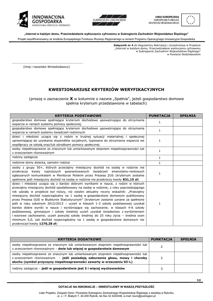„Internet w każdym domu. Przeciwdziałanie wykluczeniu cyfrowemu w Subregionie Zachodnim Województwa Śląskiego” Projekt współfinansowany ze środków Europejskiego Funduszu Rozwoju Regionalnego w ramach Programu Operacyjnego Innowacyjna Gospodarka Załącznik nr 4 do Regulaminu Rekrutacji i Uczestnictwa w Projekcie „Internet w każdym domu. Przeciwdziałanie wykluczeniu cyfrowemu w Subregionie Zachodnim Województwa Śląskiego” w Powiecie Wodzisławskim ……………………………………………………………………… (imię i nazwisko Wnioskodawcy) KWESTIONARIUSZ KRYTERIÓW WERYFIKACYJNYCH (proszę o zaznaczenie X w kolumnie o nazwie „Spełnia”, jeżeli gospodarstwo domowe spełnia kryterium przedstawione w tabelach) KRYTERIA PODSTAWOWE PUNKTACJA gospodarstwo domowe spełniające kryterium dochodowe upoważniające do otrzymania wsparcia w ramach systemu pomocy społecznej gospodarstwo domowe spełniające kryterium dochodowe upoważniające do otrzymania wsparcia w ramach systemu świadczeń rodzinnych dzieci i młodzież ucząca się z rodzin w trudnej sytuacji materialnej i społecznej uprawniającej do uzyskania stypendiów socjalnych, typowana do otrzymania wsparcia we współpracy ze szkołą oraz/lub ośrodkami pomocy społecznej osoby niepełnosprawne ze znacznym lub umiarkowanym stopniem niepełnosprawności lub z orzeczeniem równoważnym rodziny zastępcze SPEŁNIA 1 1 1 1 1 rodzinne domy dziecka, samotni rodzice 1 osoby z grupy 50+, których przeciętny miesięczny dochód na osobę w rodzinie nie przekracza kwoty najniższych gwarantowanych świadczeń emerytalno-rentowych ogłaszanych komunikatem w Monitorze Polskim przez Prezesa ZUS (kryterium zostanie spełnione jeśli miesięczny dochód na osobę w rodzinie nie przekroczy kwoty 831,15 zł) dzieci i młodzież ucząca się z bardzo dobrymi wynikami w nauce, z rodzin w których przeciętny miesięczny dochód opodatkowany na osobę w rodzinie, z roku poprzedzającego rok udziału w projekcie był niższy, niż ostatni aktualny roczny wskaźnik: „Przeciętny miesięczny dochód rozporządzalny na 1 osobę w gospodarstwie domowym publikowany przez Prezesa GUS w Biuletynie Statystycznym” (kryterium zostanie uznane za spełnione jeśli w roku szkolnym 2012/2013 – uczeń w klasach 1-3 szkoły podstawowej uzyskał bardzo dobre wyniki w nauce i wyróżniające się zachowanie; w klasach 4-6 szkoły podstawowej, gimnazjum i szkoły średniej uczeń uzyskał świadectwo z wyróżnieniem i wzorowe zachowanie; uczeń powyżej szkoły średniej do 25 roku życia – średnia ocen minimum 5,0, zaś dochód rozporządzalny na 1 osobę w gospodarstwie domowym nie przekroczył kwoty 1270,28 zł) 1 1 KRYTERIA DODATKOWE PUNKTACJA osoby niepełnosprawne ze znacznym lub umiarkowanym stopniem niepełnosprawności lub z orzeczeniem równoważnym – dwie lub więcej w gospodarstwie domowym 2 osoby niepełnosprawne ze znacznym lub umiarkowanym stopniem niepełnosprawności lub z orzeczeniem równoważnym - jeśli posiadają zaburzenia głosu, mowy i choroby słuchu (symbol przyczyny niepełnosprawności zawarty w orzeczeniu 03-L) 2 rodziny zastępcze – jeśli w gospodarstwie jest 3 i więcej wychowanków 3 SPEŁNIA 1/2 DOTACJE NA INNOWACJE – INWESTUJEMY W WASZĄ PRZYSZŁOŚĆ Lider Projektu: Związek Gmin i Powiatów Subregionu Zachodniego Województwa Śląskiego z siedzibą w Rybniku ul. J. i F. Białych 7, 44-200 Rybnik, tel./fax 32 4222446, e-mail: [email protected] „Internet w każdym domu. Przeciwdziałanie wykluczeniu cyfrowemu w Subregionie Zachodnim Województwa Śląskiego” Projekt współfinansowany ze środków Europejskiego Funduszu Rozwoju Regionalnego w ramach Programu Operacyjnego Innowacyjna Gospodarka dzieci i młodzież ucząca się z bardzo dobrymi wynikami w nauce, z rodzin w których przeciętny miesięczny dochód opodatkowany na osobę w rodzinie, z roku poprzedzającego rok udziału w projekcie był niższy, niż ostatni aktualny roczny wskaźnik: „Przeciętny miesięczny dochód rozporządzalny na 1 osobę w gospodarstwie domowym publikowany przez Prezesa GUS w Biuletynie Statystycznym” (kryterium zostanie uznane za spełnione jeśli w roku szkolnym 2012/2013 – uczeń w klasach 1-3 szkoły podstawowej uzyskał bardzo dobre wyniki w nauce i wyróżniające się zachowanie; w klasach 4-6 szkoły podstawowej, gimnazjum i szkoły średniej uczeń uzyskał świadectwo z wyróżnieniem i wzorowe zachowanie; uczeń powyżej szkoły średniej do 25 roku życia – średnia ocen minimum 5,0, zaś dochód rozporządzalny na 1 osobę w gospodarstwie domowym nie przekroczył kwoty 1270,28 zł) – jeśli w gospodarstwie domowym jest 2 i więcej dzieci z bardzo dobrymi wynikami w nauce dzieci i młodzież ucząca się z bardzo dobrymi wynikami w nauce, z rodzin w których przeciętny miesięczny dochód opodatkowany na osobę w rodzinie, z roku poprzedzającego rok udziału w projekcie był niższy, niż ostatni aktualny roczny wskaźnik: „Przeciętny miesięczny dochód rozporządzalny na 1 osobę w gospodarstwie domowym publikowany przez Prezesa GUS w Biuletynie Statystycznym” (kryterium zostanie uznane za spełnione jeśli w roku szkolnym 2012/2013 – uczeń w klasach 1-3 szkoły podstawowej uzyskał bardzo dobre wyniki w nauce i wyróżniające się zachowanie; w klasach 4-6 szkoły podstawowej, gimnazjum i szkoły średniej uczeń uzyskał świadectwo z wyróżnieniem i wzorowe zachowanie; uczeń powyżej szkoły średniej do 25 roku życia – średnia ocen minimum 5,0, zaś dochód rozporządzalny na 1 osobę w gospodarstwie domowym nie przekroczył kwoty 1270,28 zł) – jeśli uzyskało od 1 do 3 miejsca na olimpiadach wiedzy na szczeblu ogólnopolskim 2 3 Świadomy(a) odpowiedzialności karnej przewidzianej w art. 233 ustawy z dnia 6 czerwca 1997 r. Kodeks karny (Dz. U. Nr 88, poz. 553 z poźn. zm.) potwierdzam własnoręcznym podpisem prawdziwość danych zamie