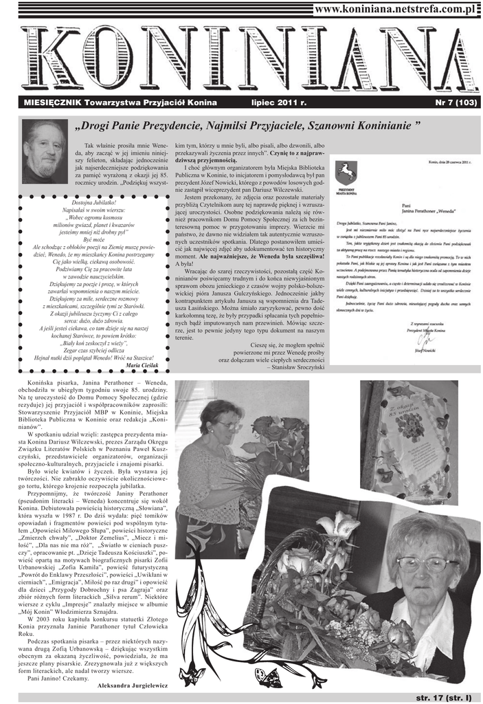 www.koniniana.netstrefa.com.pl MIESIĘCZNIK Towarzystwa Przyjaciół Konina lipiec 2011 r. Nr 7 (103) „Drogi Panie Prezydencie, Najmilsi Przyjaciele, Szanowni Koninianie ” Tak właśnie prosiła mnie Weneda, aby zacząć w jej imieniu niniejszy felieton, składając jednocześnie jak najserdeczniejsze podziękowania za pamięć wyrażoną z okazji jej 85. rocznicy urodzin. „Podziękuj wszystDostojna Jubilatko! Napisałaś w swoim wierszu: „Wobec ogromu kosmosu milionów gwiazd, planet i kwazarów jesteśmy mniej niż drobny pył” Być może Ale schodząc z obłoków poezji na Ziemię muszę powiedzieć, Wenedo, że my mieszkańcy Konina postrzegamy Cię jako wielką, ciekawą osobowość. Podziwiamy Cię za pracowite lata w zawodzie nauczycielskim. Dziękujemy za poezje i prozę, w których zawarłaś wspomnienia o naszym mieście. Dziękujemy za miłe, serdeczne rozmowy z mieszkańcami, szczególnie tymi ze Starówki. Z okazji jubileuszu życzymy Ci z całego serca: dużo, dużo zdrowia. A jeśli jesteś ciekawa, co tam dzieje się na naszej kochanej Starówce, to powiem krótko: „Biały koń zeskoczył z wieży”, Zegar czas szybciej odlicza Hejnał nutki dziś poplątał Wenedo! Wróć na Staszica! Maria Cieślak kim tym, którzy u mnie byli, albo pisali, albo dzwonili, albo przekazywali życzenia przez innych”. Czynię to z najpraw` dziwszą przyjemnością. I choć głównym organizatorem była Miejska Biblioteka Publiczna w Koninie, to inicjatorem i pomysłodawcą był pan prezydent Józef Nowicki, którego z powodów losowych godnie zastąpił wiceprezydent pan Dariusz Wilczewski. Jestem przekonany, że zdjęcia oraz pozostałe materiały przybliżą Czytelnikom aurę tej naprawdę pięknej i wzruszającej uroczystości. Osobne podziękowania należą się również pracownikom Domu Pomocy Społecznej za ich bezinteresowną pomoc w przygotowaniu imprezy. Wierzcie mi państwo, że dawno nie widziałem tak autentycznie wzruszonych uczestników spotkania. Dlatego postanowiłem umieścić jak najwięcej zdjęć aby udokumentować ten historyczny moment. Ale najważniejsze, że Weneda była szczęśliwa! A była! Wracając do szarej rzeczywistości, pozostałą część Koninianów poświęcamy trudnym i do końca niewyjaśnionym sprawom obozu jenieckiego z czasów wojny polsko-bolszewickiej pióra Janusza Gulczyńskiego. Jednocześnie jakby kontrapunktem artykułu Janusza są wspomnienia dra Tadeusza Łasińskiego. Można śmiało zaryzykować, pewno dość karkołomną tezę, że były przypadki spłacania tych popełnionych bądź imputowanych nam przewinień. Mówiąc szczerze, jest to pewnie jedyny tego typu dokument na naszym terenie. Cieszę się, że mogłem spełnić powierzone mi przez Wenedę prośby oraz dołączam wiele ciepłych serdeczności – Stanisław Sroczyński Konińska pisarka, Janina Perathoner – Weneda, obchodziła w ubiegłym tygodniu swoje 85. urodziny. Na tę uroczystość do Domu Pomocy Społecznej (gdzie rezyduje) jej przyjaciół i współpracowników zaprosili: Stowarzyszenie Przyjaciół MBP w Koninie, Miejska Biblioteka Publiczna w Koninie oraz redakcja „Koninianów”. W spotkaniu udział wzięli: zastępca prezydenta miasta Konina Dariusz Wilczewski, prezes Zarządu Okręgu Związku Literatów Polskich w Poznaniu Paweł Kuszczyński, przedstawiciele organizatorów, organizacji społeczno-kulturalnych, przyjaciele i znajomi pisarki. Było wiele kwiatów i życzeń. Była wystawa jej twórczości. Nie zabrakło oczywiście okolicznościowego tortu, którego krojenie rozpoczęła jubilatka. Przypomnijmy, że twórczość Janiny Perathoner (pseudonim literacki – Weneda) koncentruje się wokół Konina. Debiutowała powieścią historyczną „Słowiana”, która wyszła w 1987 r. Do dziś wydała: pięć tomików opowiadań i fragmentów powieści pod wspólnym tytułem „Opowieści Milowego Słupa”, powieści historyczne „Zmierzch chwały”, „Doktor Zemelius”, „Miecz i miłość”, „Dla nas nie ma róż”, „Światło w cieniach puszczy”, opracowanie pt. „Dzieje Tadeusza Kościuszki”, powieść opartą na motywach biograficznych pisarki Zofii Urbanowskiej „Zofia Kamila”, powieść futurystyczną „Powrót do Enklawy Przeszłości”, powieści „Uwikłani w cierniach”, „Emigracja”, Miłość po raz drugi” i opowieść dla dzieci „Przygody Dobrochny i psa Zagraja” oraz zbiór różnych form literackich „Silva rerum”. Niektóre wiersze z cyklu „Impresje” znalazły miejsce w albumie „Mój Konin” Włodzimierza Sznajdra. W 2003 roku kapituła konkursu statuetki Złotego Konia przyznała Janinie Parathoner tytuł Człowieka Roku. Podczas spotkania pisarka – przez niektórych nazywana drugą Zofią Urbanowską – dziękując wszystkim obecnym za okazaną życzliwość, powiedziała, że ma jeszcze plany pisarskie. Zrezygnowała już z większych form literackich, ale nadal tworzy wiersze. Pani Janino! Czekamy. Aleksandra Jurgielewicz str. 17 (str. I) Jubileusz konińskiej pisarki JUBILEUSZOWE IMPRESJE Z OKAZJI 35-LECIA OŚRODKA DPS SPISANE PRZEZ WENEDĘ ORAZ MAŁGORZATĘ WIATROWSKĄ I TOMASZA TARŁOWSKIEGO Pierwszy widok to smukłe topole powiewające srebrnymi listkami, połyskującymi w promieniach złotego słońca. Niżej bukszpany stojące rzędem jak wartownicy wzdłuż pięknej spacerowej alei. Wczesny wiosenny przymrozek sprawił, że nabrały one żółtawego koloru, jakby to już jesień próbowała ozłocić kiście krzewów. Trawnik, krótko przycięty, chwali się soczystą zielenią. Do wnętrza prowadzą gościnnie otwarte drzwi, błyszczące korytarze zapraszają do pokoi, które niczym muzea zawierają najmilszy dorobek i pamiątek całego życia pensjonariuszy. Prawie wszystkie okna wychodzą na balkony, przez które nieśmiało zagląda słońce. Po alejkach cicho suną wózki z mieszkańcami spragnionymi nasycić oczy zielenią. Malowniczy skwer służy do odpocz
