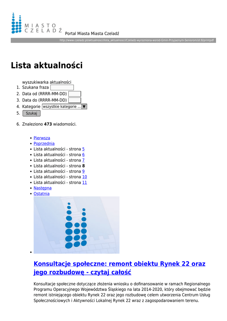 Portal Miasta Miasta Czeladź http://www.czeladz.pl/aktualnosci/lista_aktualnosci/Czeladz-wyrozniona-wsrod-Gmin-Przyjaznym-Seniorom/st:8/printpdf Lista aktualności wyszukiwarka aktualności 1. Szukana fraza 2. Data od (RRRR-MM-DD) 3. Data do (RRRR-MM-DD) 4. Kategorie wszystkie kategorie ... ▼ 5. Szukaj 6. Znaleziono 473 wiadomości. Pierwsza Poprzednia Lista aktualności - strona 5 Lista aktualności - strona 6 Lista aktualności - strona 7 Lista aktualności - strona 8 Lista aktualności - strona 9 Lista aktualności - strona 10 Lista aktualności - strona 11 Następna Ostatnia Konsultacje społeczne: remont obiektu Rynek 22 oraz jego rozbudowę - czytaj całość Konsultacje społeczne dotyczące złożenia wniosku o dofinansowanie w ramach Regionalnego Programu Operacyjnego Województwa Śląskiego na lata 2014-2020, który obejmować będzie remont istniejącego obiektu Rynek 22 oraz jego rozbudowę celem utworzenia Centrum Usług Społecznościowych i Aktywności Lokalnej Rynek 22 wraz z zagospodarowaniem terenu. 30 stycznia 2017 Konsultacje społeczne: remont obiektu Rynek 22 oraz jego rozbudowę - czytaj całość Kopalnia Kultury już fedruje - czytaj całość W niedzielę, 29 stycznia czeladzcy wydobywcy kultury odbyli swoją pierwszą szychtę w Kopalni Kultury. 30 stycznia 2017 Kopalnia Kultury już fedruje - czytaj całość Ostoja: pędzlem i igłą malowane - czytaj całość W środę, 1 lutego o godz. 10.30 w Miejskiej Bibliotece Publicznej w Czeladzi odbędzie się finisaż wystawy pensjonariuszy Środowiskowego Domu Samopomocy Ostoja. 30 stycznia 2017 Ostoja: pędzlem i igłą malowane - czytaj całość Zmiany siedzib w stałych obwodach głosowania - czytaj całość Zgodnie z Uchwałą Rady Miasta Czeladź Nr XXXII/428/2016 z 19.12.2016 r. nastąpiły zmiany siedzib Obwodowych Komisji Wyborczych. 30 stycznia 2017 Zmiany siedzib w stałych obwodach głosowania - czytaj całość „Harcerska Akcja Zima” zakończona! - czytaj całość 27 stycznia nastąpiło uroczyste ściągniecie flagi państwowej z harcerską lilijką, bowiem dobiegł końca drugi turnus półkolonii organizowanych przez Miasto Czeladź, Harcerski Krąg Seniorów oraz Miejski Ośrodek Sportu i Rekreacji. 29 stycznia 2017 „Harcerska Akcja Zima” zakończona! - czytaj całość Czeladź dla Seniora zaprasza w lutym - czytaj całość W lutym Miasto Czeladź zaprasza wszystkich czeladzkich seniorów na rozmaite ciekawe wydarzenia. 27 stycznia 2017 Czeladź dla Seniora zaprasza w lutym - czytaj całość Rocznica wyzwolenia Czeladzi - czytaj całość 27 stycznia obchodziliśmy 72. rocznicę wyzwolenia Czeladzi spod okupacji hitlerowskiej. O godz. 12.00 pod pomnikiem przy ul. Katowickiej odbyły się uroczystości upamiętniające to wydarzenie. 27 stycznia 2017 Rocznica wyzwolenia Czeladzi - czytaj całość Czeladzianie mogą wymienić się ciepłem - czytaj całość Wspaniała inicjatywa Fundacji Rób Dobro dotarła do Czeladzi! W środę, w studni na rynku starego miasta pojawił się wieszak "Wymiany Ciepła". 26 stycznia 2017 Czeladzianie mogą wymienić się ciepłem - czytaj całość Konsultacje społeczne: przebudowa i adaptacja warsztatów elektrycznych i transformatorowni zabytkowej kopalni SATURN - czytaj całość Konsultacje społeczne dotyczące złożenia wniosku o dofinansowanie w ramach Regionalnego Programu Operacyjnego Województwa Śląskiego na lata 2014-2020, który obejmować będzie przebudowę i adaptację dwóch obiektów: warsztatów elektrycznych i transformatorowni zabytkowej kopalni SATURN w Czeladzi na Centrum Usług Społecznościowych i Aktywności Lokalnej SATURN 25 stycznia 2017 Konsultacje społeczne: przebudowa i adaptacja warsztatów elektrycznych i transformatorowni zabytkowej kopalni SATURN - czytaj całość Miłośnicy białego szaleństwa - czytaj całość Zakończyły się dwa turnusy obozów narciarskich w Białce Tatrzańskiej, organizowanych przez Miejski Szkolny Związek Sportowy. 25 stycznia 2017 Miłośnicy białego szaleństwa - czytaj całość Pierwsza Poprzednia Lista aktualności - strona 5 Lista aktualności - strona 6 Lista aktualności - strona 7 Lista aktualności - strona 8 Lista aktualności - strona 9 Lista aktualności - strona 10 Lista aktualności - strona 11 Następna Ostatnia
