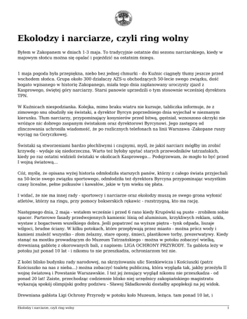 Ekolodzy i narciarze, czyli ring wolny Byłem w Zakopanem w dniach 1-3 maja. To tradycyjnie ostatnie dni sezonu narciarskiego, kiedy w majowym słońcu można się opalać i pojeździć na ostatnim śniegu. 1 maja pogoda była przepiękna, niebo bez jednej chmurki - do Kuźnic ciągnęły tłumy jeszcze przed wschodem słońca. Grupa około 300 działaczy AZS-u obchodzących 50-lecie swego związku, dość bogato wpisanego w historię Zakopanego, miała tego dnia zaplanowany uroczysty zjazd z Kasprowego, świętej góry narciarzy. Starsi panowie uprzedzili o tym stosownie wcześniej dyrektora TPN. W Kuźnicach niespodzianka. Kolejka, mimo braku wiatru nie kursuje, tabliczka informuje, że z zimowego snu obudziły się świstaki, a dyrektor Byrcyn poprzedniego dnia wyjechał w nieznanym kierunku. Tłum narciarzy, przypominający kosynierów przed bitwą, gęstniał, wznoszono okrzyki nie wróżące nic dobrego zaspanym świstakom oraz dyrektorowi Byrcynowi. Jego zastępcę od zlinczowania uchroniła wiadomość, że po rozlicznych telefonach na linii Warszawa -Zakopane ruszy wyciąg na Goryczkowej. Świstaki są stworzeniami bardzo płochliwymi i czujnymi, myśl, że jakiś narciarz mógłby im zrobić krzywdę - wydaje się niedorzeczna. Warto też byłoby spytać starych przewodników tatrzańskich, kiedy po raz ostatni widzieli świstaki w okolicach Kasprowego... Podejrzewam, że mogło to być przed I wojną światową… Cóż, myślę, że opisana wyżej historia odmłodziła starszych panów, którzy z całego świata przyjechali na 50-lecie swego związku sportowego, odmłodziła też dyrektora Byrcyna przypominając wszystkim czasy licealne, pełne psikusów i kawałów, jakie w tym wieku się płata. I widać, że nie ma innej rady - sportowcy i narciarze oraz ekolodzy muszą ze swego grona wyłonić atletów, którzy na ringu, przy pomocy bokserskich rękawic - rozstrzygną, kto ma rację. Następnego dnia, 2 maja - wstałem wcześnie i przed 6 rano kiedy Krupówki są puste - zrobiłem sobie spacer. Parterowe fasady przedwojennych kamienic lśnią od aluminium, krzykliwych reklam, szkła, wystaw z bogactwem wszelkiego dobra. Jeśli popatrzeć na wyższe piętra - tynk odpada, liszaje wilgoci, brudne ściany. W kilku potokach, które przepływają przez miasto - można prócz wody i kamieni znaleźć wszystko - złom żelazny, stare opony, śmieci, plastikowe torby, prezerwatywy. Kiedy stanąć na mostku prowadzącym do Muzeum Tatrzańskiego - można w potoku zobaczyć wielką, drewnianą gablotę z okorowanych bali, z napisem: LIGA OCHRONY PRZYRODY. Ta gablota leży w potoku już ponad 10 lat - i nikomu to nie przeszkadza, ochroniarzom też nie. Z kolei blisko budynku rady narodowej, na skrzyżowaniu ulic Sienkiewicza i Kościuszki (patrz Kościuszko na nas z nieba...) można zobaczyć toaletę publiczną, która wygląda tak, jakby przeżyła II wojnę światową i Powstanie Warszawskie. I też jej żenujący wygląd nikomu nie przeszkadza - od ponad 20 lat! Zaiste, przechodząc codziennie blisko niej urzędnicy zakopiańskiego magistratu wykazują spokój olimpijski godny podziwu - Sławoj Składkowski dostałby apopleksji na jej widok. Drewniana gablota Ligi Ochrony Przyrody w potoku koło Muzeum, leżąca. tam ponad 10 lat, i Ekolodzy i narciarze, czyli ring wolny 1 publiczna toaleta w centrum miasta, niszczejąca od ponad 20 lat - to dwa symbole dzisiejszego Zakopanego, nieco dziwnie kontrastujące z olimpijskimi pretensjami. I symboliczny obraz konfliktu między ochroniarzami, a władzami miasta. Las Vegas dla ubogich skrzyżowane z Disneylandem, bazarem i cepelią - to dość powszechne odczucie każdego, kto przespaceruje się po Krupówkach, centrum Zakopanego, zobaczy koszmarną estakadę i bazar pod Gubałówką. Mieszkałem w Zakopanem przez 15 lat, kocham góry i to osobliwe miasteczko pod Giewontem mimo, że z jego dawnej legendy nic już nie zostało, albo bardzo niewiele. Pamiętam czasy, kiedy z Tatr wyrzucono owce, by chronić rzadkie gatunki traw (!) - kilka lat wystarczyło, by pokazać, że była to błędna decyzja, że pewna ilość owiec jest po prostu potrzebna tatrzańskiej roślinności, a bardzo radykalne racje ochroniarzy warto jednak korygować mądrością starych górali. W czasach, kiedy mieszkałem w Zakopanem - plagą (stonka turystyczna - tak mawiano) - były szkolne wycieczki i pociągi pełne pijanych górników (sorry, tak było). Na początku lat 70. słynna afera budowlana - oto biorący łapówki urzędnicy rady narodowej spowodowali w krótkim czasie podwojenie liczby betonowych bunkrów z pokojami do wynajęcia, skutecznie szpecących miasto. Każdy większy zakład pracy w Polsce, w czasach, kiedy „Polska rosła w siłę, a ludzie żyli dostatniej” chciał mieć własny dom wczasowy w Zakopanem, im bardziej okazały tym lepiej. Mimo, że FWP był dobrym pomysłem, a wzdłuż całej południowej granicy kraju nie brakowało terenów z pięknymi widokami, gdzie owe domy wczasowe - gdyby stanęły - były by błogosławieństwem dla biednej gminy, a wczasowicze mieli by lepsze warunki do wypoczynku, niż w Zakopanem. W latach 1960 -1975 GOPR znosił z gór „turystów” w szpilkach bądź w garniturach; taternicy ostrzegali przed wspinaczką na ścianach, nad którymi na grani chodzą turyści, można było oberwać pustą butelką po wódce. W latach 1970 -75 rocznie ilość turystów, odwiedzających Zakopane sięgała liczby ok. 2 mln rocznie o wiele za dużo, jak na małe Tatry. Dziś ponoć sięga ok. 4 mln rocznie - co sprawia, że na górskich szlakach jest ruch jak na Marszałkowskiej (ciekawa forma wypoczynku...) i tylko patrzeć, jak przyroda górska zacznie doznawać zniszczeń nieodwracalnych. Co światlejsi postulowali w tamtych latach budowę drugiego Zakopanego – „Śnieżnika” - w okolicach Kłodzka. Ale pieniądze na ten cel okazały się bardziej potrzebne do budowy Huty Katowice. Dziennikarz, sportowiec, n