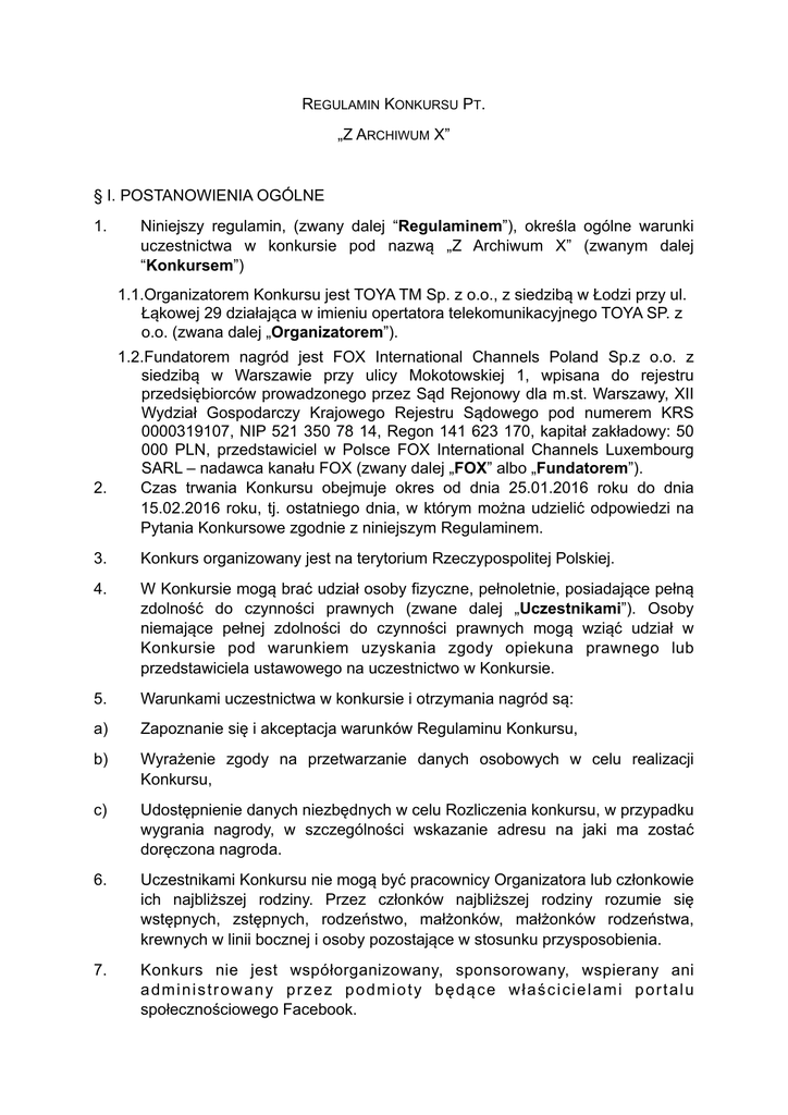 REGULAMIN KONKURSU PT. „Z ARCHIWUM X” § I. POSTANOWIENIA OGÓLNE 1. Niniejszy regulamin, (zwany dalej “Regulaminem”), określa ogólne warunki uczestnictwa w konkursie pod nazwą „Z Archiwum X” (zwanym dalej “Konkursem”) 1.1.Organizatorem Konkursu jest TOYA TM Sp. z o.o., z siedzibą w Łodzi przy ul. Łąkowej 29 działająca w imieniu opertatora telekomunikacyjnego TOYA SP. z o.o. (zwana dalej „Organizatorem”). 1.2.Fundatorem nagród jest FOX International Channels Poland Sp.z o.o. z siedzibą w Warszawie przy ulicy Mokotowskiej 1, wpisana do rejestru przedsiębiorców prowadzonego przez Sąd Rejonowy dla m.st. Warszawy, XII Wydział Gospodarczy Krajowego Rejestru Sądowego pod numerem KRS 0000319107, NIP 521 350 78 14, Regon 141 623 170, kapitał zakładowy: 50 000 PLN, przedstawiciel w Polsce FOX International Channels Luxembourg SARL – nadawca kanału FOX (zwany dalej „FOX” albo „Fundatorem”). 2. Czas trwania Konkursu obejmuje okres od dnia 25.01.2016 roku do dnia 15.02.2016 roku, tj. ostatniego dnia, w którym można udzielić odpowiedzi na Pytania Konkursowe zgodnie z niniejszym Regulaminem. 3. Konkurs organizowany jest na terytorium Rzeczypospolitej Polskiej. 4. W Konkursie mogą brać udział osoby fizyczne, pełnoletnie, posiadające pełną zdolność do czynności prawnych (zwane dalej „Uczestnikami”). Osoby niemające pełnej zdolności do czynności prawnych mogą wziąć udział w Konkursie pod warunkiem uzyskania zgody opiekuna prawnego lub przedstawiciela ustawowego na uczestnictwo w Konkursie. 5. Warunkami uczestnictwa w konkursie i otrzymania nagród są: a) Zapoznanie się i akceptacja warunków Regulaminu Konkursu, b) Wyrażenie zgody na przetwarzanie danych osobowych w celu realizacji Konkursu, c) Udostępnienie danych niezbędnych w celu Rozliczenia konkursu, w przypadku wygrania nagrody, w szczególności wskazanie adresu na jaki ma zostać doręczona nagroda. 6. Uczestnikami Konkursu nie mogą być pracownicy Organizatora lub członkowie ich najbliższej rodziny. Przez członków najbliższej rodziny rozumie się wstępnych, zstępnych, rodzeństwo, małżonków, małżonków rodzeństwa, krewnych w linii bocznej i osoby pozostające w stosunku przysposobienia. 7. Konkurs nie jest współorganizowany, sponsorowany, wspierany ani administrowany przez podmioty będące właścicielami portalu społecznościowego Facebook. 8. Konkurs zostanie ogłoszony w szczególności na stronie internetowej („Strona”) pod adresem www.toya.net.pl . § II. PRZEDMIOT KONKURSU 1. Przedmiotem zadania konkursowego jest udzielenie poprawnej odpowiedzi na Pytanie Zamknięte nr 1 i Pytanie Otwarte nr 2 („Pytania Konkursowe”): Jak nazywa się para agentów z serialu „Z Archiwum X” prezentowanego na kanale FOX? Fox Mulder i Dana Scully Bonnie i Clyde Harmon Rabb i Sarah MacKenzie 2. Czy wierzysz, że istnieje życie na innych planetach poza Ziemią? Przekonaj nas do swoich poglądów. Nagrodzimy najciekawsze odpowiedzi. 2. Uczestnik może udzielić odpowiedzi na Pytania Konkursowe tylko raz. Maksymalna ilość znaków ze spacjami na udzielenie odpowiedzi na Pytanie Otwarte to 500. 3. Po zakończeniu Konkursu, Komisja Konkursowa spośród uczestników, którzy odpowiedzą na Pytania Konkursowe, wybierze 11 laureatów: jednego laureata Nagrody Głównej i 10 laureatów Nagród Dodatkowych. 4. Podstawą do wyboru laureatów Nagród Konkursu przez komisję konkursową powołaną przez Organizatora oraz podstawą do przyznania Uczestnikom Nagród w Konkursie będzie poprawność odpowiedzi na pytanie zamknięte nr 1 oraz kreatywność odpowiedzi na pytanie nr 2 Pytanie Otwarte. § III. ZASADY UCZESTNICTWA W KONKURSIE 1. Do Konkursu zostaną zakwalifikowane wyłącznie Prace Konkursowe zgłoszone za pośrednictwem formularza konkursowego umieszczonego na stronie www.toya.net.pl 2. Zamieszczenie odpowiedzi na Pytania Konkursowe zgodnie z pkt. 1 powyżej, oznacza wyrażenie zgody na udział w Konkursie przez Uczestnika w szczególności zgodę na warunki Regulaminu. 3. Podawanie danych osobowych przez Uczestnika jest dobrowolne. 4. Warunkiem wydania nagrody jest przekazanie przez zwycięzcę, w ciągu 14 dni roboczych od wysłania stosownej wiadomości e-mail do Uczestnika przez Organizatora informacji niezbędnych do wypełnienia obowiązków podatkowych przez Fundatora, tj. w szczególności imię i nazwisko, adres zamieszkania oraz wskazać adres, na który ma zostać wysłana Nagroda oraz nr telefonu kontaktowego. 5. Każdy z uczestników konkursu zobowiązany jest podać prawdziwe dane osobowe oraz zamieścić oświadczenie o wyrażeniu zgody Uczestnika Konkursu na przetwarzanie wyżej wymienionych danych osobowych na potrzeby Konkursu. Zwycięzca nagrody głównej dodatkowo będzie zobowiązany podać dane niezbędne do prawidłowego rozliczenia podatku dochodowego od nagrody. 6. Wyłonienie laureatów Nagród Konkursowych nastąpi do 26.02.2016 roku. O wygranej decyduje Komisja Konkursowa. Wyniki Konkursu zostaną ogłoszone przez Komisję Konkursową na Stronie oraz poprzez wiadomość wysłaną przez Organizatora drogą elektroniczną na adresy e-mail podane przez Uczestników, na co każdy Uczestnik wyraża zgodę. § IV. KOMISJA KONKURSOWA 1. Celem zapewnienia prawidłowej organizacji i przebiegu Konkursu, Organizator powoła Komisję Konkursową („Komisja Konkursowa”). 2. Do zadań Komisji Konkursowej należy czuwanie nad prawidłowym przebiegiem Konkursu, a w szczególności: a) ocena nadesłanych odpowiedzi, wyłonienie laureatów Konkursu i zapewnienie przyznania nagród, b) zabezpieczenie zgodności wyłonienia laureatów Konkursu oraz przyznania nagród zgodnie z Regulaminem i zasadami pełnej rzetelności przeprowadzonych czynności, c) właściwe oznaczenie i zabezpieczenie danych osobowych laureatów Konkursu, d) podpisanie protokołu zawierającego opis czynności przyznania nagród w ramach Konkursu, e) udział w ewentualnym 