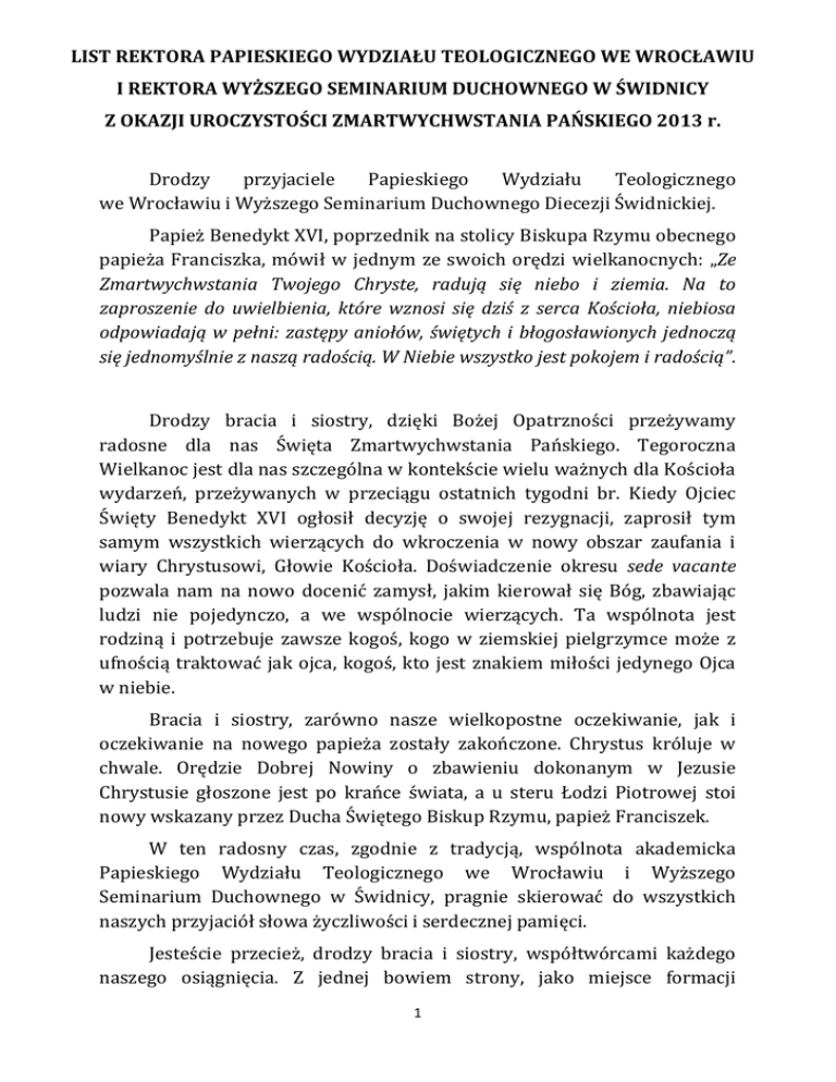 LIST REKTORA PAPIESKIEGO WYDZIAŁU TEOLOGICZNEGO WE WROCŁAWIU I REKTORA WYŻSZEGO SEMINARIUM DUCHOWNEGO W ŚWIDNICY Z OKAZJI UROCZYSTOŚCI ZMARTWYCHWSTANIA PAŃSKIEGO 2013 r. Drodzy przyjaciele Papieskiego Wydziału Teologicznego we Wrocławiu i Wyższego Seminarium Duchownego Diecezji Świdnickiej. Papież Benedykt XVI, poprzednik na stolicy Biskupa Rzymu obecnego papieża Franciszka, mówił w jednym ze swoich orędzi wielkanocnych: „Ze Zmartwychwstania Twojego Chryste, radują się niebo i ziemia. Na to zaproszenie do uwielbienia, które wznosi się dziś z serca Kościoła, niebiosa odpowiadają w pełni: zastępy aniołów, świętych i błogosławionych jednoczą się jednomyślnie z naszą radością. W Niebie wszystko jest pokojem i radością”. Drodzy bracia i siostry, dzięki Bożej Opatrzności przeżywamy radosne dla nas Święta Zmartwychwstania Pańskiego. Tegoroczna Wielkanoc jest dla nas szczególna w kontekście wielu ważnych dla Kościoła wydarzeń, przeżywanych w przeciągu ostatnich tygodni br. Kiedy Ojciec Święty Benedykt XVI ogłosił decyzję o swojej rezygnacji, zaprosił tym samym wszystkich wierzących do wkroczenia w nowy obszar zaufania i wiary Chrystusowi, Głowie Kościoła. Doświadczenie okresu sede vacante pozwala nam na nowo docenić zamysł, jakim kierował się Bóg, zbawiając ludzi nie pojedynczo, a we wspólnocie wierzących. Ta wspólnota jest rodziną i potrzebuje zawsze kogoś, kogo w ziemskiej pielgrzymce może z ufnością traktować jak ojca, kogoś, kto jest znakiem miłości jedynego Ojca w niebie. Bracia i siostry, zarówno nasze wielkopostne oczekiwanie, jak i oczekiwanie na nowego papieża zostały zakończone. Chrystus króluje w chwale. Orędzie Dobrej Nowiny o zbawieniu dokonanym w Jezusie Chrystusie głoszone jest po krańce świata, a u steru Łodzi Piotrowej stoi nowy wskazany przez Ducha Świętego Biskup Rzymu, papież Franciszek. W ten radosny czas, zgodnie z tradycją, wspólnota akademicka Papieskiego Wydziału Teologicznego we Wrocławiu i Wyższego Seminarium Duchownego w Świdnicy, pragnie skierować do wszystkich naszych przyjaciół słowa życzliwości i serdecznej pamięci. Jesteście przecież, drodzy bracia i siostry, współtwórcami każdego naszego osiągnięcia. Z jednej bowiem strony, jako miejsce formacji 1 teologicznej kapłanów i osób świeckich, jesteśmy uczelnią wyższą jak wszystkie inne, z drugiej strony jednak różnimy się od nich w sposób zasadniczy. Która bowiem uczelnia ma takie zaplecze oddanych przyjaciół? Za których wykładowców i studentów modli się tyle ludzi? Która uczelnia może liczyć na taką ofiarność i współpracę ludzi dobrej woli w całej Diecezji? Mamy tu na myśli niezwykłe grono ludzi: zaczynając od Biskupa Świdnickiego, ks. bpa prof. dr hab. Ignacego Deca, biskupa Adama Bałabucha, biskupa pomocniczego naszej diecezji, kapłanów naszego Kościoła świdnickiego, poprzez braci i siostry zakonne, aż do każdego z osobna wiernego i wszystkich ludzi dobrej woli, którzy stali się w ostatnich latach naszymi sympatykami. Dlatego to uważamy Was, drodzy bracia i siostry, za współtwórców dobrego dzieła, którym jest i ma być nasza uczelnia. Dlatego też chcemy dzielić się z Wami nowinami i słowami wdzięczności Papieski Wydział Teologiczny we Wrocławiu oraz jego filia, jaką jest Wyższe Seminarium Duchowne w Świdnicy, a także wszystkie ośrodki dydaktyczne przy nich utworzone, to uczelnie szczególne. Nasze gmachy są świadkami formacji Waszych kapłanów, duszpasterzy, katechetów, a także dziennikarzy, urzędników, nauczycieli, pracowników społecznych, pedagogów, psychologów. Absolwenci Papieskiego Wydziału Teologicznego, to ludzie wszechstronni, których spotkacie w każdym zakątku Dolnego Śląska, w różnych zawodach i instytucjach. Tutaj nie tylko uczy się zawodu, ale pogłębia się wiarę, która łączy nas wszystkich. Uczelnia teologiczna uczy o Bogu i o człowieku, o Biblii, o prawie naturalnym i kościelnym, o zasadach rządzących społeczeństwem, o filozofii, o moralności, o historii, o geografii wiary, poszerzając w ten sposób horyzonty umysłowe swoich studentów i pogłębiając ich refleksję nad światem. Dlatego pragniemy zachęcić wszystkich, którzy w tych dniach podejmują decyzję o wyborze własnej drogi - przyjdźcie i zobaczcie! Nasza oferta edukacyjna jest szeroka. Prowadzimy stacjonarne studia teologiczne dla kleryków w Świdnicy, studia stacjonarne dla świeckich we Wrocławiu i zaoczne w Świdnicy, studia podyplomowe i różne kursy. Uczymy także wielu języków obcych, których znajomość pomaga dziś nawiązać wiele udanych kontaktów z ludźmi z całego świata. A wszystko to dokonuje się w atmosferze wspólnoty wiary, tak poszukiwanej we współczesnym, zagubionym świecie. Nasze zasady są jasne, a cel zawsze ten sam: ewangelizacja nas samych i całego świata. 2 Chcemy poinformować, że macierzysta teologiczna uczelnia wrocławska wraz ze Studium Chrześcijańskiej Psychoterapii Integratywnej uruchamia od października nowy kierunek studiów: pedagogika. Stąd już dzisiaj kierujemy zaproszenie do wszystkich, którym leży na sercu kondycja młodego pokolenia, jego kształcenie i rozwój, by skorzystali z zaproszenia do studiowania tego kierunku studiów na naszej uczelni. Jest to okazja do formowania nowego pokolenia pedagogów chrześcijańskich, ludzi, dla których człowiek jest zintegrowaną całością psycho-fizyczną, umiłowanym Dzieckiem Boga, obdarzonym niezbywalną godnością, wartym wszelkiego wysiłku. Seminarium Duchowne w Świdnicy zaprasza natomiast w czerwcu wszystkich diecezjan, ale w sposób szczególny wszystkich członków Towarzystwa Przyjaciół WSD w Świdnicy, na pielgrzymkę Przyjaciół Seminarium do Świdnicy. Program tej Pielgrzymki zostanie podany niedługo na stronie internetowej naszego ośrodka oraz wysłany pocztą do wszystkich parafii naszej diecez