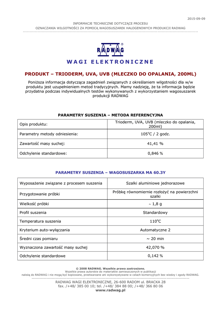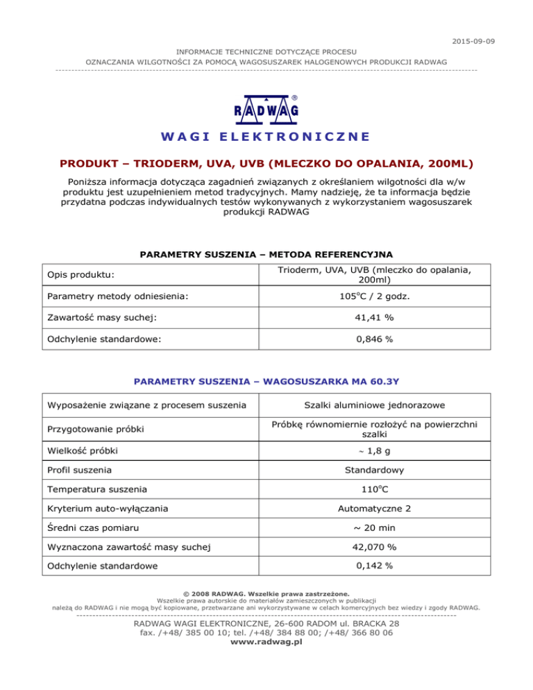 2015-09-09 INFORMACJE TECHNICZNE DOTYCZĄCE PROCESU OZNACZANIA WILGOTNOŚCI ZA POMOCĄ WAGOSUSZAREK HALOGENOWYCH PRODUKCJI RADWAG ---------------------------------------------------------------------------------------------------------------------------------- WAGI ELEKTRONICZNE PRODUKT – TRIODERM, UVA, UVB (MLECZKO DO OPALANIA, 200ML) Poniższa informacja dotycząca zagadnień związanych z określaniem wilgotności dla w/w produktu jest uzupełnieniem metod tradycyjnych. Mamy nadzieję, że ta informacja będzie przydatna podczas indywidualnych testów wykonywanych z wykorzystaniem wagosuszarek produkcji RADWAG PARAMETRY SUSZENIA – METODA REFERENCYJNA Trioderm, UVA, UVB (mleczko do opalania, 200ml) Opis produktu: Parametry metody odniesienia: 105oC / 2 godz. Zawartość masy suchej: 41,41 % Odchylenie standardowe: 0,846 % PARAMETRY SUSZENIA – WAGOSUSZARKA MA 60.3Y Wyposażenie związane z procesem suszenia Przygotowanie próbki Wielkość próbki Szalki aluminiowe jednorazowe Próbkę równomiernie rozłożyć na powierzchni szalki 1,8 g Profil suszenia Standardowy Temperatura suszenia Kryterium auto-wyłączania 110oC Automatyczne 2 Średni czas pomiaru ~ 20 min Wyznaczona zawartość masy suchej 42,070 % Odchylenie standardowe 0,142 % © 2008 RADWAG. Wszelkie prawa zastrzeżone. Wszelkie prawa autorskie do materiałów zamieszczonych w publikacji należą do RADWAG i nie mogą być kopiowane, przetwarzane ani wykorzystywane w celach komercyjnych bez wiedzy i zgody RADWAG. --------------------------------------------------------------------------------------------------------------------- RADWAG WAGI ELEKTRONICZNE, 26-600 RADOM ul. BRACKA 28 fax. /+48/ 385 00 10; tel. /+48/ 384 88 00; /+48/ 366 80 06 www.radwag.pl