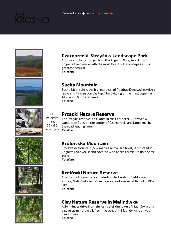 Wyszukaj miejsce: Natural beauty Czarnorzeki-Strzyżów Landscape Park The park includes the parts of the Pogórze Strzyżowskie and Pogórze Dynowskie with the most beautiful landscapes and of greatest natural Telefon: Sucha Mountain Sucha Mountain is the highest peak of Pogórze Dynowskie, with a radio and TV mast on the top. The building of the mast began in 1960 and TV programmes Telefon: ul. Pelczara 158, 38-420 Korczyna Prządki Nature Reserve The Prządki reserve is situated in the Czarnorzeki-Strzyżów Landscape Park, on the border of Czarnorzeki and Korczyna, by the road leading from Telefon: Królewska Mountain Królewska Mountain (554 metres above sea level) is situated in Pogórze Dynowskie and covered with beech forest. On its slopes, there Telefon: Kretówki Nature Reserve The Kretówki reserve is situated on the border of Jabłonica Polska, Malinówka and Orzechówka, and was established in 1959. Like Telefon: Cisy Nature Reserve in Malinówka A 20-minute drive from the centre of the town of Malinówka and a several-minute walk from the school in Malinówka is all you need to see Telefon: Cergowa Cergowa, rising majestically over Dukla and the neighbouring villages, is the highest and the most beautiful mountain in the Beskid Dukielski. It Telefon: Beskid Niski Beskid Niski this mountain range is considered by many to be the wildest in Poland. To the east, it borders Bieszczady Mountains, and stretches up to the Telefon: Jaśliska Landscape Park The Jaśliska Landscape Park was established in 1992 to provide protection for the source areas of the Jasiołka and Wisłok rivers. It is situated between Telefon: Kamień Kamień, at 859 metres above sea level, is the tallest mountain in the eastern and central part of the Beskid Niski. It has two peaks and is flat on the Telefon: Kamień nad Jaśliskami Nature Reserve The reserve was created in 2000 to protect the lay of the land typical for the Beskid Niski, and covers the area of over 300 ha. The protected area comprises Telefon: Piotruś Piotruś (727 metres above sea level) is a mountain in the eastern part of the Beskid Dukielski. Its name stems from the Romanian word pietros meaning Telefon: Millennium Reserve on Cergowa Mountain The reserve is situated on the northern slopes of Cergowa Mountain, in the villages of Cergowa and Jasionka. It was established in 1963 and covers Telefon: Przełom Jasiołki Nature Reserve The reserve was established in 1976 to protect the natural tree stands on the area of over 120 ha, covering the Jasiołka River valley between Ostra Mountain Telefon: Źródliska Jasiołki Nature Reserve The reserve was established in 1993 to protect the natural plant communities of the spring areas of the rivers Wisłok and Jasiołka. It is the biggest Telefon: The Magura National Park The Magura National Park is situated at the heart of the Beskid Niski and covers the source area of the Wisłoka river and the Magura Wątkowska range. Telefon: Sieniawa Lake Sieniawa Lake was created in 1978, when a dam was built on the Wisłok river in Sieniawa, on the 172.8th kilometre of its length. The dam is 174 metres Telefon: The valley of the Wisłok river Near Besko, the Wisłok river flows through a narrow, deep gorge, whose precipitous walls are up to 60 metres tall. It is one of the most beautiful river Telefon: Beskid Niski, Polska The Papal Trail The Papal Trail the trail has been traced out by the Local Tourist Organization called “Beskid Niski” (Low Beskid Mountains) in the Town Telefon: Świętego The Wooden Architecture Trail Wojciecha This trail runs through three provinces: Malopolska (Little 4, Krosno, Poland) Province, Podkarpackie (Subcarpathian) Province and Polska Śląskie (Silesian) Province. Telefon: www.visitkrosno.pl