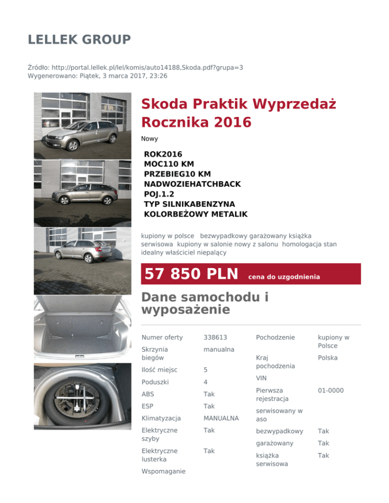 LELLEK GROUP Źródło: http://portal.lellek.pl/lel/komis/auto14188,Skoda.pdf?grupa=3 Wygenerowano: Piątek, 3 marca 2017, 23:26 Skoda Praktik Wyprzedaż Rocznika 2016 Nowy ROK2016 MOC110 KM PRZEBIEG10 KM NADWOZIEHATCHBACK POJ.1.2 TYP SILNIKABENZYNA KOLORBEŻOWY METALIK kupiony w polsce bezwypadkowy garażowany książka serwisowa kupiony w salonie nowy z salonu homologacja stan idealny właściciel niepalący 57 850 PLN cena do uzgodnienia Dane samochodu i wyposażenie Numer oferty 338613 Skrzynia biegów manualna Ilość miejsc 5 Poduszki 4 ABS Tak ESP Tak Klimatyzacja MANUALNA serwisowany w aso Elektryczne szyby Tak bezwypadkowy Tak garażowany Tak Elektryczne lusterka Tak książka serwisowa Tak Wspomaganie Pochodzenie kupiony w Polsce Kraj pochodzenia Polska VIN Pierwsza rejestracja 01-0000 kierownicy Tak I właściciel kupiony w salonie Tak tunning Handlowiec Roman Wołyński +48 77 540 11 34 zapytaj mobile +48 576 277 448 homologacja Tak stan idealny Tak właściciel niepalący Tak Charakterystyka spalania Komputer Tak Radioodtwarza cz Tak Immobilizer Tak cykl miejski 6.2 l/100km cykl pozamiejski 4.2 l/100km Centralny zamek Tak cykl mieszany 4.9 l/100km Tak emisja CO2 111 g/km Światła przeciwmgieln e Czujniki parkowania Tak Bluetooth Tak Światła LED Tak Alufelgi Tak Miejsce postoju Skoda Kędzierzyn tel 576 277 448 Gwarancja mechaniczna 24 miesięcy perforacja nadwozia 144 miesięcy Ubezpieczenie Ubezpieczenie dostępne Opis dodatkowy Kredyt Kredyt dostępny Samochód NOWY z Wyprzedaży Rocznika 2016 ! Samochód jest jeszcze w fabrycznych foliach ochronnych. Wersja wyposażenia: Ambition z pakietem AUDIO , radiem Bolero, kołem zapasowym. Silnik: 1.2 TSI 110 KM Skrzynia biegów - 6-cio stopniowa. PAKIET PRZEGLĄDÓW na 4 lata lub do 60 000km GRATIS !!! Pakiet przeglądów to obowiązkowe przeglądy (robocizna, oryginalne części i materiały eksploatacyjne zgodne z planem serwisowym) przez pierwsze 4 lata lub do osiągnięcia przebiegu 60 000 km. Zeskanuj kod, aby zobaczyć ofertę online Na wyposażeniu samochodu w zakresie bezpieczeństwa, funkcjonalności i komfortu znajduje się: Klimatyzacja Climatic Elektrycznie sterowane szyby z przodu i z tyłu Elektrycznie sterowane i podgrzewane lusterka zewnętrzne Stalowe obręcze kół 15” Poduszki powietrzne czołowe i boczne kierowcy i pasażera z przodu Kurtyny powietrzne Dezaktywacja czołowej poduszki powietrznej pasażera z przodu ESP z ABS, MSR, ASR, EDS i HBA ACS – system pokolizyjny Regulowana w dwóch płaszczyznach kolumna kierownicy Fotel kierowcy i pasażera regulowany na wysokość Asymetrycznie dzielone oparcie tylnej kanapy (60:40) TPM – Czujnik ciśnienia w kołach Centralny zamek ze zdalnym sterowaniem Czujniki parkowania z tyłu Trójramienna kierownica Wyświetlacz Maxi DOT Reflektory przeciwmgielne z przodu Podłokietnik z przodu ze schowkiem Ogrzewana szyba tylna Podpowiedź zmiany biegu Trzecie światło stopu Tylne światło przeciwmgielne Uchwyt na kwity parkingowe Uchwyty ISOFIX na zewnętrznych miejscach kanapy tylnej Ponadto samochód doposażony jest w: Koło zapasowe Radio Bolero Pakiet AUDIO który zawiera: Radio z kolorowym dotykowym wyświetlaczem Zestaw GSM Bluetooth ŠKODA Surround i dwa dodatkowe głośniki z tyłu Wielofunkcyjna skórzana kierownica z obsługą radia, komputera i telefonu GSM Funkcja EASY LIGHT ASSIST - czyli automat do świateł Przednie reflektory przeciwmgłowe z LED oraz oświetlenie tylnej tablicy rejestracyjnej w technologii LED Aluminiowe obręcze kół MATONE w kolorze srebrnym 15” Posiadamy na naszym magazynie dużo innych modeli marki Škoda Kontakt do sprzedawcy: Roman Wołyński tel: 576 277 448 Informacja nie stanowi oferty w rozumieniu art.66kc. Podane dane maja charakter wyłącznie informacyjny. ZAPIS TEN ZOSTAŁ ZAWARTY ZE WZGLĘDU NA MOŻLIWOŚĆ NIE ZAMIERZONYCH POMYŁEK Nota prawna Informacja nie stanowi oferty w rozumieniu art. 66 Kodeksu Cywilnego. Podane dane mają charakter wyłącznie informacyjny. Pełna informacja dostępna jest u handlowca. Sprzedający nie odpowiada za ewentualne błędy lub nieaktualność ogłoszenia.