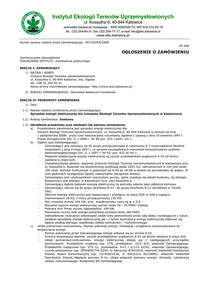 Instytut Ekologii Terenów Uprzemysłowionych ul. Kossutha 6, 40-844 Katowice Jednostka badawczo-rozwojowa KRS 0000058172; NIP 634-012-55-19 tel.: (32) 254-60-31, fax: (32) 254-17-17, e-mail: [email protected] www.ietu.katowice.pl Numer sprawy nadany przez zamawiającego: ZP/10/DFA/2008 ZP-400 OGŁOSZENIE O ZAMÓWIENIU Zamieszczanie obowiązkowe OGŁOSZENIE DOTYCZY: Zamówienia publicznego SEKCJA I: ZAMAWIAJĄCY 1) NAZWA I ADRES Instytut Ekologii Terenów Uprzemysłowionych ul. Kossutha 6, 40-844 Katowice, woj. śląskie tel. +48 32 254 60 31 Adres strony internetowej zamawiającego: http://www.ietu.katowice.pl/ 2) RODZAJ ZAMAWIAJĄCEGO: Jednostka badawczo-rozwojowa SEKCJA II: PRZEDMIOT ZAMÓWIENIA 1) Opis 1.1) Nazwa nadana zamówieniu przez zamawiającego: Sprzedaż energii elektrycznej dla Instytutu Ekologii Terenów Uprzemysłowionych w Katowicach. 1.2) Rodzaj zamówienia: Dostawy 1.3) Określenie przedmiotu oraz wielkości lub zakresu zamówienia: a) Przedmiotem zamówienia jest sprzedaż energii elektrycznej dla: Instytut Ekologii Terenów Uprzemysłowionych, ul. Kossutha 6, 40-844 Katowice w okresie od dnia 1 października 2008r. przez czas nieoznaczony rozumieniu zgodnie z ustawą z dnia 10 kwietnia 1997 r. Prawo energetyczne (Dz. U. z 2006 r. Nr 89 poz. 625 z późn. zm.). b) Ogólny opis Zamawiającego: Zamawiający jest zaliczany do III grupy przyłączeniowej w rozumieniu § 3 rozporządzenia Ministra Gospodarki z dnia 4 maja 2007 r. w sprawie szczegółowych warunków funkcjonowania systemu elektroenergetycznego (Dz. U. z 2007 r. Nr 93, poz. 623 ze zm.). Miejscem dostarczania energii elektrycznej są zaciski przekładników prądowych 6 kV od strony zasilania w stacji 626. Charakterystyka obiektu: budynek Instytutu Ekologii Terenów Uprzemysłowionych w Katowicach przy ul. Kossutha 6. Budynek ma powierzchnię użytkową około 5593 m2, zatrudnionych w nim jest około 100 osób. Instytut funkcjonuje w godzinach od 6:00 do 18:00 w dniach od poniedziałku do piątku. W tych godzinach występować będzie maksymalne obciążenie obiektu. Zamawiający jest użytkownikiem wieczystym gruntu, gdzie znajduje się obiekt budynku, do którego dostarczana jest energia, w Katowicach przy ulicy Kossutha 6. Zamawiający będzie nabywał energię elektryczną na potrzeby własne jako odbiorca końcowy. Zamawiający zalicza się do grupy taryfowej B-21 i do grupy taryfowej B-21 określonej w Taryfie OSD. Obecnie energia elektryczna jest dostarczana z przyłączy ze stacji GZE nr 626 o napięciu znamionowym 20 kV, o mocy przyłączeniowej 130 kW. Moc umowna wynosi 104 kW, przy współczynniku mocy tg φ ≤ 0,4. Aktualne zużycie energii elektrycznej wynosi około 20 - 25 MWh/ miesiąc. Pobrana moc Pmax wynosi odpowiednio: 104 kW. Planowana roczna ilość energii pobieranej wyniesie około 264 MWh. Jednosferowe rozliczanie zobowiązań (stałe ceny jednostkowe przez całą dobę) wynikających z tytułu zarówno sprzedaży energii elektrycznej jak i z tytułu dystrybucji energii elektrycznej odbywać się będzie według jednego, wspólnego układu pomiarowo – rozliczeniowego. c) Układ pomiarowo-rozliczeniowy. Pomiar pobranej energii. Instalacje i urządzenia wykorzystywane do dostarczania energii Pomiar pobieranej przez Zamawiającego energii odbywa się po stronie 6 kV. Granicę eksploatacji stanowi: zaciski przekładników prądowych 6 kV od strony zasiania w stacji 626 Układ pomiarowo-rozliczeniowy energii elektrycznej składa się z następujących przyrządów pomiarowych: Przekładniki prądowe typ: CTS, przekładnia: 10/5 A/A, własność Zamawiającego, Przekładniki napięciowe typ: VTS 12, przekładnia: 6√3 / 0,1√3 kV/kV, własność Zamawiającego, Licznik podstawowy typ: ZMD405CT44.0259, nr fabryczny 87441818, własność Vattenfall Distribution Poland, Moduł komunikacyjny typ: CU-M20/V22b, nr fabryczny 85238891, własność Vattenfall Distribution Poland, Napięcie pomiaru 6 kv, Układ połączeń pomiaru energii: Gwiazda, Lokalizacja układu rozliczeniowego: Rozdzielna SN Zamawiającego d) e) Wykonawca będzie zobowiązany do wskazania numeru telefonu, pod którym Zamawiający całodobowo będzie mógł zgłaszać przerwy w dostawie energii elektrycznej Operatorem Systemu Dystrybucyjnego dla Zamawiającego jest Vattenfall Distribution Poland S.A z siedzibą w Gliwicach. 1.4) WSPÓLNY SŁOWNIK ZAMÓWIEŃ (CPV) Słownik główny Główny przedmiot 40000000-2 1.5) Czy dopuszcza się złożenie oferty częściowej: nie 1.6) Czy dopuszcza się złożenie oferty wariantowej: nie 2) CZAS TRWANIA ZAMÓWIENIA LUB TERMIN WYKONANIA data rozpoczęcia 01.10.2008 SEKCJA III: INFORMACJE O CHARAKTERZE PRAWNYM, EKONOMICZNYM, FINANSOWYM I TECHNICZNYM 1) WARUNKI DOTYCZĄCE ZAMÓWIENIA Informacja na temat wadium (jeżeli dotyczy) Nie dotyczy 2) WARUNKI UDZIAŁU Opis warunków udziału w postępowaniu (z uwzględnieniem ich znaczenia, jeżeli dotyczy) oraz opis sposobu dokonywania oceny spełniania tych warunków: W postępowaniu mogą wziąć udział Wykonawcy, którzy spełniają następujące warunki: - posiadają uprawnienia do wykonywania działalności będącej przedmiotem postępowania, - posiadają niezbędną wiedzę i doświadczenie oraz dysponują potencjałem technicznym i osobami zdolnymi do wykonania zamówienia, - nie podlegają wykluczeniu z postępowania o udzielenie zamówienia zgodnie z art. 24 ustawy, - znajdują się w sytuacji ekonomicznej i finansowej zapewniającej wykonanie Zamówienia Ocena spełnienia ww. warunków wymaganych od Wykonawcy zostanie dokonana wg formuły: spełnia – nie spełnia na podstawie załączonych oświadczeń i dokumentów. Nie spełnienie chociażby jednego warunku, skutkować będzie wykluczeniem Wykonawcy z postępowania. Informacja o oświadczeniach i dokumentach, jakie mają dostarczyć wykonawcy w celu potwierdzenia spełniania warunków udziału w postępowaniu (jeżeli dotyczy): Wykonawca zobowiązany jest złożyć: a) Ofertę na