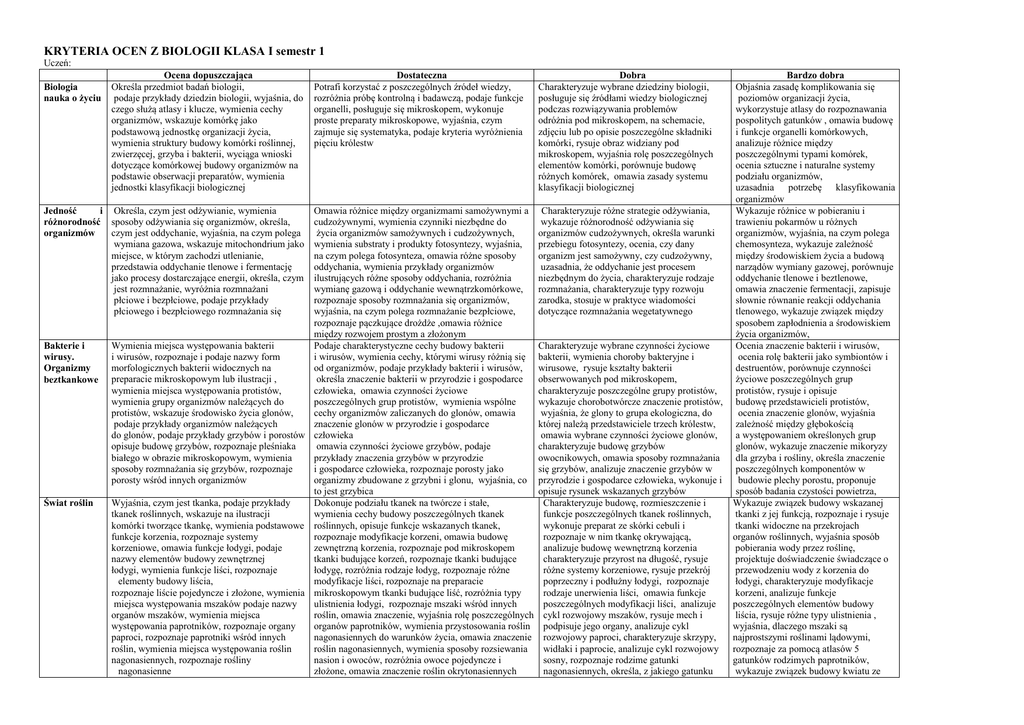 KRYTERIA OCEN Z BIOLOGII KLASA I semestr 1 Uczeń: Biologia nauka o życiu Ocena dopuszczająca Określa przedmiot badań biologii, podaje przykłady dziedzin biologii, wyjaśnia, do czego służą atlasy i klucze, wymienia cechy organizmów, wskazuje komórkę jako podstawową jednostkę organizacji życia, wymienia struktury budowy komórki roślinnej, zwierzęcej, grzyba i bakterii, wyciąga wnioski dotyczące komórkowej budowy organizmów na podstawie obserwacji preparatów, wymienia jednostki klasyfikacji biologicznej Dostateczna Potrafi korzystać z poszczególnych źródeł wiedzy, rozróżnia próbę kontrolną i badawczą, podaje funkcje organelli, posługuje się mikroskopem, wykonuje proste preparaty mikroskopowe, wyjaśnia, czym zajmuje się systematyka, podaje kryteria wyróżnienia pięciu królestw Jedność i Określa, czym jest odżywianie, wymienia różnorodność sposoby odżywiania się organizmów, określa, czym jest oddychanie, wyjaśnia, na czym polega organizmów wymiana gazowa, wskazuje mitochondrium jako miejsce, w którym zachodzi utlenianie, przedstawia oddychanie tlenowe i fermentację jako procesy dostarczające energii, określa, czym jest rozmnażanie, wyróżnia rozmnażani płciowe i bezpłciowe, podaje przykłady płciowego i bezpłciowego rozmnażania się Charakteryzuje różne strategie odżywiania, wykazuje różnorodność odżywiania się organizmów cudzożywnych, określa warunki przebiegu fotosyntezy, ocenia, czy dany organizm jest samożywny, czy cudzożywny, uzasadnia, że oddychanie jest procesem niezbędnym do życia, charakteryzuje rodzaje rozmnażania, charakteryzuje typy rozwoju zarodka, stosuje w praktyce wiadomości dotyczące rozmnażania wegetatywnego Bakterie i wirusy. Organizmy beztkankowe Charakteryzuje wybrane czynności życiowe bakterii, wymienia choroby bakteryjne i wirusowe, rysuje kształty bakterii obserwowanych pod mikroskopem, charakteryzuje poszczególne grupy protistów, wykazuje chorobotwórcze znaczenie protistów, wyjaśnia, że glony to grupa ekologiczna, do której należą przedstawiciele trzech królestw, omawia wybrane czynności życiowe glonów, charakteryzuje budowę grzybów owocnikowych, omawia sposoby rozmnażania się grzybów, analizuje znaczenie grzybów w przyrodzie i gospodarce człowieka, wykonuje i opisuje rysunek wskazanych grzybów Charakteryzuje budowę, rozmieszczenie i funkcje poszczególnych tkanek roślinnych, wykonuje preparat ze skórki cebuli i rozpoznaje w nim tkankę okrywającą, analizuje budowę wewnętrzną korzenia charakteryzuje przyrost na długość, rysuje różne systemy korzeniowe, rysuje przekrój poprzeczny i podłużny łodygi, rozpoznaje rodzaje unerwienia liści, omawia funkcje poszczególnych modyfikacji liści, analizuje cykl rozwojowy mszaków, rysuje mech i podpisuje jego organy, analizuje cykl rozwojowy paproci, charakteryzuje skrzypy, widłaki i paprocie, analizuje cykl rozwojowy sosny, rozpoznaje rodzime gatunki nagonasiennych, określa, z jakiego gatunku Świat roślin Omawia różnice między organizmami samożywnymi a cudzożywnymi, wymienia czynniki niezbędne do życia organizmów samożywnych i cudzożywnych, wymienia substraty i produkty fotosyntezy, wyjaśnia, na czym polega fotosynteza, omawia różne sposoby oddychania, wymienia przykłady organizmów ilustrujących różne sposoby oddychania, rozróżnia wymianę gazową i oddychanie wewnątrzkomórkowe, rozpoznaje sposoby rozmnażania się organizmów, wyjaśnia, na czym polega rozmnażanie bezpłciowe, rozpoznaje pączkujące drożdże ,omawia różnice między rozwojem prostym a złożonym Wymienia miejsca występowania bakterii Podaje charakterystyczne cechy budowy bakterii i wirusów, rozpoznaje i podaje nazwy form i wirusów, wymienia cechy, którymi wirusy różnią się morfologicznych bakterii widocznych na od organizmów, podaje przykłady bakterii i wirusów, preparacie mikroskopowym lub ilustracji , określa znaczenie bakterii w przyrodzie i gospodarce wymienia miejsca występowania protistów, człowieka, omawia czynności życiowe wymienia grupy organizmów należących do poszczególnych grup protistów, wymienia wspólne protistów, wskazuje środowisko życia glonów, cechy organizmów zaliczanych do glonów, omawia podaje przykłady organizmów należących znaczenie glonów w przyrodzie i gospodarce do glonów, podaje przykłady grzybów i porostów człowieka opisuje budowę grzybów, rozpoznaje pleśniaka omawia czynności życiowe grzybów, podaje białego w obrazie mikroskopowym, wymienia przykłady znaczenia grzybów w przyrodzie sposoby rozmnażania się grzybów, rozpoznaje i gospodarce człowieka, rozpoznaje porosty jako porosty wśród innych organizmów organizmy zbudowane z grzybni i glonu, wyjaśnia, co to jest grzybica Wyjaśnia, czym jest tkanka, podaje przykłady Dokonuje podziału tkanek na twórcze i stałe, tkanek roślinnych, wskazuje na ilustracji wymienia cechy budowy poszczególnych tkanek komórki tworzące tkankę, wymienia podstawowe roślinnych, opisuje funkcje wskazanych tkanek, funkcje korzenia, rozpoznaje systemy rozpoznaje modyfikacje korzeni, omawia budowę korzeniowe, omawia funkcje łodygi, podaje zewnętrzną korzenia, rozpoznaje pod mikroskopem nazwy elementów budowy zewnętrznej tkanki budujące korzeń, rozpoznaje tkanki budujące łodygi, wymienia funkcje liści, rozpoznaje łodygę, rozróżnia rodzaje łodyg, rozpoznaje różne elementy budowy liścia, modyfikacje liści, rozpoznaje na preparacie rozpoznaje liście pojedyncze i złożone, wymienia mikroskopowym tkanki budujące liść, rozróżnia typy miejsca występowania mszaków podaje nazwy ulistnienia łodygi, rozpoznaje mszaki wśród innych organów mszaków, wymienia miejsca roślin, omawia znaczenie, wyjaśnia rolę poszczególnych występowania paprotników, rozpoznaje organy organów paprotników, wymienia przystosowania roślin paproci, rozpoznaje paprotniki wśród innych nagona