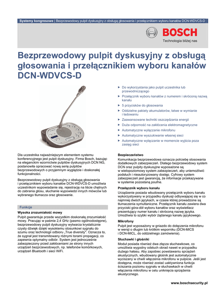 Systemy kongresowe | Bezprzewodowy pulpit dyskusyjny z obsługą głosowania i przełącznikiem wyboru kanałów DCN-WDVCS-D Technologia bliżej nas Bezprzewodowy pulpit dyskusyjny z obsługą głosowania i przełącznikiem wyboru kanałów DCN-WDVCS-D f Do wykorzystania jako pulpit uczestnika lub przewodniczącego f Przełącznik wyboru kanałów z numerem i skróconą nazwą kanału f 5 przycisków do głosowania f Oddzielne pakiety akumulatorów, łatwe w wymianie i ładowaniu f Zaawansowane techniki oszczędzania energii f Duża odporność na zakłócenia elektromagnetyczne f Automatyczne wyłączanie mikrofonu f Automatyczne wyszukiwanie własnej sieci f Automatyczne wyłączanie w momencie wyjścia poza zasięg sieci Dla uczestnika najważniejszym elementem systemu konferencyjnego jest pulpit dyskusyjny. Firma Bosch, bazując na eleganckim wzornictwie pulpitów dyskusyjnych DCN NG, postanowiła opracować nową serię pulpitów bezprzewodowych o przyjemnym wyglądzie i doskonałej funkcjonalności. Bezprzewodowy pulpit dyskusyjny z obsługą głosowania i przełącznikiem wyboru kanałów DCN-WDVCS-D umożliwia uczestnikom wypowiadanie się, rejestrację na liście chętnych do zabrania głosu, słuchanie wypowiedzi innych mówców lub wybranego tłumacza oraz głosowanie. Funkcje Wysoka zrozumiałość mowy Pulpit gwarantuje przede wszystkim doskonałą zrozumiałość mowy. Pracując w paśmie 2,4 GHz (pasmo ogólnodostępne), bezprzewodowy pulpit dyskusyjny wytwarza krystalicznie czysty dźwięk dzięki wysokiemu stosunkowi sygnału do szumu oraz technologii odbioru „True diversity". Oznacza to, że sygnał jest transmitowany różnymi torami propagacji, co zapewnia optymalny odbiór. System jest jednocześnie zabezpieczony przed zakłóceniami ze strony innych urządzeń bezprzewodowych, np. telefonów komórkowych, urządzeń Bluetooth i sieci WiFi. Bezpieczeństwo Komunikacja bezprzewodowa oznacza potrzebę stosowania dodatkowych zabezpieczeń. Dlatego bezprzewodowy system DCN oraz pulpity dyskusyjne wyposażone są w wielopoziomowy system zabezpieczeń, aby uniemożliwić podsłuch i nieautoryzowany dostęp. Cyfrowy system zabezpieczeń jest gwarancją, że informacje przekazywane w systemie pozostaną poufne. Przełącznik wyboru kanału Urządzenie posiada wbudowany przełącznik wyboru kanału wykorzystywany w przypadku dyskusji odbywającej się w co najmniej dwóch językach, w czasie której prowadzone są tłumaczenia symultaniczne. Przełącznik kanału zawiera dwa przyciski góra-dół wyboru kanałów oraz wyświetlacz prezentujący numer kanału i skróconą nazwę języka. Umożliwia to szybki wybór żądanego kanału językowego. Mikrofony Pulpit jest wyposażony w gniazdo do dołączenia mikrofonu w wersji o długim lub krótkim wsporniku (DCN-MICS i DCN-MICL, do oddzielnego zamówienia). Słuchawki i głośniki Moduł posiada również dwa złącza słuchawkowe, co umożliwia wygodny odsłuch obrad nawet w przypadku dużego hałasu. Aby zapobiec powstawaniu sprzężeń akustycznych, wbudowany głośnik jest automatycznie wyciszany w chwili włączenia mikrofonu w pulpicie. Jeśli jest dostępna, może również zostać uaktywniona funkcja ściszania poziomu sygnału w słuchawkach w chwili włączenia mikrofonu w celu uniknięcia sprzężenia akustycznego. www.boschsecurity.pl 2 | Bezprzewodowy pulpit dyskusyjny z obsługą głosowania i przełącznikiem wyboru kanałów DCN-WDVCS-D Obrzeża i przyciski Obrzeża modułu oferowane są w szeregu kolorach, co umożliwi dopasowanie do danego wystroju wnętrza (obrzeża DCN-DISR zamawia się oddzielnie). Pulpit może być wykorzystany jako pulpit uczestnika bądź przewodniczącego (przyciski przewodniczącego DCN-DISBCM należy zamówić oddzielnie). Moduł posiada 5 przycisków do głosowania. Żółte diody LED wokół przycisków do głosowania służą do potwierdzania oddanego głosu. Obsługa pakietu akumulatorów W systemie bezprzewodowym sprawą zasadniczą jest prosta obsługa zasilania akumulatorowego. Unikalną cechą bezprzewodowych pulpitów dyskusyjnych Bosch są oddzielne pakiety akumulatorów (DCN-WLIION, które zamawia się oddzielnie). Te pakiety akumulatorów litowojonowych mogą być wymienione dosłownie w ciągu kilku sekund, co zapewnia maksymalną elastyczność w tworzeniu harmonogramu ładowania. Elementy obsługi i wskaźniki Płyta czołowa • Wyświetlacz alfanumeryczny do wyboru kanału językowego prezentujący numer i skrót nazwy kanału • Przyciski wyboru kanałów w górę i w dół • 5 przycisków do głosowania z diodami LED do sygnalizacji oddanego głosu • Wskaźnik aktywności modułu / obecności uczestnika • Przycisk mikrofonowy ze świecącą na czerwono lub zielono diodą LED (pierścieniem): - kolor czerwony oznacza aktywny mikrofon - kolor zielony oznacza zaakceptowane żądanie zabrania głosu • Przyciski regulacji głośności sygnału słuchawkowego Płyta tylna • Wskaźnik braku zasięgu • Wskaźnik rozładowania akumulatora Podstawa • Zagłębiony przełącznik „deinicjalizacji” • Przełączniki wyboru trybu pracy (uczestnik, przewodniczący itp.) Połączenia z innymi urządzeniami • Gniazdo do odłączalnego mikrofonu • 2 złącza słuchawkowe 3,5 mm Wejście zasilania DC z modułu DCN-WPS (dostępne po odłączeniu pakietu akumulatorów) Dane techniczne Parametry elektryczne Pasmo przenoszenia Impedancja obciążenia słuchawek Moc wyjściowa Robert Bosch Sp. z o.o. Security Systems ul. Poleczki 3, 02-822 Warszawa Tel.: (+48) 22 715 41 00 / 01 Fax: (+48) 22 715 41 05 / 06 www.boschsecurity.pl [email protected] Parametry mechaniczne Montaż Wymiary (wys. x szer. x gł.) bez mikrofonu Masa bez akumulatora z akumulatorem Kolor (pokrywa) Kolor (podstawa) stołowy 61 x 190 x 160 mm 520 g 735 g srebrny (RAL9022) grafitowy (PH10736) Informacje do zamówień DCN-WDVCS-D Bezprzewodowy pulpit dyskusyjny z obsługą głosowania i przełączn