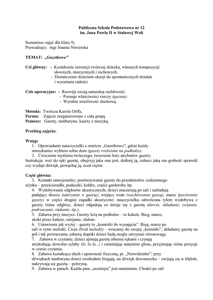 Publiczna Szkoła Podstawowa nr 12 im. Jana Pawła II w Stalowej Woli Scenariusz zajęć dla klasy 03 Prowadzący: mgr Joanna Niwierska TEMAT: „Gazetkowo” Cel główny: - Kształcenie inwencji twórczej dziecka, własnych kompozycji słownych, muzycznych i ruchowych. - Dostarczenie dzieciom okazji do spontanicznych działań i wyrażania radości. Cele operacyjne: - Rozwija swoją naturalną ruchliwość; - Poznaje właściwości rzeczy (gazeta); - Wyrabia wrażliwość słuchową. Metoda: Twórcza Karola Orffa, Forma: Zajęcie zorganizowane z całą grupą. Pomoce: Gazety, tamburyno, kasety z muzyką. Przebieg zajęcia: Wstęp: 1. Opowiadanie nauczycielki o mieście „Gazetkowo”, gdzie każdy mieszkaniec wybiera sobie dom (gazety rozłożone na podłodze). 2. Ćwiczenie myślenia twórczego; tworzenie listy atrybutów gazety; Instrukcja: weź do ręki gazetę, obejrzyj jaka ona jest, dotknij ją, zobacz jaką ma grubość sprawdź czy wydaje dźwięk, powąchaj ją, oceń ciężar. Część główna: 3. Kontakt emocjonalny; porównywanie gazety do przedmiotów codziennego użytku – prześcieradła, poduszki, kołdry, części garderoby itp. 4. Wydobywanie odgłosów akustycznych; dzieci maszerują po sali i naśladują padający deszcz (uderzanie w gazetę), wiejący wiatr (wachlowanie gazeą), marsz (pocieranie gazety) w części drugiej zagadki akustyczne; nauczycielka odwrócona tyłem wydobywa z gazety różne odgłosy, dzieci odgadują co dzieje się z gazetą (darcie, składanie, zwijanie, podrzucanie, stukanie, itp.). 5. Zabawa przy muzyce. Gazety leżą na podłodze – to kałuże. Bieg, marsz, skoki przez kałuże, omijanie, slalom. 6. Ustawienie jak wyżej – gazety to „komórki do wynajęcia”. Bieg, marsz po sali w rytm melodii. Cisza (brak melodii) – wracamy do swojej „komórki”; składamy gazetę na pół i tak powtarzamy zabawę dopóki dzieci będą mogły utrzymać równowagę. 7. Zabawa w czytanie; dzieci ujmują gazetę obiema rękami i czytają artykułując dowolne sylaby (le, la lu...) i zmieniając natężenie głosu, przyjmując różne pozycje w czasie czytania. 8. Zabawa kształcąca słuch i sprawność fizyczną, pt. „Niewidzialni”; przy dźwiękach tamburyna dzieci swobodnie biegają, na dźwięk dzwoneczka – zwijają się w kłębek, nakrywają się gazetą – peleryną. 9. Zabawa w parach. Każda para „zrośnięta” jest ramieniem. Chodzi po sali w rytm melodii i czyta gazetę. Najpierw swoją potem gazetę sąsiada – na krzyż. Bardzo ważne jest współdziałanie z partnerem i orientacja w przestrzeni, aby nie zderzyć się z inną parą. 10. Taniec z gazetą na głowie, na brzuchu, na plecach, na ręku itp. Tak samo w parach (jedna gazeta na parę). W tańcu trzymamy gazetę czołami, plecami, kolanami itp. Wszystkie polecenia wykonywane są w rytm melodii. Zakończenie: 11. Zwijamy gazetę w kulę (raz prawą raz lewą ręką). Swobodna zabawa kulami; kopanie, podrzucanie, toczenie, przeskakiwanie, rzucanie śnieżkami, jedzenie jabłka, kotek bawi się wełną itp. 12. Marsz w kole w rytm melodii. W środku koła kosz. Wrzucanie kul do kosza na każdą akcentowaną nutę. mgr Joanna Niwierska