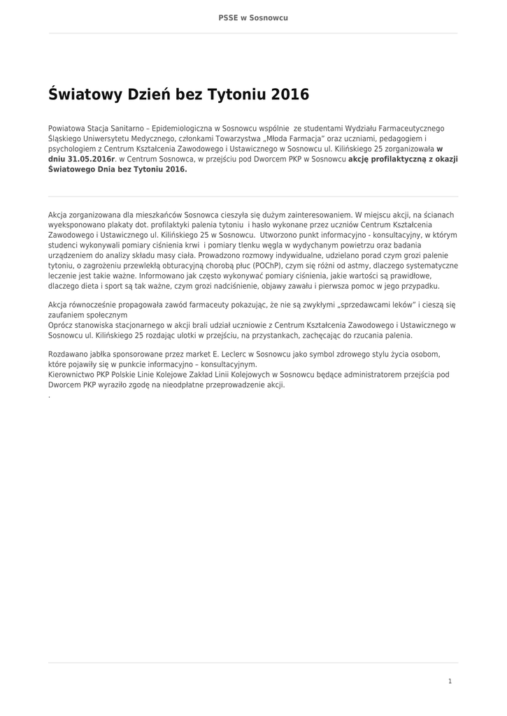 PSSE w Sosnowcu Światowy Dzień bez Tytoniu 2016 Powiatowa Stacja Sanitarno – Epidemiologiczna w Sosnowcu wspólnie ze studentami Wydziału Farmaceutycznego Śląskiego Uniwersytetu Medycznego, członkami Towarzystwa „Młoda Farmacja” oraz uczniami, pedagogiem i psychologiem z Centrum Kształcenia Zawodowego i Ustawicznego w Sosnowcu ul. Kilińskiego 25 zorganizowała w dniu 31.05.2016r. w Centrum Sosnowca, w przejściu pod Dworcem PKP w Sosnowcu akcję profilaktyczną z okazji Światowego Dnia bez Tytoniu 2016. Akcja zorganizowana dla mieszkańców Sosnowca cieszyła się dużym zainteresowaniem. W miejscu akcji, na ścianach wyeksponowano plakaty dot. profilaktyki palenia tytoniu i hasło wykonane przez uczniów Centrum Kształcenia Zawodowego i Ustawicznego ul. Kilińskiego 25 w Sosnowcu. Utworzono punkt informacyjno - konsultacyjny, w którym studenci wykonywali pomiary ciśnienia krwi i pomiary tlenku węgla w wydychanym powietrzu oraz badania urządzeniem do analizy składu masy ciała. Prowadzono rozmowy indywidualne, udzielano porad czym grozi palenie tytoniu, o zagrożeniu przewlekłą obturacyjną chorobą płuc (POChP), czym się różni od astmy, dlaczego systematyczne leczenie jest takie ważne. Informowano jak często wykonywać pomiary ciśnienia, jakie wartości są prawidłowe, dlaczego dieta i sport są tak ważne, czym grozi nadciśnienie, objawy zawału i pierwsza pomoc w jego przypadku. Akcja równocześnie propagowała zawód farmaceuty pokazując, że nie są zwykłymi „sprzedawcami leków” i cieszą się zaufaniem społecznym Oprócz stanowiska stacjonarnego w akcji brali udział uczniowie z Centrum Kształcenia Zawodowego i Ustawicznego w Sosnowcu ul. Kilińskiego 25 rozdając ulotki w przejściu, na przystankach, zachęcając do rzucania palenia. Rozdawano jabłka sponsorowane przez market E. Leclerc w Sosnowcu jako symbol zdrowego stylu życia osobom, które pojawiły się w punkcie informacyjno – konsultacyjnym. Kierownictwo PKP Polskie Linie Kolejowe Zakład Linii Kolejowych w Sosnowcu będące administratorem przejścia pod Dworcem PKP wyraziło zgodę na nieodpłatne przeprowadzenie akcji. . 1