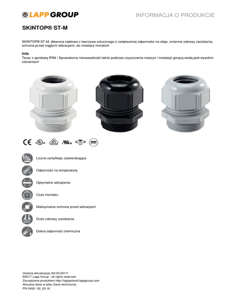 INFORMACJA O PRODUKCIE SKINTOP® ST-M SKINTOP® ST-M, dławnica kablowa z tworzywa sztucznego o zwiększonej odporności na oleje, zmienne zakresy zaciskania, ochrona przed ciągłymi wibracjami, do instalacji morskich Info Teraz z aprobatą IP69 ! Sprawdzona niezawodność także podczas czyszczenia maszyn i instalacji gorącą wodą pod wysokim ciśnieniem! Liczne certyfikaty zatwierdzające Odporność na temperaturę Optymalne odciążenie Czas montażu Maksymalna ochrona przed wibracjami Duże zakresy zaciskania Dobra odporność chemiczna Ostania aktualizacja (03.03.2017) ©2017 Lapp Group - all rights reserved. Zarządzanie produktem http://lapppoland.lappgroup.com Aktualne dane w pliku Dane techniczne. PN 0456 / 02_03.16 INFORMACJA O PRODUKCIE SKINTOP® ST-M Korzyści Podwyższona odporność na oleje dla maksymalnej niezawodności Zabezpieczenie przed ciągłymi wibracjami Duże, zmienne zakresy zaciskania Optymalne odciążenie przewodu Różnorodne akcesoria (np. wielokrotne wkłady uszczelniające) Zakres zastosowania Do użytku wszędzie tam, gdzie wiele kabli lub drutów trzeba bezpiecznie wprowadzić do obudowy, zajmując jak najmniej miejsca Budowa maszyn i aparatury przemysłowej Fotowoltaika Technika automatyzacji Instalacje morskie i budowa statków Normy i aprobaty UL file no. E79903 GGVS: TÜ.EGG.020-95 Budowa produktu Metryczny gwint przyłączeniowy zgodny z DIN EN 60423 Bazowe informacje techniczne DIN IEC 62444 Uwaga Pasujące akcesoria, patrz SKINTOP® z gwintem metrycznym - akcesoria Przeciwnakrętki w grupie SKINTOP® GMP-GL-M SKINTOP® ST(R) M ISO z bardzo długim gwintem przyłączeniowym Wersja SKINTOP® ST(R) M ISO z dłuższym gwintem przyłączeniowym, patrz tabela nie posiada aprobaty DNV Dane techniczne Klasyfikacja: ETIM 5.0 Class-ID: EC000441 Opis klasy ETIM 5.0: Dławnica kablowa Uwaga: Wymiary montażowe i momenty dokręcania: patrz tabela T21 Rozmiary M 40 x 1,5 do M 63 x 1,5 z O-ringiem Kolor: RAL 7001 srebrnoszary RAL 7035 jasnoszary RAL 9005 czarny/odporny na działanie promieniowania UV Materiał: Korpus: poliamid Uszczelnienie: CR Badania: GGVS: TÜ.EGG.020-95 Stopień ochrony: IP 68 - 5 bar IP 69 Zakres temperatury: Połączenia nieruchome: od -40°C do +100°C Połączenia ruchome: od -20°C do +100°C Ostania aktualizacja (03.03.2017) ©2017 Lapp Group - all rights reserved. Zarządzanie produktem http://lapppoland.lappgroup.com Aktualne dane w pliku Dane techniczne. PN 0456 / 02_03.16 INFORMACJA O PRODUKCIE SKINTOP® ST-M Wskazówka Fotografie nie mogą być używane do wymiarowania oraz nie stanowią szczegółowego odwzorowania przedstawionych produktów. * Podane ceny to ceny netto bez podatku VAT i dodatkowych opłat. Sprzedaż klientom biznesowym. Ostania aktualizacja (03.03.2017) ©2017 Lapp Group - all rights reserved. Zarządzanie produktem http://lapppoland.lappgroup.com Aktualne dane w pliku Dane techniczne. PN 0456 / 02_03.16 Powered by TCPDF (www.tcpdf.org) Oznaczenie produktu/rozmiar Zakres dławionych średnic ØF [mm] Rozmiar klucza SW w mm Długość całkowita C [mm] Długość gwintu [mm] SKINTOP® ST-M srebrnoszary 53111000 M 12 x 1,5 3,5 - 7 15 30 8 53111010 M 16 x 1,5 4,5 - 10 19 34 8 53111020 M 20 x 1,5 7 - 13 25 37 9 53111030 M 25 x 1,5 10 - 17 30 40 10 53111040 M 32 x 1,5 11 - 21 36 47 10 53111050 M 40 x 1,5 19 - 28 46 52 10 53111060 M 50 x 1,5 27 - 35 55 62 12 53111070 M 63 x 1,5 34 - 45 66 71 12 53111200 M 12 x 1,5 3,5 - 7 15 30 8 53111210 M 16 x 1,5 4,5 - 10 19 34 8 53111220 M 20 x 1,5 7 - 13 25 37 9 53111230 M 25 x 1,5 10 - 17 30 40 10 53111240 M 32 x 1,5 11 - 21 36 47 10 53111250 M 40 x 1,5 19 - 28 46 52 10 53111260 M 50 x 1,5 27 - 35 55 62 12 53111270 M 63 x 1,5 34 - 45 66 71 12 53111400 M 12 x 1,5 3,5 - 7 15 30 8 53111410 M 16 x 1,5 4,5 - 10 19 34 8 53111420 M 20 x 1,5 7 - 13 25 37 9 53111430 M 25 x 1,5 10 - 17 30 40 10 53111440 M 32 x 1,5 11 - 21 36 47 10 53111450 M 40 x 1,5 19 - 28 46 52 10 53111460 M 50 x 1,5 27 - 35 55 62 12 53111470 M 63 x 1,5 34 - 45 66 71 12 SKINTOP® ST-M Ostania aktualizacja (03.03.2017) ©2017 Lapp Group - all rights reserved. Zarządzanie produktem http://lapppoland.lappgroup.com Aktualne dane w pliku Dane techniczne. PN 0456 / 02_03.16 Numer katalogowy SKINTOP® ST-M czarny SKINTOP® ST-M jasnoszary 53017010 M 16 x 1,5 ISO 3,5 - 8 19 40 12 53017030 M 20 x 1,5 ISO 5 - 12 24 45 13 53017040 M 25 x 1,5 ISO 9 - 14 27 47 13 SKINTOP® ST M ISO czarny (z długim, metrycznym gwintem przyłączeniowym) 53010000 M 12 x 1,5 ISO 3,5 - 7 15 36,7 15 53017210 M 16 x 1,5 ISO 3,5 - 8 19 40 12 INFORMACJA O PRODUKCIE SKINTOP® ST M ISO srebrnoszary (z długim, metrycznym gwintem przyłączeniowym) Powered by TCPDF (www.tcpdf.org) Rozmiar klucza SW w mm Długość całkowita C [mm] Długość gwintu [mm] 53017230 M 20 x 1,5 ISO 5 - 12 24 45 13 53017240 M 25 x 1,5 ISO 9 - 14 27 47 13 SKINTOP® ST-M Oznaczenie produktu/rozmiar Zakres dławionych średnic ØF [mm] Ostania aktualizacja (03.03.2017) ©2017 Lapp Group - all rights reserved. Zarządzanie produktem http://lapppoland.lappgroup.com Aktualne dane w pliku Dane techniczne. PN 0456 / 02_03.16 Numer katalogowy INFORMACJA O PRODUKCIE Powered by TCPDF (www.tcpdf.org) INFORMACJA O PRODUKCIE SKINTOP® ST-M Ostania aktualizacja (03.03.2017) ©2017 Lapp Group - all rights reserved. Zarządzanie produktem http://lapppoland.lappgroup.com Aktualne dane w pliku Dane techniczne. PN 0456 / 02_03.16