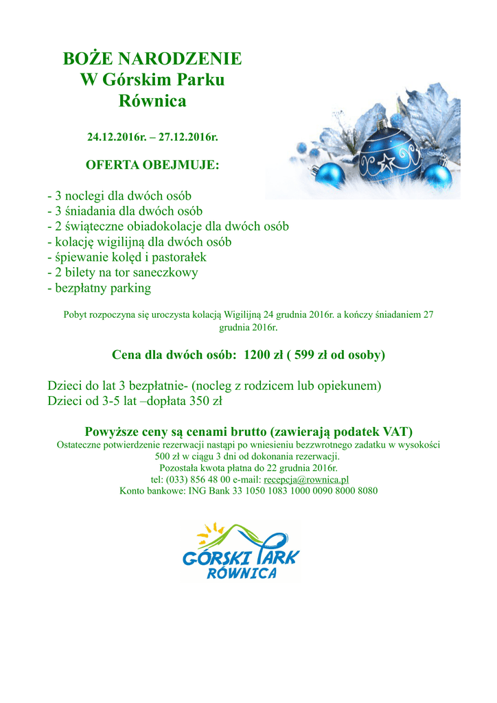 BOŻE NARODZENIE W Górskim Parku Równica 24.12.2016r. – 27.12.2016r. OFERTA OBEJMUJE: - 3 noclegi dla dwóch osób - 3 śniadania dla dwóch osób - 2 świąteczne obiadokolacje dla dwóch osób - kolację wigilijną dla dwóch osób - śpiewanie kolęd i pastorałek - 2 bilety na tor saneczkowy - bezpłatny parking Pobyt rozpoczyna się uroczysta kolacją Wigilijną 24 grudnia 2016r. a kończy śniadaniem 27 grudnia 2016r. Cena dla dwóch osób: 1200 zł ( 599 zł od osoby) Dzieci do lat 3 bezpłatnie- (nocleg z rodzicem lub opiekunem) Dzieci od 3-5 lat –dopłata 350 zł Powyższe ceny są cenami brutto (zawierają podatek VAT) Ostateczne potwierdzenie rezerwacji nastąpi po wniesieniu bezzwrotnego zadatku w wysokości 500 zł w ciągu 3 dni od dokonania rezerwacji. Pozostała kwota płatna do 22 grudnia 2016r. tel: (033) 856 48 00 e-mail: [email protected] Konto bankowe: ING Bank 33 1050 1083 1000 0090 8000 8080