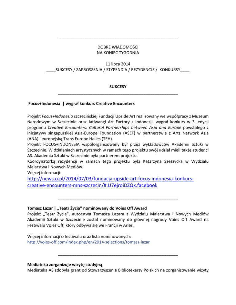 _____________________________________________________ DOBRE WIADOMOŚCI NA KONIEC TYGODNIA 11 lipca 2014 ____SUKCESY / ZAPROSZENIA / STYPENDIA / REZYDENCJE / KONKURSY____ SUKCESY ____________________________________________________ Focus+Indonesia | wygrał konkurs Creative Encounters Projekt Focus+Indonesia szczecińskiej Fundacji Upside Art realizowany we współpracy z Muzeum Narodowym w Szczecinie oraz Jatiwangi Art Factory z Indonezji, wygrał konkurs w 3. edycji programu Creative Encounters: Cultural Partnerships between Asia and Europe powstałego z inicjatywy singapurskiej Asia-‐Europe Foundation (ASEF) w partnerstwie z Arts Network Asia (ANA) i europejską Trans Europe Halles (TEH). Projekt FOCUS+INDONESIA współorganizowany był przez wykładowców Akademii Sztuki w Szczecinie. W działaniach artystycznych w ramach tego projektu swój udział mieli także studenci AS. Akademia Sztuki w Szczecinie była partnerem projektu. Koordynatorką rezydencji w ramach tego projektu była Katarzyna Szeszycka w Wydziału Malarstwa i Nowych Mediów. Więcej informacji: http://news.o.pl/2014/07/03/fundacja-‐upside-‐art-‐focus-‐indonesia-‐konkurs-‐ creative-‐encounters-‐mns-‐szczecin/#.U7ejroiDZQk.facebook ____________________________________________________ Tomasz Lazar | „Teatr Życia” nominowany do Voies Off Award Projekt „Teatr Życia”, autorstwa Tomasza Lazara z Wydziału Malarstwa i Nowych Mediów Akademii Sztuki w Szczecinie został nominowany do głównej nagrody Voies Off Award na Festiwalu Voies Off, który odbywa się we Francji w Arles. Więcej informacji o festiwalu oraz lista nominowanych: http://voies-‐off.com/index.php/en/2014-‐selections/tomasz-‐lazar ____________________________________________________ Mediateka zorganizuje wizytę studyjną Mediateka AS zdobyła grant od Stowarzyszenia Bibliotekarzy Polskich na zorganizowanie wizyty studyjnej. Szczegółowe informacje o naborze już wkrótce. Tymczasem zapraszamy do lektury informacji na stronie grantodawcy: Więcej informacji: http://www.sbp.pl/wizyty/opis/?cid=11801 ____________________________________________________ ZAPROSZENIA / SZCZECIN Otwórz oczy | warsztaty dla młodzieży wtorek | 29 lipca 2014 | godzina 9.00-‐13.00 oraz 14.00-‐18.00 Katedra Grafiki Projektowej Wydziału Sztuk Wizualnych Akademii Sztuki w Szczecinie wraz z Fundacją Banku BGK zapraszają na bezpłatne, jednodniowe warsztaty plastyczne dla dzieci i młodzieży w wieku 8-‐16 lat. Temat warsztatów to uwrażliwianie uczestników na problemy innych ludzi oraz możliwość niesienia bezinteresownej pomocy. Dzieci wspólnie z Organizatorami zastanowią się nad podanymi problemami, zaproponują możliwości ich rozwiązania oraz sposoby niesienia pomocy, a następnie zilustrują wybrany temat. Hasło przewodnie to Poznaj i pokaż prawdę -‐ otwórz oczy i uwrażliwiaj innych. Warsztaty odbędą się w budynku Akademii Sztuki przy ul. Kolumba 61 w Szczecinie. Obowiązuje limit miejsc. Organizator zastrzega sobie możliwość przełożenia warsztatów na inny termin, jeżeli nie uda się zebrać odpowiedniej ilości chętnych. Organizatorem warsztatów jest Fundacja BGK im. J. K. Steczkowskiego. ____________________________________________________ Najlepsze dyplomy Wydziału Sztuk Wizualnych do 18 lipca| TRAFO Trafostacja Sztuki w Szczecinie | ul. Św. Ducha 4 Akademia Sztuki w Szczecinie zaprasza na wernisaż oraz wystawę najlepszych dyplomów licencjackich i magisterskich Wydziału Sztuk Wizualnych Akademii Sztuki Szczecinie. Prezentowane prace postały w roku 2014 na kierunkach grafika oraz architektura wnętrz. W części przygotowanej przez Katedrę Architektury Wnętrz prezentowane są prace 7 tegorocznych dyplomantów licencjackich. Prace powstały w pracowniach projektowania architektury wnętrz oraz mebla (pracownie prowadzą: prof. Henryk Regimowicz, prof. Józef Jurek, prof. Marek Owsian, dr hab. Katarzyna Radecka, prof. AS, dr Olga Sietnicka, dr Krzysztof Bizio). Część prac podejmuje istotne tematy lokalne, skupione wokół Szczecina. Stanowią ważny głos w dyskusji na temat kondycji miasta, potencjału jego architektury i stanu kultury. Opracowania te proponują rozwiązania, które mogą ożywić miasto i tchnąć nowe życie w wybrane rejony. Autorami prac są: Aleksandra Riemer, Anna Kiwior, Marta Iwańska, Marlena Mazur, Sandra Hoeppner, Natalia Szynal i Michał Brzezicki oraz Anna Siewier. W części przygotowanej przez Katedry Grafiki Projektowej i Grafiki Artystycznej prezentowane są zarówno prace dyplomowe z poziomu licencjatu i jak magisterskiego. Katedrę Grafiki Artystycznej prowadzi prof. Andrzej Załecki, Katedrą Grafiki Projektowej kieruje dr hab. Leszek Żebrowski, prof. AS. Pracownie w ramach tych katedr prowadzą: prof. Andrzej Załecki, dr hab. Ewa Czerwińska-‐Romanowska, prof. AS, dr hab. Leszek Żebrowski, prof. AS, dr hab. Ireneusz Kuriata, dr hab. Lex Drewiński, prof. AS. Autorzy prac: Agnieszka Orlińska, Ada Krawczak, Piotr Depta, Kaja Kleśta, Jerzy Sokół, Karolina Gołębiowska, Sylwia Woźniak, Gabriela Golińska, Justyna Hajduk. Prezentowane prace są bardzo różnorodne w formie: od plakatu, przez systemy identyfikacji wizualnej do ilustracji i grafik. Studenci w swoich projektach odnoszą się do otaczającej ich rzeczywistości – proponują nowoczesne sposoby promocji miasta, podejmują tematy społecznie ważne. Wstęp wolny. Wystawa czynna do 18 lipca. Partnerem wydarzenia jest TRAFO Trafostacja Sztuki w Szczecinie. ____________________________________________________ Roller Poster Pierwszy Ogólnopolski Przegląd Plakatu Autorskiego do 18 lipca 2014 | TRAFO Trafostacja Sztuki w Szczecinie | ul. Św. Ducha 4 ORGANIZATOR: Katedra Grafiki Projektowej Wydziału Sztuk Wizualnych Akademii Sztuki w Szczecinie oraz Wirtualna Galeria RollerPoster.pl PARTNER: Trafostacja Sztuki w Szczecinie SPONSOR: Cellco Communications Sp. z o.o. Wystawa odbędzie się w rama