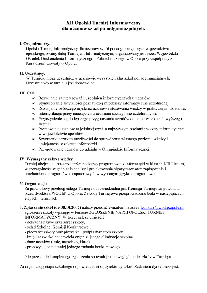 XII Opolski Turniej Informatyczny dla uczniów szkół ponadgimnazjalnych. I. Organizatorzy. Opolski Turniej Informatyczny dla uczniów szkół ponadgimnazjalnych województwa opolskiego, zwany dalej Turniejem Informatycznym, organizowany jest przez Wojewódzki Ośrodek Doskonalenia Informatycznego i Politechnicznego w Opolu przy współpracy z Kuratorium Oświaty w Opolu. II. Uczestnicy. W Turnieju mogą uczestniczyć uczniowie wszystkich klas szkół ponadgimnazjalnych. Uczestnictwo w turnieju jest dobrowolne. III. Cele. • • • • • • • • Rozwijanie zainteresowań i uzdolnień informatycznych u uczniów Stymulowanie aktywności poznawczej młodzieŜy informatycznie uzdolnionej. Rozwijanie twórczego myślenia uczniów i stosowania wiedzy w praktycznym działaniu. Intensyfikacja pracy nauczycieli z uczniami szczególnie uzdolnionymi. Przyczynienie się do lepszego przygotowania uczniów do nauki w szkołach wyŜszego stopnia. Promowanie uczniów najzdolniejszych o najwyŜszym poziomie wiedzy informatycznej w województwie opolskim. Stworzenie uczniom moŜliwości do sprawdzenia własnego poziomu wiedzy i umiejętności z zakresu informatyki. Przygotowanie uczniów do udziału w Olimpiadzie Informatycznej. IV. Wymagany zakres wiedzy Turniej obejmuje i poszerza treści podstawy programowej z informatyki w klasach I-III Liceum, w szczególności zagadnienia analizy i projektowania algorytmów oraz zapisywania i uruchamiania programów komputerowych w wybranym języku oprogramowania. V. Organizacja Za prawidłowy przebieg całego Turnieju odpowiedzialna jest Komisja Turniejowa powołana przez dyrektora WODIiP w Opolu. Zawody Turniejowe przeprowadzane będą w następujących etapach i terminach : 1. Zgłaszanie szkół (do 30.10.2007) naleŜy przesłać e-mailem na adres [email protected] zgłoszenie szkoły wpisując w temacie ZGŁOSZENIE NA XII OPOLSKI TURNIEJ INFORMATYCZNY. W treści naleŜy umieścić: - dokładną nazwę oraz adres szkoły, - skład Szkolnej Komisji Konkursowej, - pieczątkę szkoły oraz pieczątkę i podpis dyrektora szkoły - imię i nazwisko nauczyciela organizującego eliminacje szkolne - dane uczniów (imię, nazwisko, klasa) - propozycję co najmniej jednego zadania konkursowego Nie przesłanie kompletnego zgłoszenia spowoduje nieuwzględnienie szkoły w Turnieju. Za organizację etapu szkolnego odpowiedzialni są dyrektorzy szkół. Zadaniem dyrektorów jest: - zgłoszenie w terminie do dnia 30.10.2007r. do Komisji Konkursowej udziału szkoły w konkursie, - zapoznanie nauczycieli, uczniów i rodziców z regulaminami konkursów, - przekazanie wyników etapu szkolnego do Komisji Konkursowej. 2. Zawody szkolne (do dnia 23 listopada 2007 r) będą przeprowadzone w szkole pod kontrolą nauczyciela informatyki. Polegać będą na samodzielnym rozwiązywaniu przez uczniów zadań opublikowanych w Internecie na stronach WODIiP (www.wodip.opole.pl). Zadania opublikowane zostaną 19.11.2007 r. o godzinie 9.00 na stronie WODIiP wraz z zasadami oceniania. W kaŜdym zestawie znajdować się będzie pięć zadań ocenianych w skali 0-10. Oceny zadań dokonuje nauczyciel informatyki i przesyła informację o uczniach zakwalifikowanych zawodów rejonowych do dnia 27.11.2007r. włącznie w formie elektronicznej na adres [email protected] oraz w formie pisemnej na adres WODIiP Opole. Do zawodów rejonowych zakwalifikowanych zostanie co najwyŜej 3 uczniów z danej szkoły, którzy uzyskali największą łączną liczbę punktów w zawodach szkolnych. Liczba punktów uzyskana w zawodach szkolnych przez ucznia zakwalifikowanego do zawodów rejonowych nie moŜe być mniejsza niŜ 80% moŜliwych do zdobycia punktów, czyli nie mniej niŜ 40 punktów. 3. Zawody rejonowe (do dnia 7 stycznia 2008 r) polegać będą na samodzielnym rozwiązywaniu przez uczniów zadań publikowanych w Internecie na stronach WODIiP-u. Zadania opublikowane zostaną do dnia 17.12.2007 r. W kaŜdym zestawie znajdować się będzie pięć zadań, ocenianych w skali od 0 do 10 punktów. Łącznie moŜna będzie uzyskać 50 punktów. Szczegóły dotyczące zasad elektronicznego przesyłania rozwiązań opublikowane zostaną wraz z zadaniami. Informacje o łącznej liczbie otrzymanych punktów za rozwiązane zadania będą umieszczone na stronie internetowej WODIiP do dnia 21 stycznia 2008 r. Do etapu finałowego zakwalifikowani zostaną uczestnicy, którzy uzyskali nie mniej niŜ 85% moŜliwych do zdobycia punktów, czyli co najmniej 43 punkty z tym, Ŝe zakwalifikowanych zostanie co najwyŜej 12 uczniów, którzy uzyskali największą łączną liczbę punktów w zawodach rejonowych. Wszyscy uczestnicy zawodów rejonowych zobowiązani są przesłać jednorazowo do siedziby WODIiP w Opolu wydrukowane i opatrzone pieczęcią szkoły zgłoszenie według wzoru : Imię i nazwisko ... XII Opolski Turniej Informatyczny 2007/2008 Klasa Nazwa i adres szkoły Nazwisko nauczyciela prowadzącego ... ... ... Programy piszę w (podkreślić jeden): TURBO PASCAL w. 7.0 BORLAND C++ w. 2.0 Delphi 7 Personal Borland C++ Builder 6 Personal MS Visual Studio .NET VB WyraŜam zgodę na umieszczenie moich danych (imię, nazwisko, szkoła, liczba zdobytych punktów) na internetowej stronie WODIiP Opole ................................. ............................. data czytelny podpis 4. Zawody finałowe (4 luty 2008 r) polegać będą na samodzielnym rozwiązaniu, przez zakwalifikowanych do finału uczniów, zadań opracowanych przez Komisję Konkursową. W zawodach finałowych uczestnicy pod nadzorem komisji rozwiązują problemy na komputerach przygotowanych przez komisję. Uczeń moŜe przystąpić do zawodów po okazaniu komisji aktualnej legitymacji szkolnej. 5. Języki programowania: Rozwiązania zadań na kaŜdym etapie będą uruchamiane i sprawdzane za pomocą narzędzi: TURBO PASCAL w. 7.0, BORLAND C++ w. 2.0 , Delphi 7 Personal, Borland C++ Builder 6 Personal, MS Visual Studio .NET VB. Rodzaj narzędzia w