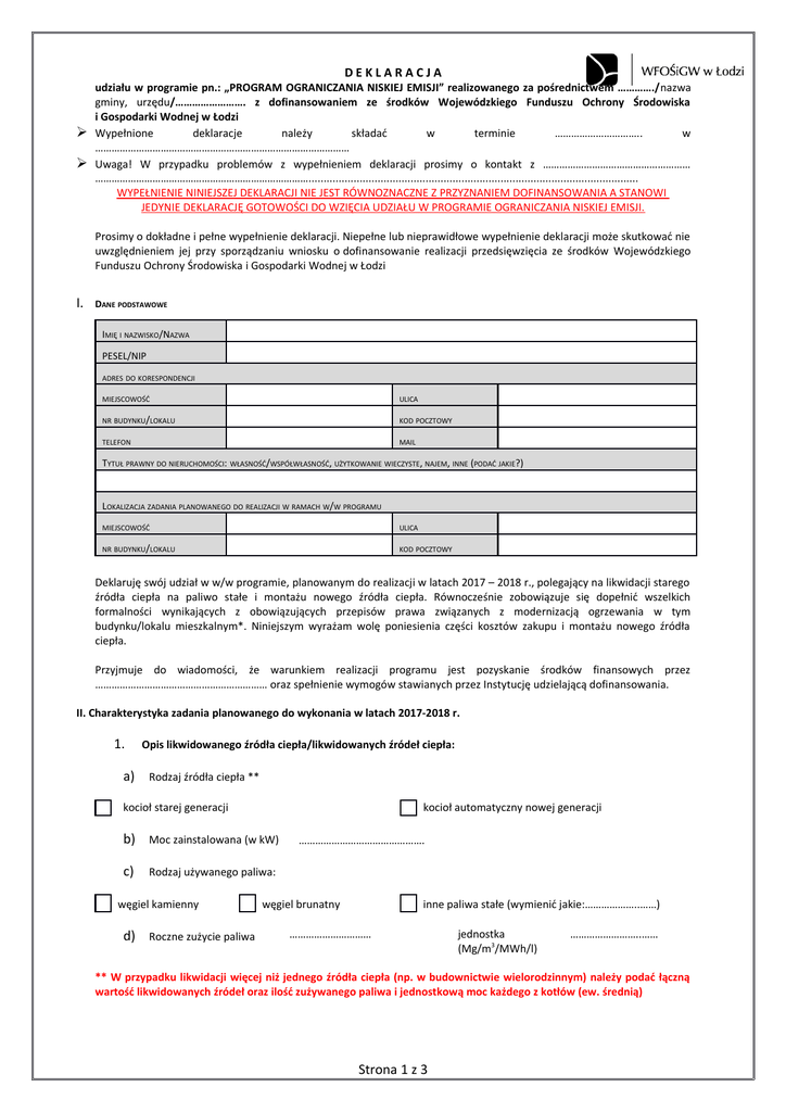 DEKLARACJA udziału w programie pn.: „PROGRAM OGRANICZANIA NISKIEJ EMISJI” realizowanego za pośrednictwem …………./nazwa gminy, urzędu/……………………. z dofinansowaniem ze środków Wojewódzkiego Funduszu Ochrony Środowiska i Gospodarki Wodnej w Łodzi Wypełnione deklaracje należy składać w terminie ………………………….. w ………………………………………………………………………………… Uwaga! W przypadku problemów z wypełnieniem deklaracji prosimy o kontakt z ……………………………………………… …………………………………………………………………….............................................................................................................. WYPEŁNIENIE NINIEJSZEJ DEKLARACJI NIE JEST RÓWNOZNACZNE Z PRZYZNANIEM DOFINANSOWANIA A STANOWI JEDYNIE DEKLARACJĘ GOTOWOŚCI DO WZIĘCIA UDZIAŁU W PROGRAMIE OGRANICZANIA NISKIEJ EMISJI. Prosimy o dokładne i pełne wypełnienie deklaracji. Niepełne lub nieprawidłowe wypełnienie deklaracji może skutkować nie uwzględnieniem jej przy sporządzaniu wniosku o dofinansowanie realizacji przedsięwzięcia ze środków Wojewódzkiego Funduszu Ochrony Środowiska i Gospodarki Wodnej w Łodzi I. DANE PODSTAWOWE IMIĘ I NAZWISKO/NAZWA PESEL/NIP ADRES DO KORESPONDENCJI MIEJSCOWOŚĆ ULICA NR BUDYNKU/LOKALU KOD POCZTOWY TELEFON MAIL TYTUŁ PRAWNY DO NIERUCHOMOŚCI: WŁASNOŚĆ/WSPÓŁWŁASNOŚĆ, UŻYTKOWANIE WIECZYSTE, NAJEM, INNE (PODAĆ JAKIE?) LOKALIZACJA ZADANIA PLANOWANEGO DO REALIZACJI W RAMACH W/W PROGRAMU MIEJSCOWOŚĆ ULICA NR BUDYNKU/LOKALU KOD POCZTOWY Deklaruję swój udział w w/w programie, planowanym do realizacji w latach 2017 – 2018 r., polegający na likwidacji starego źródła ciepła na paliwo stałe i montażu nowego źródła ciepła. Równocześnie zobowiązuje się dopełnić wszelkich formalności wynikających z obowiązujących przepisów prawa związanych z modernizacją ogrzewania w tym budynku/lokalu mieszkalnym*. Niniejszym wyrażam wolę poniesienia części kosztów zakupu i montażu nowego źródła ciepła. Przyjmuje do wiadomości, że warunkiem realizacji programu jest pozyskanie środków finansowych przez ……………………………………………………… oraz spełnienie wymogów stawianych przez Instytucję udzielającą dofinansowania. II. Charakterystyka zadania planowanego do wykonania w latach 2017-2018 r. 1. Opis likwidowanego źródła ciepła/likwidowanych źródeł ciepła: a) Rodzaj źródła ciepła ** kocioł starej generacji kocioł automatyczny nowej generacji b) Moc zainstalowana (w kW) c) ………………………………………. Rodzaj używanego paliwa: węgiel kamienny d) Roczne zużycie paliwa węgiel brunatny inne paliwa stałe (wymienić jakie:………………..……) ………………………… jednostka (Mg/m3/MWh/l) ……………………..…… ** W przypadku likwidacji więcej niż jednego źródła ciepła (np. w budownictwie wielorodzinnym) należy podać łączną wartość likwidowanych źródeł oraz ilość zużywanego paliwa i jednostkową moc każdego z kotłów (ew. średnią) Strona 1 z 3 2. Opis planowanego do zainstalowania nowego źródła ciepła a) Rodzaj źródła ciepła kocioł automatyczny nowej generacji na węgiel kamienny (5 klasa) sieć ciepłownicza kocioł na gaz ziemny/płynny * kocioł na biomasę kocioł na olej opałowy elektryczne (z wyłączeniem pompy ciepła) b) Moc zainstalowana (w kW) c) Roczne zużycie paliwa pompa ciepła …………………………………. ………………………………….. jednostka ( Mg/m3/MWh/l ) ………………………… d) Planowane zużycie ciepła z sieci (w GJ/rok) (dotyczy tylko przyłączy do sieci ciepłowniczej) ………………………………………. e) dominujące paliwo jakim jest opalane źródło zasilające sieć ciepłowniczą (jeśli wiadomo) … ………………………………………. III. Planowany termin realizacji inwestycji (proszę podać co najmniej miesiąc i rok) Rozpoczęcie Zakończenie IV. Planowane koszty realizacji inwestycji Netto 1 . Koszt zakupu nowego źródła ciepła 2 . Koszt demontażu 3 . Koszt montażu 4 . Koszt modernizacji instalacji 5 . Inne (np. Dokumentacja projektowa, inwentaryzacja, audyty itp.) 6 . Koszt całkowity Brutto (zaokrąglić do pełnych złotych) Realizując powyższe zadanie nie mam możliwości odzyskania w żaden sposób poniesionego kosztu podatku VAT / mam możliwość odzyskania poniesiony koszt podatku VAT.* (w przypadku możliwości odzyskania poniesionego kosztu podatku VAT dofinansowane mogą być tylko koszty netto) ........................................................................... (data i podpis) Strona 2 z 3 V. Oświadczenia: 1) Oświadczam, iż realizacja przedsięwzięcia*: − Wymaga uzyskania pozwolenia na budowę ……………………………………… (podać datę uzyskania pozwolenia/złożenia wniosku/planowaną datę złożenia wniosku); − Nie wymaga uzyskania pozwolenia na budowę, roboty zgłoszono do właściwego organu: ……………………………………………………. (podać nazwę organu oraz datę zgłoszenia/planowanego zgłoszenia); − Nie wymaga uzyskania pozwolenia na budowę jak również zgłoszenia robót do właściwego organu. 2) Oświadczam, iż nie ma możliwości podłączenia nieruchomości, na której będzie realizowane przedsięwzięcie, do miejskiej sieci ciepłowniczej lub do sieci gazowej. 3) Oświadczam, iż przedsięwzięcie nie było/nie będzie finansowanie z innych źródeł niż Program Ograniczania Niskiej Emisji WFOŚiGW w Łodzi oraz budżetu Miasta ………………….. 4) Oświadczam, iż w nieruchomości, na terenie której będzie realizowane przedsięwzięcie nie jest prowadzona /jest prowadzona działalnoś 5) gospodarcza. .....................................................................