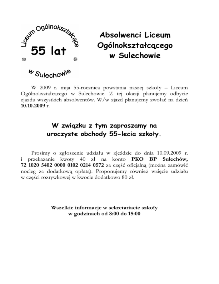 Absolwenci Liceum Ogólnokształcącego w Sulechowie W 2009 r. mija 55-rocznica powstania naszej szkoły – Liceum Ogólnokształcącego w Sulechowie. Z tej okazji planujemy odbycie zjazdu wszystkich absolwentów. W/w zjazd planujemy zwołać na dzień 10.10.2009 r. W związku z tym zapraszamy na uroczyste obchody 55-lecia szkoły. Prosimy o zgłoszenie udziału w zjeździe do dnia 10.09.2009 r. i przekazanie kwoty 40 zł na konto PKO BP Sulechów, 72 1020 5402 0000 0102 0214 0572 za część oficjalną (moŜna zamówić nocleg za dodatkową opłatą). Proponujemy równieŜ wzięcie udziału w części rozrywkowej w kwocie dodatkowo 80 zł. Wszelkie informacje w sekretariacie szkoły w godzinach od 8:00 do 15:00 Ankieta absolwenta Nazwisko w dniu matury: .................................................................................................... Nazwisko obecne: ................................................................................................................. Imiona: .................................................................................................................................... Rok uzyskania matury: .......................................................................................................... Miejsce zamieszkania *: ......................................................................................................... ................................................................................................................................................... Telefon / tel. kom.: ............................................................................................................... Adres poczty elektronicznej (e-mail): ................................................................................. Zawód obecnie wykonywany: ............................................................................................. Ankiety prosimy przesyłać pocztą elektroniczną lub drogą listową na adres: Liceum Ogólnokształcące w Sulechowie ul. Licealna 10 66-100 Sulechów Informacja telefoniczna 0-68-385-26-19 Strona internetowa: www.lo.sulechow.net * moŜna wypełnić