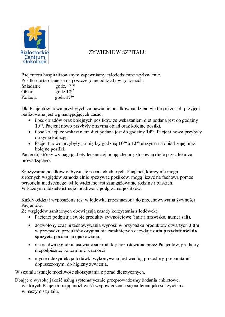 ŻYWIENIE W SZPITALU Pacjentom hospitalizowanym zapewniamy całododzienne wyżywienie. Posiłki dostarczane są na poszczególne oddziały w godzinach: Śniadanie godz. 7 ³º Obiad godz.12¹5 Kolacja godz.17³º Dla Pacjentów nowo przybyłych zamawianie posiłków na dzień, w którym zostali przyjęci realizowane jest wg następujących zasad: ilość obiadów oraz kolejnych posiłków ze wskazaniem diet podana jest do godziny 10³º, Pacjent nowo przybyły otrzyma obiad oraz kolejne posiłki, ilość kolacji ze wskazaniem diet podana jest do godziny 14ºº, Pacjent nowo przybyły otrzyma kolację, Pacjent nowo przybyły pomiędzy godziną 10ºº a 12ºº otrzyma na obiad zupę oraz kolejne posiłki. Pacjenci, którzy wymagają diety leczniczej, mają zleconą stosowną dietę przez lekarza prowadzącego. Spożywanie posiłków odbywa się na salach chorych. Pacjenci, którzy nie mogą z różnych względów samodzielnie spożywać posiłków, mogą liczyć na fachową pomoc personelu medycznego. Mile widziane jest zaangażowanie rodziny i bliskich. W każdym oddziale istnieje możliwość podgrzania posiłków. Każdy oddział wyposażony jest w lodówkę przeznaczoną do przechowywania żywności Pacjentów. Ze względów sanitarnych obowiązują zasady korzystania z lodówek: Pacjenci podpisują swoje produkty żywnościowe (imię i nazwisko, numer sali), dozwolony czas przechowywania wynosi: w przypadku produktów otwartych 3 dni, w przypadku produktów oryginalnie zamkniętych decyduje data przydatności do spożycia podana na opakowaniu, raz na dwa tygodnie usuwane są produkty pozostawione przez Pacjentów, produkty niepodpisane, po terminie ważności, mycie i dezynfekcja lodówki wykonywana jest według procedury, preparatami dopuszczonymi do higieny żywienia. W szpitalu istnieje możliwość skorzystania z porad dietetycznych. Dbając o wysoką jakość usług systematycznie przeprowadzamy badania ankietowe, w których Pacjenci mają możliwość wypowiedzenia się na temat jakości żywienia w naszym szpitalu.