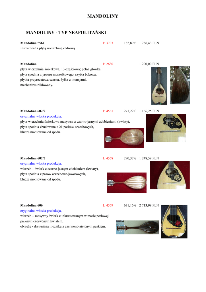 MANDOLINY MANDOLINY - TYP NEAPOLITAŃSKI Mandolina 556C I: 3703 182,89 € 786,43 PLN Instrument z płytą wierzchnią cedrową Mandolina I: 2680 płyta wierzchnia świerkowa, 13-częściowa; pełna główka, płyta spodnia z jaworu muszelkowego, szyjka bukowa, płytka przyrozetowa czarna, żyłka z intarsjami, 1 200,00 PLN mechanizm niklowany. I: 4567 271,22 € 1 166,25 PLN Mandolina 602/2 oryginalna włoska produkcja, płyta wierzchnia świerkowa masywna z czarno-jasnymi zdobieniami (kwiaty), płyta spodnia zbudowana z 21 pasków orzechowych, klucze montowane od spodu. Mandolina 602/3 oryginalna włoska produkcja, wierzch – świerk z czarno-jasnym zdobieniem (kwiaty), płyta spodnia z pasów orzechowo-jaworowych, klucze montowane od spodu. I: 4568 290,37 € 1 248,59 PLN Mandolina 606 I: 4569 oryginalna włoska produkcja, wierzch – masywny świerk z inkrustowanym w masie perłowej 631,16 € 2 713,99 PLN pięknym czerwonym kwiatem, obrzeże - drewniana mozaika z czerwono-zielonym paskiem. MANDOLINY Mandolina 609 I: 4570 oryginalna włoska produkcja, instrument koncertowy, wierzch – masywna płyta świerkowa, spód zbudowany z 27 pasków, inkrustowane zdobienia w palisandrze (wizerunek smoka), klucze montowane z boku z główkami z masy perłowej 1 149,39 € 4 942,38 PLN MANDOLINY PŁASKIE Mandolina I: 2697 750,00 PLN Made in Europe, lita świerkowa płyta wierzchnia z wpuszczaną płytką przyrozetową, masywne 7-warstwowe dno klonowe, pudło klonowe – czerwony brąz, szyjka klonowa, czarna podstrunnica z twardego drewna, 17 progów, klonowy podstawek, szerokość siodełka 31mm, menzura 332mm, niklowana mechanika, plastikowe klucze, lakier o wysokim połysku I: 4564 193,59 € Mandolina 701S oryginalna włoska produkcja, instrument z pracowni lutniczej Alfio Leone, wierzch – świerk, proste zdobienia, ozdobny strunociąg, klucze montowane od przodu 832,44 PLN I: 4565H 315,58 € 1 356,99 PLN Mandolina 701 oryginalna włoska produkcja, instrument z pracowni lutniczej Alfio Leone, inkrustowany, rozetka ze świecącymi elementami, strunociąg ozdobny Mandolina 701 Sp I: 4566 464,80 € 1 998,64 PLN oryginalna włoska produkcja, instrument z pracowni lutniczej Alfio Leone, obrzeże mozaikowe, na rozetce czerwona szarotka w masie perłowej, klucze montowane z boku MANDOLINY MANDOLINY – TYP PORTUGALSKI Mandolina I: 5210 900,00 PLN Made in Europe, lita świerkowa płyta wierzchnia z wpuszczaną płytką przyrozetową, lity sklepiony klonowy tył, klonowa główka, podstrunnica z twardego drewna, 17 progów, klonowy podstawek, szerokość siodełka 31mm, menzura 332mm, lakier o wysokim połysku Mandolina I: 6215 1 300,00 PLN Made in Europe, lita świerkowa płyta wierzchnia z wpuszczaną płytką przyrozetową, spód i boki – orzech włoski, wypukła płyta spodnia z wstawkami w kształcie gwiazdki z drzewa klonowego i orzecha włoskiego, szyjka klonowa, podstrunnica z drzewa akacjowego, 19 progów – nowe srebro z progiem 0, szerokość siodełka 31mm, menzura 332mm, lakier jedwabno-matowy Mandolina I: 2698 Made in Europe, płyta wierzchnia świerkowa, płyta przyrozetowa – tworzywo, boki jaworowe, wypukła płyta spodnia jaworowa/orzechowa, 7-częściowa, dwukolorowa, szyjka mahoniowa, podstrunnica palisandrowa z progiem 0, mechanika chromowana 1 400,00 PLN MANDOLINY MANDOLINY AKUSTYCZE Mandolina TENNESSE FOLK I: 2702 Made in Europe, Model Economy A-1 F-Hole Sunburst z futerałem płyta wierzchnia świerkowa, spód i boki, oraz szyjka – mahoń, postrunnica oprawiona palisandrowa z 20 srebrnymi progami, mostek palisandrowy, regulowana wysokość, mechanika chromowana, oryginalne struny D'Addario, lakier mat 370,02 € 1 591,09 PLN Mandolina model Premium z futerałem I: 3851 1 008,23 € 4 335,39 PLN Made in Europe, płyta wierzchnia świerkowa, otwory-f, spód i boki – klon podpalany, oprawiona podstrunnica palisandrowa z 24 srebrnymi progami, mostek palisander, regulowana wysokość, pozłacana mechanika z główkami z perloidu MANDOLINY ELEKTRO-AKUSTYCZNE Mandolina Tenson A1 I: 5845 Made in Europe, płyta wierzchnia świerkowa, zamknięta, spód i boki – lipa, podstrunnica palisandrowa oprawiona z 24 srebrnymi progami, menzura 350mm, szerokość siodełka 43mm, chromowana mechanika, podstawek palisandrowy, regulowana wysokość, pokrowiec z szelkami i kieszenią na akcesoria 332,70 PLN Mandolina Tenson A-1E I: 5844 Made in Europe, model elektro-akustyczny płyta wierzchnia świerkowa, zamknięta, otwory-f płyta spodnia i boki klonowe, lakierowane, podpalane, podstrunnica palisandrowa oprawiona z 20 srebrnymi progami, podstawek palisandrowy, regulowana wysokość, magnetyczny pickup, regulator dźwięku i głosu, pokrowiec z szelkami i kieszenią na akcesoria 403,28 PLN