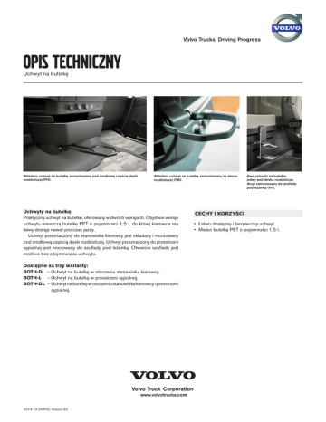 Volvo Trucks. Driving Progress OPIS TECHNICZNY Uchwyt na butelkę Składany uchwyt na butelkę zamontowany pod środkową częścią deski rozdzielczej (FH). Składany uchwyt na butelkę zamontowany na desce rozdzielczej (FM). Uchwyty na butelkę Praktyczny uchwyt na butelkę, oferowany w dwóch wersjach. Obydwie wersje uchwytu mieszczą butelkę PET o pojemności 1,5 l, do której kierowca ma łatwy dostęp nawet podczas jazdy. Uchwyt przeznaczony do stanowiska kierowcy jest składany i montowany pod środkową częścią deski rozdzielczej. Uchwyt przeznaczony do przestrzeni sypialnej jest mocowany do szuflady pod leżanką. Otwarcie szuflady jest możliwe bez zdejmowania uchwytu. Dostępne są trzy warianty: BOTH-D – Uchwyt na butelkę w otoczeniu stanowiska kierowcy. BOTH-L – Uchwyt na butelkę w przestrzeni sypialnej. BOTH-DL – Uchwyt na butelkę w otoczeniu stanowiska kierowcy i przestrzeni sypialnej. 2014-10-24 POL Version 02 Dwa uchwyty na butelkę: jeden pod deską rozdzielcza, drugi zamocowany do szuflady pod leżanką (FH). CECHY I KORZYŚCI • Łatwo dostępny i bezpieczny uchwyt. • Mieści butelkę PET o pojemności 1,5 l.