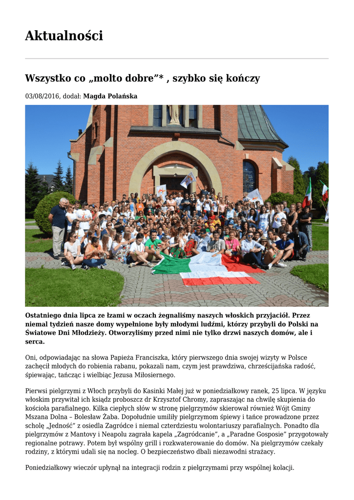 Aktualności Wszystko co „molto dobre”* , szybko się kończy 03/08/2016, dodał: Magda Polańska Ostatniego dnia lipca ze łzami w oczach żegnaliśmy naszych włoskich przyjaciół. Przez niemal tydzień nasze domy wypełnione były młodymi ludźmi, którzy przybyli do Polski na Światowe Dni Młodzieży. Otworzyliśmy przed nimi nie tylko drzwi naszych domów, ale i serca. Oni, odpowiadając na słowa Papieża Franciszka, który pierwszego dnia swojej wizyty w Polsce zachęcił młodych do robienia rabanu, pokazali nam, czym jest prawdziwa, chrześcijańska radość, śpiewając, tańcząc i wielbiąc Jezusa Miłosiernego. Pierwsi pielgrzymi z Włoch przybyli do Kasinki Małej już w poniedziałkowy ranek, 25 lipca. W języku włoskim przywitał ich ksiądz proboszcz dr Krzysztof Chromy, zapraszając na chwilę skupienia do kościoła parafialnego. Kilka ciepłych słów w stronę pielgrzymów skierował również Wójt Gminy Mszana Dolna – Bolesław Żaba. Dopołudnie umiliły pielgrzymom śpiewy i tańce prowadzone przez scholę „Jedność” z osiedla Zagródce i niemal czterdziestu wolontariuszy parafialnych. Ponadto dla pielgrzymów z Mantovy i Neapolu zagrała kapela „Zagródcanie”, a „Paradne Gosposie” przygotowały regionalne potrawy. Potem był wspólny grill i rozkwaterowanie do domów. Na pielgrzymów czekały rodziny, z którymi udali się na nocleg. O bezpieczeństwo dbali niezawodni strażacy. Poniedziałkowy wieczór upłynął na integracji rodzin z pielgrzymami przy wspólnej kolacji. Wszystkich udało się zakwaterować w domach. Mieszkańcy Kasinki Małej przygotowali się na przyjęcie niemal 450 osób. Ostatecznie do naszej parafii trafiło blisko 330 pielgrzymów. We wtorek rano Włosi udali się do Krakowa i Oświęcimia. Wieczorem na blisko 120-osobową grupę czekała kolacja w strażnicy, którą umilił występ kilku członków z orkiestry dętej „Echo Gór”. Pielgrzymi tańczyli i klaskali w rytm melodii granych przez muzykantów, takich jak np. „Góralu, czy ci nie żal”. Pozostała część grupy posiliła się w Krakowie, wykorzystując otrzymane talony na żywność. W środę pielgrzymi udali się do Sanktuarium Bożego Miłosierdzia w Krakowie-Łagiewnikach, gdzie odbywał się włoski festiwal, który zgromadził ponad siedemdziesiąt tysięcy Włochów. Modlili się przed obrazem Pana Jezusa Miłosiernego, relikwiach św. Siostry Faustyny i św. Jana Pawła II, a także uczestniczyli we Mszy św. W tym dniu wolontariusze z dekanatu Mszana Dolna, a także pielgrzymi m.in. z Francji, brali udział w Festiwalu Młodych, zorganizowanym na terenie Mszany Dolnej. W czwartek i w piątek pielgrzymi wzięli udział w katechezach odbywających się w Kasinie Wielkiej, a po obiedzie przygotowanym przez Restaurację Foksal, udali się do Krakowa, gdzie uczestniczyli w powitaniu Papieża Franciszka i Drodze Krzyżowej. W sobotni ranek grupa z Neapolu licząca blisko 120 osób wzięła udział we Mszy św., a następnie w pożegnaniu, które zorganizował Komitet Parafialny, schola z Zagródca i wolontariusze. Pielgrzymi bawili się i tańczyli wraz z rodzinami, które przygarnęły ich pod swój dach. Przed południem opuścili naszą miejscowość, udając się na całonocne czuwanie z Papieżem Franciszkiem do Brzegów. W niedzielę uczestniczyli w tzw. Mszy Posłania, a potem wrócili do rodzinnego kraju. Grupa z Mantovy również udała się na całonocne czuwanie z Ojcem Świętym, ale w przeciwieństwie do grupy z południa Włoch, wróciła do Kasinki Małej w niedzielne popołudnie. Na pielgrzymów czekał posiłek przygotowany przez goszczące ich rodziny. Tego samego dnia wieczorem odbyło się krótkie pożegnanie, które uświetnił występ orkiestry „Echo Gór”. Po nim pielgrzymi udali się do swojej ojczyzny. Jesteśmy bardzo szczęśliwi, że mogliśmy gościć u nas radosnych, młodych duchem ludzi, którzy zaufali Jezusowi. Tydzień ich pobytu w naszej parafii minął bardzo szybko – za szybko! Mimo, że większość czasu spędzili poza Kasinką, to wspólne śniadania i kolacje pozwoliły zaprzyjaźnić się nam na tyle mocno, by traktować ich jak drugą rodzinę. Kiedy pytaliśmy naszych włoskich przyjaciół o to, co najlepiej zapamiętają z pobytu w naszym kraju, zgodnie odpowiadali, że polską gościnność. Dziękujemy za otwarcie przed nimi drzwi i serc. Nie mówimy „żegnajcie”, ale „do zobaczenia”, wierzymy bowiem, że spotkamy się znów. Zapewniamy o modlitwie i dziękujemy, że to właśnie z Wami mogliśmy przeżyć Światowe Dni Młodzieży 2016! Wspominajcie z nami: https://www.youtube.com/watch?v=fTu-VivxRao https://www.youtube.com/watch?v=TI7ruxlo-sI * „Molto dobre” – bardzo dobre; tak swój zachwyt po spróbowaniu korbaczy wyraził Carlo, jeden z włoskich pielgrzymów goszczący w Kasince Małej; to określenie szybko się przyjęło i jest używane do wyrażenia wszystkiego, co najlepsze ;-) Monika Majerczyk, lider ŚDM w Kasince Małej fot. Alina Adamczyk, Julia Mucha
