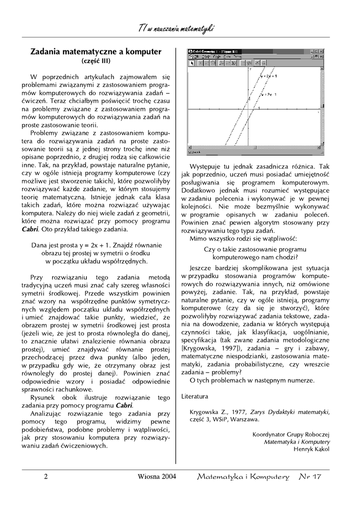 TI w nauczaniu matematyki Zadania matematyczne a komputer (czê¶æ III) W poprzednich artyku³ach zajmowa³em siê problemami zwi±zanymi z zastosowaniem programów komputerowych do rozwi±zywania zadañ − æwiczeñ. Teraz chcia³bym po¶wiêciæ trochê czasu na problemy zwi±zane z zastosowaniem programów komputerowych do rozwi±zywania zadañ na proste zastosowanie teorii. Problemy zwi±zane z zastosowaniem komputera do rozwi±zywania zadañ na proste zastosowanie teorii s± z jednej strony trochê inne ni¿ opisane poprzednio, z drugiej rodz± siê ca³kowicie inne. Tak, na przyk³ad, powstaje naturalne pytanie, czy w ogóle istniej± programy komputerowe (czy mo¿liwe jest stworzenie takich), które pozwoli³yby rozwi±zywaæ ka¿de zadanie, w którym stosujemy teoriê matematyczn±. Istnieje jednak ca³a klasa takich zadañ, które mo¿na rozwi±zaæ u¿ywaj±c komputera. Nale¿y do niej wiele zadañ z geometrii, które mo¿na rozwi±zaæ przy pomocy programu Cabri. Oto przyk³ad takiego zadania. Dana jest prosta y = 2x + 1. Znajd¼ równanie obrazu tej prostej w symetrii o ¶rodku w pocz±tku uk³adu wspó³rzêdnych. Przy rozwi±zaniu tego zadania metod± tradycyjn± uczeñ musi znaæ ca³y szereg w³asno¶ci symetrii ¶rodkowej. Przede wszystkim powinien znaæ wzory na wspó³rzêdne punktów symetrycznych wzglêdem pocz±tku uk³adu wspó³rzêdnych i umieæ znajdowaæ takie punkty, wiedzieæ, ¿e obrazem prostej w symetrii ¶rodkowej jest prosta (je¿eli wie, ¿e jest to prosta równoleg³a do danej, to znacznie u³atwi znalezienie równania obrazu prostej), umieæ znajdywaæ równanie prostej przechodz±cej przez dwa punkty (albo jeden, w przypadku gdy wie, ¿e otrzymany obraz jest równoleg³y do prostej danej). Powinien znaæ odpowiednie wzory i posiadaæ odpowiednie sprawno¶ci rachunkowe. Rysunek obok ilustruje rozwi±zanie tego zadania przy pomocy programu Cabri. Analizuj±c rozwi±zanie tego zadania przy pomocy tego programu, widzimy pewne podobieñstwa, podobne problemy i w±tpliwo¶ci, jak przy stosowaniu komputera przy rozwi±zywaniu zadañ æwiczeniowych. 2 Wiosna 2004 Wystêpuje tu jednak zasadnicza ró¿nica. Tak jak poprzednio, uczeñ musi posiadaæ umiejêtno¶æ pos³ugiwania siê programem komputerowym. Dodatkowo jednak musi rozumieæ wystêpuj±ce w zadaniu polecenia i wykonywaæ je w pewnej kolejno¶ci. Nie mo¿e bezmy¶lnie wykonywaæ w programie opisanych w zadaniu poleceñ. Powinien znaæ pewien algorytm stosowany przy rozwi±zywaniu tego typu zadañ. Mimo wszystko rodzi siê w±tpliwo¶æ: Czy o takie zastosowanie programu komputerowego nam chodzi? Jeszcze bardziej skomplikowana jest sytuacja w przypadku stosowania programów komputerowych do rozwi±zywania innych, ni¿ omówione powy¿ej, zadanie. Tak, na przyk³ad, powstaje naturalne pytanie, czy w ogóle istniej±, programy komputerowe (czy da siê je stworzyæ), które pozwoli³yby rozwi±zywaæ zadania tekstowe, zadania na dowodzenie, zadania w których wystêpuj± czynno¶ci takie, jak klasyfikacja, uogólnianie, specyfikacja (tak zwane zadania metodologiczne [Krygowska, 1997]), zadania − gry i zabawy, matematyczne niespodzianki, zastosowania matematyki, zadania probabilistyczne, czy wreszcie zadania − problemy? O tych problemach w nastêpnym numerze. Literatura Krygowska Z., 1977, Zarys Dydaktyki matematyki, czê¶æ 3, WSiP, Warszawa. Koordynator Grupy Roboczej Matematyka i Komputery Henryk K±kol Matematyka i Komputery Nr 17 Komunikaty, listy Warsztaty Grupy Roboczej Matematyka i Komputery W tym roku mija 10 lat od momentu powstania Grupy Roboczej Matematyka i Komputery. A wszystko zaczê³o siê tak. W 1994 roku, w trzecim roku dzia³alno¶ci SNM, zebra³a siê w Bielsku-Bia³ej gromadka nauczycieli, entuzjastów wykorzystania komputerów na lekcjach matematyki. Postanowili¶my stworzyæ Grupê Robocz±, której celem by³o propagowanie stosowania nowoczesnych ¶rodków dydaktycznych w nauczaniu matematyki. I tak pracujemy ju¿ przez 10 lat. Do naszej Grupy Roboczej do³±czali nowi cz³onkowie, inni odchodzili. Tak, jak to zwykle w ¿yciu bywa. Na pocz±tku wydawali¶my Biuletyn Informacyjny, którego redaktorem by³a Dorota Waloszek. Potem wydali¶my ksi±¿kê Matematyka i Komputery. Zaczêli¶my prowadziæ kursy komputerowe i kalkulatorowe. Przez te 10 lat przeszkolili¶my ponad tysi±c nauczycieli − entuzjastów wykorzystywania komputerów i kalkulatorów w nauczaniu matematyki. Stworzyli¶my dwa, zatwierdzone przez MEN, programy do nauczania matematyki z wykorzystaniem komputerów i kalkulatorów oraz zestawy podrêczników, zbiorów zadañ oraz przewodników dla nauczycieli z p³ytami CD-ROM, na których mo¿na znale¼æ wiele programów komputerowych, kalkulatorowych stworzonych miêdzy innymi przez naszych cz³onków. Od piêciu lat wydajemy czasopismo Matematyka i Komputery. Zmienia siê jego poziom, jest coraz lepszy, jego formu³a tak¿e siê zmienia. Od tego numeru nad poziomem merytorycznym naszego czasopisma bêdzie czuwa³ Komitet Redakcyjny. Jego sk³ad podany jest na pierwszej stronie czasopisma. Przez te 10 lat organizowali¶my warsztaty w wielu miejsowo¶ciach Polski, a zorganizowali¶my ich ³±cznie 28. Jubileuszowe organizujemy w Wieluniu, w którym zreszt± go¶cili¶my ju¿ dwukrotnie. Szczegó³y tych warsztatów bêd± podane w nastêpnym numerze MiK-a, teraz podajemy tylko termin: 16 − 20 sierpnia br. Planujemy i przygotowujemy specjalne wydanie, na p³ycie CD-ROM, ca³ej historii naszej dzia³alno¶ci, okraszonej zdjêciami z ka¿dego spotkania. Przypomn± one nam niepowtarzaln± atmosferê tych spotkañ. Koordynator Grupy Roboczej Matematyka i Komputery Henryk K±kol Matematyka i Komputery Nr 17 Seminarium naukowe TI w nauczaniu matematyki Kolejne seminarium naukowego po¶wiêcone zastosowaniu nowoczesnych ¶rodków dydaktycznych w uczeniu siê i nauczaniu matematyki odbêdzie siê w kwietniu, w dniach 23 i 24. Celem tego seminarium, jak i ka¿dego inne