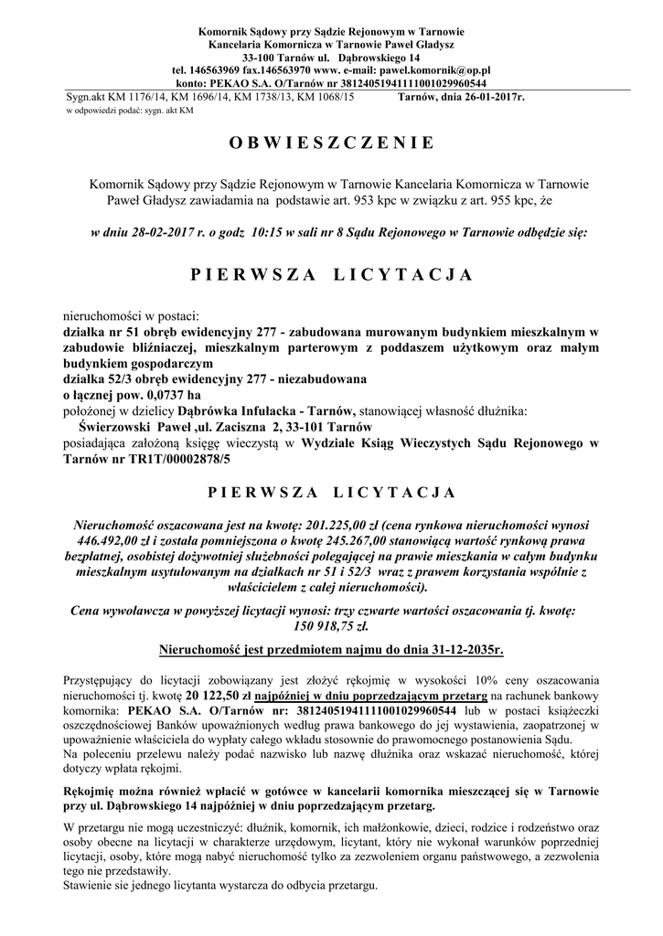 Komornik Sądowy przy Sądzie Rejonowym w Tarnowie Kancelaria Komornicza w Tarnowie Paweł Gładysz 33-100 Tarnów ul. Dąbrowskiego 14 tel. 146563969 fax.146563970 www. e-mail: [email protected] konto: PEKAO S.A. O/Tarnów nr 38124051941111001029960544 Sygn.akt KM 1176/14, KM 1696/14, KM 1738/13, KM 1068/15 Tarnów, dnia 26-01-2017r. w odpowiedzi podać: sygn. akt KM OBWIESZCZENIE Komornik Sądowy przy Sądzie Rejonowym w Tarnowie Kancelaria Komornicza w Tarnowie Paweł Gładysz zawiadamia na podstawie art. 953 kpc w związku z art. 955 kpc, że w dniu 28-02-2017 r. o godz 10:15 w sali nr 8 Sądu Rejonowego w Tarnowie odbędzie się: PIERWSZA LICYTACJA nieruchomości w postaci: działka nr 51 obręb ewidencyjny 277 - zabudowana murowanym budynkiem mieszkalnym w zabudowie bliźniaczej, mieszkalnym parterowym z poddaszem użytkowym oraz małym budynkiem gospodarczym działka 52/3 obręb ewidencyjny 277 - niezabudowana o łącznej pow. 0,0737 ha położonej w dzielicy Dąbrówka Infułacka - Tarnów, stanowiącej własność dłużnika: Świerzowski Paweł ,ul. Zaciszna 2, 33-101 Tarnów posiadająca założoną księgę wieczystą w Wydziale Ksiąg Wieczystych Sądu Rejonowego w Tarnów nr TR1T/00002878/5 PIERWSZA LICYTACJA Nieruchomość oszacowana jest na kwotę: 201.225,00 zł (cena rynkowa nieruchomości wynosi 446.492,00 zł i została pomniejszona o kwotę 245.267,00 stanowiącą wartość rynkową prawa bezpłatnej, osobistej dożywotniej służebności polegającej na prawie mieszkania w całym budynku mieszkalnym usytułowanym na działkach nr 51 i 52/3 wraz z prawem korzystania wspólnie z właścicielem z całej nieruchomości). Cena wywoławcza w powyższej licytacji wynosi: trzy czwarte wartości oszacowania tj. kwotę: 150 918,75 zł. Nieruchomość jest przedmiotem najmu do dnia 31-12-2035r. Przystępujący do licytacji zobowiązany jest złożyć rękojmię w wysokości 10% ceny oszacowania nieruchomości tj. kwotę 20 122,50 zł najpóźniej w dniu poprzedzającym przetarg na rachunek bankowy komornika: PEKAO S.A. O/Tarnów nr: 38124051941111001029960544 lub w postaci książeczki oszczędnościowej Banków upoważnionych według prawa bankowego do jej wystawienia, zaopatrzonej w upoważnienie właściciela do wypłaty całego wkładu stosownie do prawomocnego postanowienia Sądu. Na poleceniu przelewu należy podać nazwisko lub nazwę dłużnika oraz wskazać nieruchomość, której dotyczy wpłata rękojmi. Rękojmię można również wpłacić w gotówce w kancelarii komornika mieszczącej się w Tarnowie przy ul. Dąbrowskiego 14 najpóźniej w dniu poprzedzającym przetarg. W przetargu nie mogą uczestniczyć: dłużnik, komornik, ich małżonkowie, dzieci, rodzice i rodzeństwo oraz osoby obecne na licytacji w charakterze urzędowym, licytant, który nie wykonał warunków poprzedniej licytacji, osoby, które mogą nabyć nieruchomość tylko za zezwoleniem organu państwowego, a zezwolenia tego nie przedstawiły. Stawienie sie jednego licytanta wystarcza do odbycia przetargu. Pełnomocnictwo do udziału w przetargu powinno być stwierdzone dokumentem z podpisem urzędowo poświadczonym. Podpisy na pełnomocnictwach udzielonych przez państwowe jednostki organizacyjne lub jednostki organizacyjne samorządu terytorialnego oraz na pełnomocnictwach udzielonych adwokatom lub radcom prawnym, nie wymagają poświadczenia. Nieruchomość można oglądać w ciągu dwóch tygodni przed licytacją po wcześniejszym uzgodnieniu terminu z komornikiem, elaborat szacunkowy tej nieruchomości znajduje się do wglądu w biurze komornika. Prawa osób trzecich nie będą przeszkodą do przeprowadzenia licytacji i przysądzenia własności na rzecz nabywcy bez zastrzeżeń, jeżeli osoby te przed rozpoczęciem licytacji nie złożą dowodu, iż wniosły powództwo o zwolnienie spod egzekucji tej nieruchomości lub innych przedmiotów razem z nią zajętych i uzyskały w tym zakresie orzeczenie wstrzymujące egzekucję. Użytkowanie, służebności i prawa dożywotnika, jeżeli nie są ujawnione w księdze wieczystej i nie zostaną zgłoszone najpóźniej na trzy dni przed rozpoczęciem licytacji, nie będą uwzględnione w dalszym toku egzekucji i wygasną z chwilą uprawomocnienia się postanowienia o przysądzeniu własności. K O M O R N I K Paweł Gładysz Pouczenie: Zgodnie z art. 767 KPC na czynnosci komornika przysluguje skarga do sadu rejonowego, jezeli ustawa nie stanowi inaczej. Dotyczy to takze zaniechania przez komornika dokonania czynnosci. Do rozpoznania skargi na czynnosci komornika wlasciwy jest sad, przy którym dziala komornik. Jezeli do prowadzenia egzekucji zostal wybrany komornik poza wlasciwoscia ogólna, skarge rozpoznaje sad, który bylby wlasciwy wedlug ogólnych zasad. Skarge moze zlozyc strona lub inna osoba, której prawa zostaly przez czynnosci lub zaniechanie komornika naruszone badz zagrozone. Skarga na czynnosc komornika powinna czynic zadosc wymaganiom pisma procesowego oraz okreslac zaskarzona czynnosc lub czynnosc, której zaniechano, jak równiez wniosek o zmiane, uchylenie lub dokonanie czynnosci wraz z uzasadnieniem. Skarge wnosi sie do sadu w terminie tygodniowym od dnia czynnosci, gdy strona lub osoba, której prawo zostalo przez czynnosc komornika naruszone badz zagrozone, byla przy czynnosci obecna lub byla o jej terminie zawiadomiona, w innych wypadkach – od dnia zawiadomienia o dokonaniu czynnosci strony lub osoby, której prawo zostalo przez czynnosci komornika naruszone badz zagrozone, a w braku zawiadomienia – od dnia dowiedzenia sie przez skarzacego o dokonanej czynnosci. Skarge na zaniechanie przez komornika czynnosci wnosi sie w terminie tygodniowym od dnia, w którym czynnosc powinna byc dokonana.