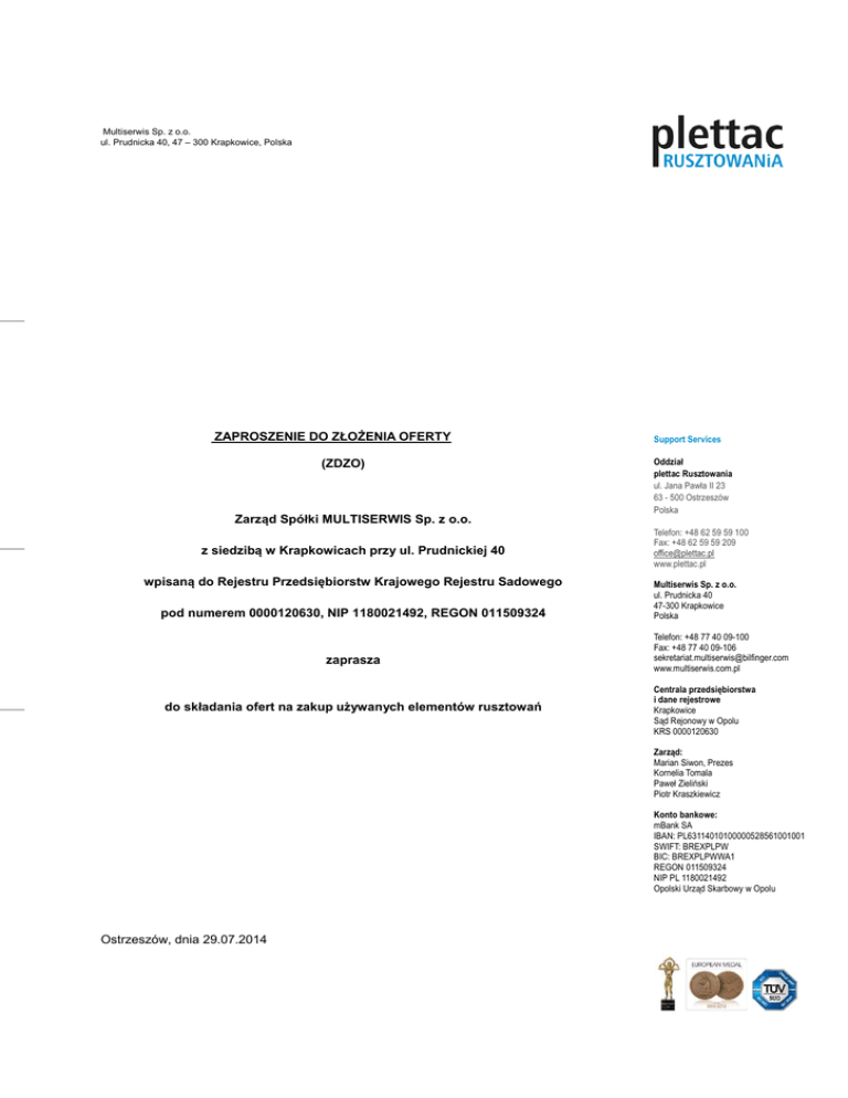 Multiserwis Sp. z o.o. ul. Prudnicka 40, 47 – 300 Krapkowice, Polska ZAPROSZENIE DO ZŁOŻENIA OFERTY (ZDZO) Zarząd Spółki MULTISERWIS Sp. z o.o. z siedzibą w Krapkowicach przy ul. Prudnickiej 40 wpisaną do Rejestru Przedsiębiorstw Krajowego Rejestru Sadowego pod numerem 0000120630, NIP 1180021492, REGON 011509324 zaprasza do składania ofert na zakup używanych elementów rusztowań Support Services Oddział plettac Rusztowania ul. Jana Pawła II 23 63 - 500 Ostrzeszów Polska Telefon: +48 62 59 59 100 Fax: +48 62 59 59 209 [email protected] www.plettac.pl Multiserwis Sp. z o.o. ul. Prudnicka 40 47-300 Krapkowice Polska Telefon: +48 77 40 09-100 Fax: +48 77 40 09-106 [email protected] www.multiserwis.com.pl Centrala przedsiębiorstwa i dane rejestrowe Krapkowice Sąd Rejonowy w Opolu KRS 0000120630 Zarząd: Marian Siwon, Prezes Kornelia Tomala Paweł Zieliński Piotr Kraszkiewicz Konto bankowe: mBank SA IBAN: PL63114010100000528561001001 SWIFT: BREXPLPW BIC: BREXPLPWWA1 REGON 011509324 NIP PL 1180021492 Opolski Urząd Skarbowy w Opolu Ostrzeszów, dnia 29.07.2014 Page 2 / 3 1. PRZEDMIOT SPRZEDAŻY: Sprzedaży podlegają używane elementy rusztowań systemu typu plettac SL70 opisane szczegółowo w załączniku nr 1 ZDZO. Przedmiot przetargu można obejrzeć w siedzibie Oddziału plettac Rusztowania mieszczącej się w Ostrzeszowie przy ul. Jana Pawła II 23. Termin oględzin należy ustalić wcześniej z p. Ireneuszem Łopata tel. 606 733 004 2. WYMAGANIA JAKIM POWINNA ODPOWIADAĆ OFERTA : 2.1 Oferty należy składać w języku polskim w formie pisemnej. 2.2 Oferta powinna zawierać: - imię i nazwisko, dokładny adres Osoby składającej ofertę dla osoby fizycznej, albo nazwę firmy, jeżeli uczestnikiem jest osoba prawna lub inny podmiot, dokładny adres, NIP, REGON/PESEL (zał.nr 2) - oświadczenie Oferenta, że zapoznał się ze stanem faktycznym i prawnym przedmiotu sprzedaży (zał.nr 2) i zaakceptował wzór Umowy kupna-sprzedaży (zał.nr 3) - proponowaną cenę netto (zał.nr 2) 3. MIEJSCE ORAZ TERMIN SKŁADANIA OFERT: Oferty należy składać w formie mailowej w postaci skanu podpisanego dokumentu na adres: [email protected]. do dnia 14.08.2014 do godz.12.00 z dopiskiem: „Oferta na zakup kompletu rusztowań typu plettac ”. Oferta złożoną przez oferenta drogą mailową jest dla niego wiążąca. Osoby do kontaktu: W sprawach technicznych – Ireneusz Łopata tel. 606 733 004 W sprawach handlowych – Magdalena Śmieińska tel. 606 733 003 Page 3 / 3 4. INNE INFORMACJE 4.1 Sprzedający zastrzega sobie prawo swobodnego wyboru oferty 4.2 Oferent może złożyć tylko jedną ofertę zawierającą jedną ofertę cenową 4.3 Składającemu ofertę nie przysługują żadne roszczenia wobec MULTISERWIS z tytułu przygotowania i złożenia oferty. 4.4 Nabywca jest zobowiązany zapłacić cenę nabycia przelewem na rachunek bankowy mBank SA O/Warszawa 63 11401010 00005285 61001001. 4.5 Wydanie przedmiotu sprzedaży Nabywcy nastąpi po podpisaniu umowy kupna-sprzedaży. Nabywca odbierze zakupiony materiał własnym transportem na podstawie i po podpisaniu Umowy kupna-sprzedaży (załącznik nr 3). 4.6 Sprzedający zastrzega sobie własność sprzedanego materiału do chwili uiszczenia przez Nabywcę ceny nabycia. 4.7 Nabywca otrzyma fakturę VAT na zakupiony materiał. Załączniki do ZDZO: Zał.nr 1 – Specyfikacja materiałowa Zał.nr 2 – Formularz ofertowy + oświadczenie Zał.nr 3 – Wzór umowy kupna-sprzedaży Multiserwis Sp. z o.o. ul. Prudnicka 40, 47 – 300 Krapkowice, Polska Załącznik nr 1 ZDZO SPECYFIKACJA MATERIAŁOWA lp Nazwa elementu Nr katalogowy ALTRAD Support Services Ilość/szt 1 Rama Pionowa SL70, H50 5F SL7 130 03 20 2 Rama Pionowa SL70, H100 5F SL7 130 02 20 3 Rama Pionowa SL70, H150 5F SL7 130 05 10 4 Rama Pionowa SL70, H200 5F SL7 130 04 1 000 5 Stężenie SL L300,H200 5F SNN 600 00 60 6 Stężenie SL L250,H200 5F SNN 600 01 140 7 Stężenie SL L200,H200 5F SNN 600 02 10 8 Stężenie SL L150,H200 5F SNN 600 03 10 9 Dolne Mocowanie Stężenia SL 5F SNN 610 00 20 10 Poręcz SL L300 5F SNN 050 03 600 11 Poręcz SL L250 5F SNN 050 02 1 200 12 Poręcz SL L200 5F SNN 050 01 100 13 Poręcz SL L150 5F SNN 050 00 100 14 Poręcz Czołowa SL70 5F SL7 090 00 100 15 Poręcz Czołowa Podwójna SL70, Sw22 5F SL7 120 00 120 16 Słupek poręczowy SL H100, Bez Zabezp.Podestu 5F SNN 110 00 120 17 Konsola SL B32 Ze Złączem Rurowym Sw22 5F SLN 155 00 200 18 Konsola SL B64 Ze Złączem Rurowym Sw22 5F SLN 160 00 80 19 Zabezpieczenie podestu SL Dla Konsoli B64, H50, Sw22 5F SLN 590 00 100 20 Kotwa L50 5F SNN 240 10 100 21 Kotwa L80 5F SNN 240 05 100 Oddział plettac Rusztowania ul. Jana Pawła II 23 63 - 500 Ostrzeszów Polska Telefon: +48 62 59 59 100 Fax: +48 62 59 59 209 [email protected] www.plettac.pl Multiserwis Sp. z o.o. ul. Prudnicka 40 47-300 Krapkowice Polska Telefon: +48 77 40 09-100 Fax: +48 77 40 09-106 [email protected] www.multiserwis.com.pl Centrala przedsiębiorstwa i dane rejestrowe Krapkowice Sąd Rejonowy w Opolu KRS 0000120630 Zarząd: Marian Siwon, Prezes Kornelia Tomala Paweł Zieliński Piotr Kraszkiewicz Konto bankowe: mBank SA IBAN: PL63114010100000528561001001 SWIFT: BREXPLPW BIC: BREXPLPWWA1 REGON 011509324 NIP PL 1180021492 Opolski Urząd Skarbowy w Opolu Załącznik nr 2 ZDZO FORMULARZ OFERTOWY Imię i nazwisko/nazwa oferenta Adres zamieszkania/siedziba oferenta Tel. NIP, REGON/PESEL Do: Multiserwis Sp. z o.o. Oddział plettac Rusztowania Ul. Jana Pawła II 23, 63-500 Ostrzeszów W odpowiedzi na ogłoszenie przetargu na: „Sprzedaż używanych elementów rusztowań systemu plettac SL 70” Oświadczam/-my, że zapoznaliśmy się z warunkami postępowania przetargowego określonego w ogłoszeniu oraz z treścią wzoru umowy kupna-sprzedaży. Jednocześnie oświadczam/-my, że zapoznaliśmy się ze stanem faktycznym przedmiotu sprzedaży i nie wnosimy co do niego żadnych zastrzeżeń. Akceptuję/-my w całości warunki udziału w po