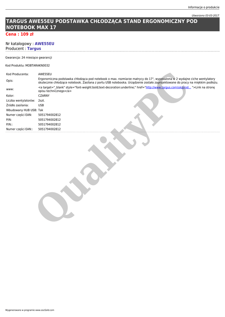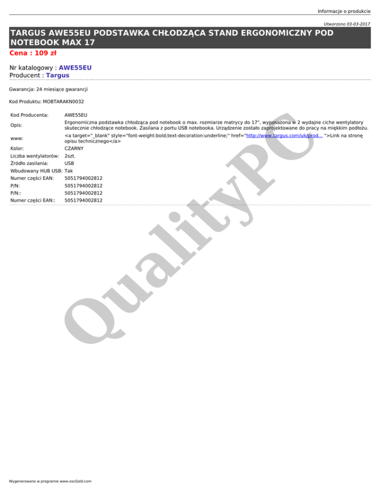 Informacje o produkcie Utworzono 03-03-2017 TARGUS AWE55EU PODSTAWKA CHŁODZĄCA STAND ERGONOMICZNY POD NOTEBOOK MAX 17 Cena : 109 zł Nr katalogowy : AWE55EU Producent : Targus Gwarancja: 24 miesiące gwarancji Kod Produktu: MOBTARAKN0032 AWE55EU Opis: Ergonomiczna podstawka chłodząca pod notebook o max. rozmiarze matrycy do 17", wyposażona w 2 wydajne ciche wentylatory skutecznie chłodzące notebook. Zasilana z portu USB notebooka. Urządzenie zostało zaprojektowane do pracy na miękkim podłożu. www: <a target="_blank" style="font-weight:bold;text-decoration:underline;" href="http://www.targus.com/uk/prod... ">Link na stronę opisu technicznego</a> Kolor: CZARNY Liczba wentylatorów: 2szt. Źródło zasilania: USB 5051794002812 P/N: 5051794002812 P/N:: 5051794002812 Numer części EAN:: 5051794002812 Q ua lit Numer części EAN: yP Wbudowany HUB USB: Tak C Kod Producenta: Wygenerowano w programie www.oscGold.com