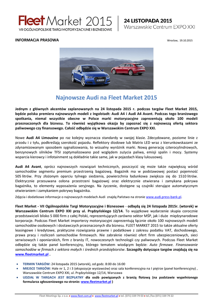 INFORMACJA PRASOWA Wrocław, 19.10.2015 Najnowsze Audi na Fleet Market 2015 Jednym z głównych akcentów zaplanowanych na 24 listopada 2015 r. podczas targów Fleet Market 2015, będzie polska premiera najnowszych modeli z Ingolstadt: Audi A4 i Audi A4 Avant. Podczas tego branżowego spotkania, niemal wszystkie obecne w Polsce marki motoryzacyjne zaprezentują około 100 modeli przeznaczonych dla biznesu. To również wyjątkowa okazja by zapoznać się z najnowszą ofertą sektora paliwowego czy finansowego. Całość odbędzie się w Warszawskim Centrum EXPO XXI. Nowe Audi A4 Limousine po raz kolejny wyznacza standardy w swojej klasie. Zdecydowane, poziome linie z przodu i z tyłu, podkreślają szerokość pojazdu. Reflektory diodowe lub Matrix LED wraz z kierunkowskazami ze zdynamizowanym sposobem sygnalizowania, to wizualny wyróżnik marki. Nową generację czterocylindrowych, benzynowych silników TFSI zoptymalizowano pod względem zużycia paliwa, emisji spalin i mocy. Systemy wsparcia kierowcy i infotainment są dokładnie takie same, jak w pojazdach klasy luksusowej. Audi A4 Avant, oprócz najnowszych rozwiązań technicznych, poszczycić się może także największą wśród samochodów segmentu premium przestrzenią bagażową. Bagażnik ma w podstawowej postaci pojemność 505 litrów. Przy złożonym oparciu tylnego siedzenia, powierzchnia ładunkowa zwiększa się do 1510 litrów. Elektrycznie przesuwana osłona przestrzeni bagażowej oraz elektrycznie otwierana i zamykana pokrywa bagażnika, to elementy wyposażenia seryjnego. Na życzenie, dostępne są czujniki sterujące automatycznym otwieraniem i zamykaniem pokrywy bagażnika. Zdjęcia i dodatkowe informacje o najnowszych modelach Audi znajdą Państwo na stronie www.audi.press-bank.pl. Fleet Market - VII Ogólnopolskie Targi Motoryzacyjne i Biznesowe - odbędą się 24 listopada 2015r. (wtorek) w Warszawskim Centrum EXPO XXI przy ul. Prądzyńskiego 12/14. To wyjątkowe wydarzenie skupia corocznie przedstawicieli blisko 5 000 firm z całej Polski, reprezentujących zarówno sektor MŚP, jak i duże międzynarodowe korporacje. Podczas Fleet Market importerzy motoryzacyjni zaprezentują łącznie około 100 najnowszych modeli samochodów osobowych i dostawczych przeznaczonych dla biznesu. FLEET MARKET 2015 to także aktualne oferty leasingowe i kredytowe, praktyczne rozwiązania prawne i podatkowe z zakresu podatku VAT, dochodowego, prawa pracy i rozliczeń samochodów firmowych. Nie zabraknie również ofert firm ubezpieczeniowych, sieci serwisowych i oponiarskich, firm z branży IT, nowoczesnych technologii czy paliwowych. Podczas Fleet Market odbędzie się także panel konferencyjny, którego tematem wiodącym będzie: Auto firmowe. Finansowanie samochodów w firmach z sektora małych i średnich przedsiębiorstw. Szczegóły dotyczące targów znajdują się na www.fleetmarket.pl . TERMIN TARGÓW: 24 listopada 2015 (wtorek), od godz. 8:00 do 16:00 MIEJSCE TARGÓW: Hale nr 1, 2 i 3 (ekspozycje wystawców) oraz sala konferencyjna na I piętrze (panel konferencyjny) , Warszawskie Centrum EXPO XXI, ul. Prądzyńskiego 12/14, Warszawa UDZIAŁ W TARGACH JEST BEZPŁATNY dla osób powiązanych z branżą flotową (na podstawie wypełnionego formularza zgłoszeniowego na stronie: www.fleetmarket.pl ) Fleet Meetings Sp. z o.o. www.fleet.com.pl www.fleetmarket.pl tel. (071) 339 79 03 tel./fax (071) 339 79 22 Targi Fleet Market to wydarzenie skierowane wyłącznie dla przedstawicieli firm, które są obecnymi lub potencjalnymi nabywcami samochodów do firm. Na targi zapraszane są osoby szukające zarówno jednego samochodu do prowadzenia działalności biznesowej, jak ci, którzy poszukują pojazdów do flot liczących od kilkudziesięciu do kilkuset aut. Szczegółowe informacje na temat targów Fleet Market, nowości motoryzacyjnych, premier samochodowych, panelu konferencyjnego, a także formularz zgłoszeniowy - dostępne są na stronie: www.fleetmarket.pl Zapraszamy! WYSTAWCY FLEET MARKET 2015 KONTAKT DO ORGANIZATORA: ORGANIZACJA TARGÓW Małgorzata Mikołajczyk mał[email protected] kom. +48 666 373 920 tel. + 48 (71) 750 18 58 DZIAŁANIA MARKETINGOWE I PR Dominika Wejksznia [email protected] kom. +48 668 400 633 tel. 48 (71) 339 79 03 REDAKCJA MAGAZYNU FLEET Tomasz Siwiński [email protected] kom.: +48 668 353 040 tel. +48 (71) 339 79 03 Fleet Meetings Sp. z o.o. www.fleet.com.pl www.fleetmarket.pl tel. (071) 339 79 03 tel./fax (071) 339 79 22