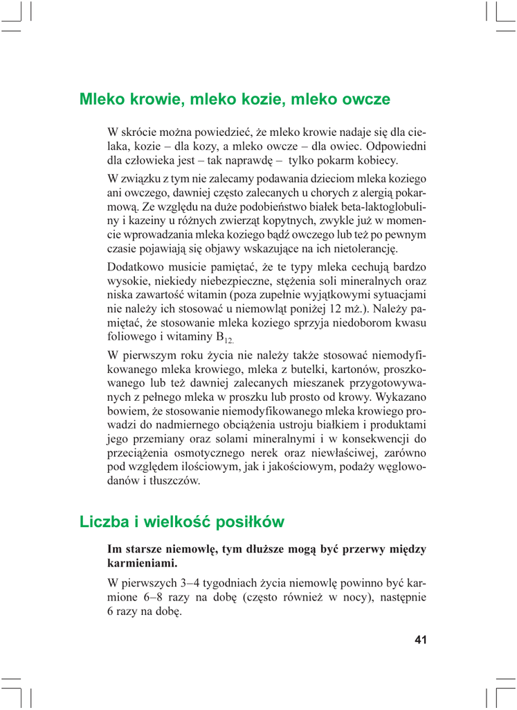 Mleko krowie, mleko kozie, mleko owcze W skrócie mo¿na powiedzieæ, ¿e mleko krowie nadaje siê dla cielaka, kozie – dla kozy, a mleko owcze – dla owiec. Odpowiedni dla cz³owieka jest – tak naprawdê – tylko pokarm kobiecy. W zwi¹zku z tym nie zalecamy podawania dzieciom mleka koziego ani owczego, dawniej czêsto zalecanych u chorych z alergi¹ pokarmow¹. Ze wzglêdu na du¿e podobieñstwo bia³ek beta-laktoglobuliny i kazeiny u ró¿nych zwierz¹t kopytnych, zwykle ju¿ w momencie wprowadzania mleka koziego b¹dŸ owczego lub te¿ po pewnym czasie pojawiaj¹ siê objawy wskazuj¹ce na ich nietolerancjê. Dodatkowo musicie pamiêtaæ, ¿e te typy mleka cechuj¹ bardzo wysokie, niekiedy niebezpieczne, stê¿enia soli mineralnych oraz niska zawartoœæ witamin (poza zupe³nie wyj¹tkowymi sytuacjami nie nale¿y ich stosowaæ u niemowl¹t poni¿ej 12 m¿.). Nale¿y pamiêtaæ, ¿e stosowanie mleka koziego sprzyja niedoborom kwasu foliowego i witaminy B12. W pierwszym roku ¿ycia nie nale¿y tak¿e stosowaæ niemodyfikowanego mleka krowiego, mleka z butelki, kartonów, proszkowanego lub te¿ dawniej zalecanych mieszanek przygotowywanych z pe³nego mleka w proszku lub prosto od krowy. Wykazano bowiem, ¿e stosowanie niemodyfikowanego mleka krowiego prowadzi do nadmiernego obci¹¿enia ustroju bia³kiem i produktami jego przemiany oraz solami mineralnymi i w konsekwencji do przeci¹¿enia osmotycznego nerek oraz niew³aœciwej, zarówno pod wzglêdem iloœciowym, jak i jakoœciowym, poda¿y wêglowodanów i t³uszczów. Liczba i wielkoœæ posi³ków Im starsze niemowlê, tym d³u¿sze mog¹ byæ przerwy miêdzy karmieniami. W pierwszych 3–4 tygodniach ¿ycia niemowlê powinno byæ karmione 6–8 razy na dobê (czêsto równie¿ w nocy), nastêpnie 6 razy na dobê. 41 Poczynaj¹c od 5 m¿. niemowlê karmione jest zwykle 5 razy na dobê, a od 10 m¿. 4 razy na dobê (posi³ki zasadnicze). Starsze dzieci, zw³aszcza Ÿle jedz¹ce, mog¹ byæ karmione nawet 3 razy na dobê, ale pod kontrol¹ stanu od¿ywienia (wykreœlanie krzywej masy cia³a i wzrostu na siatkach centylowych i ich analiza w czasie porad u lekarza). Wielkoœæ porcji w pierwszych 10 dniach ¿ycia mo¿na obliczyæ wed³ug wzoru: Wielkoœæ porcji (w ml) = 10 × (dzieñ ¿ycia – 1) Przyk³ad: noworodek 10-dniowy powinien otrzymaæ 10 × (10–1) = = 90 ml mleka modyfikowanego na ka¿dy posi³ek. Wielkoœæ porcji po tym okresie mo¿na orientacyjnie obliczyæ pos³uguj¹c siê nastêpuj¹cym wzorem: Wielkoœæ porcji (w ml) = 100 + (miesi¹c ¿ycia × 10) Przyk³ad: niemowlê 4-miesiêczne powinno otrzymaæ: 100 + + (4 × 10) = 140 ml na ka¿dy posi³ek. Zasady wprowadzania nowych pokarmów do diety dziecka Kiedy? Dlaczego? Jakie produkty? 42 Pierwszym niemlecznym „posi³kiem” w warunkach polskich jest sok jab³kowy, jab³ko skrobane lub przecier jab³kowy (s¹ one ma³o alergizuj¹ce i poprawiaj¹ jakoœæ stolca). Podobn¹ rolê mo¿e pe³niæ sok marchwiowy. Wstêpem do zupy jarzynowej jest zwykle kaszka kukurydziana lub ry¿owa na wywarze z jarzyn. Zupê jarzynow¹ wprowadza siê do diety ok. 4–6 miesi¹ca ¿ycia. Zalecenie to wynika z wzrastaj¹cego zapotrzebowania na pewne sk³adniki od¿ywcze, których samo mleko nie mo¿e ju¿ na ogó³ pokryæ oraz z faktu, ¿e prawie wszystkie niemowlêta osi¹gaj¹ w tym okresie tak¹ wydolnoœæ i dojrza³oœæ mechanizmów trawienia i wch³aniania sk³adników od¿ywczych, która pozwala na wprowadzenie nowych pokarmów. Nerki dojrzewaj¹ w tym czasie – tak¿e pod wzglêdem czynnoœciowym – przynajmniej na tyle, aby podo³aæ zwiêkszonemu obci¹¿eniu osmotycznemu zwi¹zanemu z nowym sposobem od¿ywiania. W tym wieku, u wiêkszoœci niemowl¹t, rozwija siê równie¿ umiejêtnoœæ przyjmowania pokarmów sta³ych. Potrafi¹ ju¿ siedzieæ z podparciem, osi¹gaj¹ tak¿e dojrza³oœæ nerwowo-miêœniow¹ pozwalaj¹c¹ na kontrolowanie ruchów g³owy i szyi oraz na jedzenie z ³y¿eczki. Zanika tak¿e odruch usuwania z ust cia³ obcych (typowy dla okresu noworodkowego i wczesnoniemowlêcego) utrudniaj¹cy karmienie pokarmami innymi ni¿ p³ynne. Zupê jarzynow¹ wprowadza siê miêdzy innymi w celu: a) dostarczenia dodatkowej energii, ¿elaza, witamin oraz pierwiastków œladowych, b)aprzygotowania niemowlêcia do bardziej urozmaiconej diety w póŸniejszym okresie ¿ycia. Przy w³¹czaniu nowych pokarmów do diety dziecka powinnaœ przestrzegaæ nastêpuj¹cych zasad: Wprowadzaj je stopniowo co 7–10 dni, w powoli zwiêkszaj¹cych siê porcjach, tak abyœ w razie wyst¹pienia objawów nietolerancji mog³a ³atwo ustaliæ ich Ÿród³o i ewentualnie skorygowaæ dietê. Nie wprowadzaj kilku nowych produktów równoczeœnie. Kolejnoœæ wprowadzania nowych produktów, z pewnymi wyj¹tkami (jak np. pokarmy alergizuj¹ce lub gluten), ma mniejsze znaczenie. Etapem wstêpnym do wprowadzenia zupy jarzynowej mog¹ byæ bezglutenowe kaszki zbo¿owe (np. kaszka ry¿owa, kukurydziana, gryczana) przygotowywane na wywarze z jarzyn. Gotowe produkty tego typu powinny byæ wzbogacane w ¿elazo (obecnie dostêpne s¹ równie¿ w Polsce). W Polsce zaleca siê, aby produkty zawieraj¹ce gluten (m¹ka, kasza manna, grysiki zbo¿owe, sucharki itp.) podawane by³y 43 dzieciom dopiero w 10 m¿. Ta tzw. profilaktyka bezglutenowa chroni Twoje dziecko jedynie przed wyst¹pieniem objawów tzw. kwitn¹cej celiakii (utrata ³aknienia, postêpuj¹cy ubytek masy cia³a, obfite, cuchn¹ce i t³uszczowe stolce), czyli wrodzonej nietolerancji glutenu, nie chroni natomiast przed ujawnieniem siê celiakii w póŸniejszym wieku (czêsto o nietypowym lub sk¹poobjawowym przebiegu!). Produkty o silnych w³aœciwoœciach alergizuj¹cych powinnaœ wprowadzaæ dopiero ok. 10–12 m¿. Nale¿¹ do nich: owoce cytrusowe i po³udniowe (cytryny, pomarañcze, mandarynki, banany); truskawki, poziomki; bia³ko jaja kurzego; wywary z miêsa; pomidory. Owoce zwykle niealergizuj¹ce to: jab³ka, morele, brzos