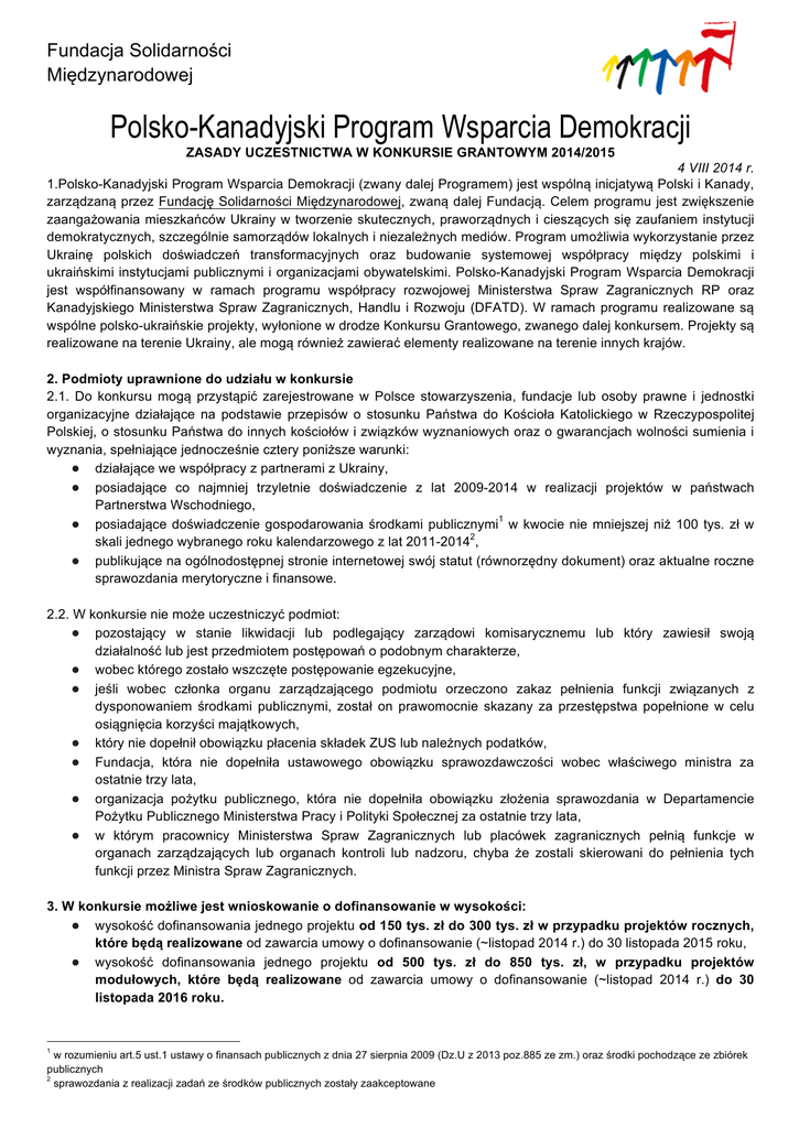 Fundacja Solidarności Międzynarodowej Polsko-Kanadyjski Program Wsparcia Demokracji ZASADY UCZESTNICTWA W KONKURSIE GRANTOWYM 2014/2015 4 VIII 2014 r. 1.Polsko-Kanadyjski Program Wsparcia Demokracji (zwany dalej Programem) jest wspólną inicjatywą Polski i Kanady, zarządzaną przez Fundację Solidarności Międzynarodowej, zwaną dalej Fundacją. Celem programu jest zwiększenie zaangażowania mieszkańców Ukrainy w tworzenie skutecznych, praworządnych i cieszących się zaufaniem instytucji demokratycznych, szczególnie samorządów lokalnych i niezależnych mediów. Program umożliwia wykorzystanie przez Ukrainę polskich doświadczeń transformacyjnych oraz budowanie systemowej współpracy między polskimi i ukraińskimi instytucjami publicznymi i organizacjami obywatelskimi. Polsko-Kanadyjski Program Wsparcia Demokracji jest współfinansowany w ramach programu współpracy rozwojowej Ministerstwa Spraw Zagranicznych RP oraz Kanadyjskiego Ministerstwa Spraw Zagranicznych, Handlu i Rozwoju (DFATD). W ramach programu realizowane są wspólne polsko-ukraińskie projekty, wyłonione w drodze Konkursu Grantowego, zwanego dalej konkursem. Projekty są realizowane na terenie Ukrainy, ale mogą również zawierać elementy realizowane na terenie innych krajów. 2. Podmioty uprawnione do udziału w konkursie 2.1. Do konkursu mogą przystąpić zarejestrowane w Polsce stowarzyszenia, fundacje lub osoby prawne i jednostki organizacyjne działające na podstawie przepisów o stosunku Państwa do Kościoła Katolickiego w Rzeczypospolitej Polskiej, o stosunku Państwa do innych kościołów i związków wyznaniowych oraz o gwarancjach wolności sumienia i wyznania, spełniające jednocześnie cztery poniższe warunki: ● działające we współpracy z partnerami z Ukrainy, ● posiadające co najmniej trzyletnie doświadczenie z lat 2009-2014 w realizacji projektów w państwach Partnerstwa Wschodniego, ● posiadające doświadczenie gospodarowania środkami publicznymi1 w kwocie nie mniejszej niż 100 tys. zł w 2 skali jednego wybranego roku kalendarzowego z lat 2011-2014 , ● publikujące na ogólnodostępnej stronie internetowej swój statut (równorzędny dokument) oraz aktualne roczne sprawozdania merytoryczne i finansowe. 2.2. W konkursie nie może uczestniczyć podmiot: ● pozostający w stanie likwidacji lub podlegający zarządowi komisarycznemu lub który zawiesił swoją działalność lub jest przedmiotem postępowań o podobnym charakterze, ● wobec którego zostało wszczęte postępowanie egzekucyjne, ● jeśli wobec członka organu zarządzającego podmiotu orzeczono zakaz pełnienia funkcji związanych z dysponowaniem środkami publicznymi, został on prawomocnie skazany za przestępstwa popełnione w celu osiągnięcia korzyści majątkowych, ● który nie dopełnił obowiązku płacenia składek ZUS lub należnych podatków, ● Fundacja, która nie dopełniła ustawowego obowiązku sprawozdawczości wobec właściwego ministra za ostatnie trzy lata, ● organizacja pożytku publicznego, która nie dopełniła obowiązku złożenia sprawozdania w Departamencie Pożytku Publicznego Ministerstwa Pracy i Polityki Społecznej za ostatnie trzy lata, ● w którym pracownicy Ministerstwa Spraw Zagranicznych lub placówek zagranicznych pełnią funkcje w organach zarządzających lub organach kontroli lub nadzoru, chyba że zostali skierowani do pełnienia tych funkcji przez Ministra Spraw Zagranicznych. 3. W konkursie możliwe jest wnioskowanie o dofinansowanie w wysokości: ● wysokość dofinansowania jednego projektu od 150 tys. zł do 300 tys. zł w przypadku projektów rocznych, które będą realizowane od zawarcia umowy o dofinansowanie (~listopad 2014 r.) do 30 listopada 2015 roku, ● wysokość dofinansowania jednego projektu od 500 tys. zł do 850 tys. zł, w przypadku projektów modułowych, które będą realizowane od zawarcia umowy o dofinansowanie (~listopad 2014 r.) do 30 listopada 2016 roku. 1 w rozumieniu art.5 ust.1 ustawy o finansach publicznych z dnia 27 sierpnia 2009 (Dz.U z 2013 poz.885 ze zm.) oraz środki pochodzące ze zbiórek publicznych 2 sprawozdania z realizacji zadań ze środków publicznych zostały zaakceptowane W uzasadnionych przypadkach termin realizacji projektu może być przedłużony o dwa miesiące. 4. Konkurs podzielony jest na dwie ścieżki grantowe: ● Demokracja lokalna - łączna suma dofinansowania 5,4 mln zł (w tym do 2,4 mln zł na projekty modułowe w latach 2015-2016), ● Niezależne media - łączna suma dofinansowania 3,1 mln zł (w tym do 1,6 mln zł na projekty modułowe w latach 2015-2016). W przypadku projektów, których realizacja przewiduje wsparcie w różnych ścieżkach grantowych, należy wskazać na etapie składania wniosku, której ścieżki grantowej projekt dotyczy w większym stopniu. O skierowaniu wniosku do danej Komisji Grantowej decyduje Zarząd Fundacji. Wysokość dofinansowania dla poszczególnych ścieżek grantowych może ulec zmianie przy zachowaniu łącznej sumy dofinansowania. W razie potrzeby dopuszcza się możliwość ogłoszenia dodatkowej rundy konkursu grantowego. 5. Terminy składania wniosków 5.1. Wnioski składane są dwuetapowo. W pierwszym etapie składane są wnioski wstępne (listy intencyjne) rozumiane w niniejszym konkursie jako pierwsza oferta realizacji projektu, sporządzona według wytycznych z regulaminu konkursu. W drugim etapie składane są wnioski pełne, stanowiące rozwinięcie wniosku wstępnego i rozumiane w niniejszym konkursie jako druga oferta realizacji projektu składana przez wnioskodawców wyłonionych przez Komisję Grantową po ocenie wniosków wstępnych sporządzona według wytycznych z regulaminu konkursu. 5.2. Terminy składania wniosków: • wnioski wstępne (listy intencyjne): do 8 września 2014 r. do godz. 13.00 • wnioski pełne: 30 dni od dnia ogłoszenia wyników oceny wniosków wstępnych na stronie internetowej Fundacji Solida