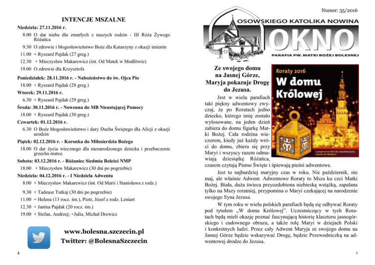 Numer: 35/2016 INTENCJE MSZALNE Niedziela: 27.11.2016 r. 8.00 O dar nieba dla zmarłych z naszych rodzin - III Róża Żywego Różańca 9.30 O zdrowie i błogosławieństwo Boże dla Katarzyny z okazji imienin 11.00 + Ryszard Pajdak (27 greg.) 12.30 + Mieczysław Makarewicz (int. Od Matek w Modlitwie) 19.00 O zdrowie dla Krzysztofa Poniedziałek: 28.11.2016 r. - Nabożeństwo do św. Ojca Pio 18.00 + Ryszard Pajdak (28 greg.) Wtorek: 29.11.2016 r. 6.30 + Ryszard Pajdak (29 greg.) Środa: 30.11.2016 r. - Nowenna do MB Nieustającej Pomocy 18.00 + Ryszard Pajdak (30 greg.) Czwartek: 01.12.2016 r. 6.30 O Boże błogosławieństwo i dary Ducha Świętego dla Alicji z okazji urodzin Piątek: 02.12.2016 r. - Koronka do Miłosierdzia Bożego 18.00 O dar życia wiecznego dla nienarodzonego dziecka i przebaczenie grzechu matce. Sobota: 03.12.2016 r. - Różaniec Siedmiu Boleści NMP 18.00 + Mieczysław Makarewicz (30 dni po pogrzebie) Niedziela: 04.12.2016 r. - I Niedziela Adwentu 8.00 + Mieczysław Makarewicz (int. Od Marii i Stanisława z rodz.) 9.30 + Tadeusz Tutkaj (30 dni po pogrzebie) 11.00 + Helena (13 rocz. śm.), Piotr, Józef z rodz. Leniart 12.30 + Janina Pajdak (20 rocz. śm.) 19.00 + Stefan, Andrzej; +Julia, Michał Drewicz www.bolesna.szczecin.pl Twitter: @BolesnaSzczecin 4 Ze swojego domu na Jasnej Górze, Maryja pokazuje Drogę do Jezusa. Jest w wielu parafiach taki piękny adwentowy zwyczaj, że po Roratach jedno dziecko, którego imię zostało wylosowane, na jeden dzień zabiera do domu figurkę Matki Bożej. Cała rodzina wieczorem, kiedy już każdy wróci do domu, zbiera się przy Maryi i wszyscy razem odmawiają dziesiątkę Różańca, czasem czytają Pismo Święte i śpiewają pieśni adwentowe. Jest to najbardziej maryjny czas w roku. Nie październik, nie maj, ale właśnie Adwent. Adwentowe Roraty to Msza ku czci Matki Bożej. Biała, duża świeca przyozdobiona niebieską wstążką, zapalana tylko na Mszy roratniej, przypomina o Maryi czekającej na narodzenie swojego Syna Jezusa. W tym roku w wielu polskich parafiach będą się odbywać Roraty pod tytułem „W domu Królowej”. Uczestniczący w tych Roratach będą mieli okazję poznać fascynującą historię klasztoru jasnogórskiego i cudownego obrazu, a także rolę Maryi w dziejach Polski i konkretnych ludzi. Przez cały Adwent Maryja ze swojego domu na Jasnej Górze będzie wskazywać Drogę, będzie Przewodniczką na adwentowej drodze do Jezusa. 1 Liturgia słowa - I Niedziela Adwentu I czytanie: (Iz 2,1-5) Widzenie Izajasza, syna Amosa, dotyczące Judy i Jerozolimy: Stanie się na końcu czasów, że góra świątyni Pana stanie mocno na wierzchu gór i wystrzeli ponad pagórki. Wszystkie narody do niej popłyną, mnogie ludy pójdą i rzekną: Chodźcie, wstąpmy na Górę Pana do świątyni Boga Jakubowego! Niech nas nauczy dróg swoich, byśmy kroczyli Jego ścieżkami. Bo Prawo wyjdzie z Syjonu i słowo Pańskie - z Jeruzalem. On będzie rozjemcą pomiędzy ludami i wyda wyroki dla licznych narodów. Wtedy swe miecze przekują na lemiesze, a swoje włócznie na sierpy. Naród przeciw narodowi nie podniesie miecza, nie będą się więcej zaprawiać do wojny. Chodźcie, domu Jakuba, postępujmy w światłości Pańskiej! II czytanie: (Rz 13,11-14) Rozumiejcie chwilę obecną: teraz nadeszła dla was godzina powstania ze snu. Teraz bowiem zbawienie jest bliżej nas, niż wtedy, gdyśmy uwierzyli. Noc się posunęła, a przybliżył się dzień. Odrzućmy więc uczynki ciemności, a przyobleczmy się w zbroję światła. żyjmy przyzwoicie jak w jasny dzień: nie w hulankach i pijatykach, nie w rozpuście i wyuzdaniu, nie w kłótni i zazdrości. Ale przyobleczcie się w Pana Jezusa Chrystusa i nie troszczcie się zbytnio o ciało, dogadzając żądzom. Ewangelia: (Mt 24,37-44) Jezus powiedział do swoich uczniów: Jak było za dni Noego, tak będzie z przyjściem Syna Człowieczego. Albowiem jak w czasie przed potopem jedli i pili, żenili się i za mąż wydawali aż do dnia, kiedy Noe wszedł do arki, i nie spostrzegli się, aż przyszedł potop i pochłonął wszystkich, tak również będzie z przyjściem Syna Człowieczego. Wtedy dwóch będzie w polu: jeden będzie wzięty, drugi zostawiony. Dwie będą mleć na żarnach: jedna będzie wzięta, druga zostawiona. Czuwajcie więc, bo nie wiecie, w którym dniu Pan wasz przyjdzie. A to rozumiejcie: Gdyby gospodarz wiedział, o której porze nocy złodziej ma przyjść, na pewno by czuwał i nie pozwoliłby włamać się do swego domu. Dlatego i wy bądźcie gotowi, bo w chwili, której się nie domyślacie, Syn Człowieczy przyjdzie. Darowizna na cele kultu religijnego (tytuł wpłaty) Nr konta bankowego: 86 2490 0005 0000 4530 1371 3267 Parafia pw. Matki Bożej Bolesnej ul. Miodowa 36 a 71-497 Szczecin 2 Ogłoszenia duszpasterskie - 27.11.2016 r. 1. Dzisiejszą niedzielą rozpoczynamy Adwent – czas naszego przygotowania na spotkanie z przychodzącym Chrystusem, Zbawicielem Świata. Dzieci i młodzież wraz z rodzicami zapraszamy na Roraty we wtorek i czwartek o godz. 630. Po wspólnej modlitwie rodzice dzieci pierwszokomunijnych zapraszają wszystkich na wspólne śniadanie do domu parafialnego.1 W Adwencie ze względu, że we wtorek i czwartek są Roraty nie będzie Mszy św. o godz. 1800. Msze św. w inne dni tygodnia są bez zmian. 2.Dzisiaj podczas każdej Mszy św. zostaną poświęcone opłatki na stół wigilijny. Opłatki można nabyć w kościele we wszystkie niedziele Adwentu oraz w tygodniu przed lub po Mszy św. 3. Zapraszamy na nabożeństwa w naszym kościele: Modlitwa za zmarłych tzw. „wypominki” odprawiane są w naszym kościele dzisiaj o godz. 1830, a poniedziałek i środę po Mszy św. Ze względu na to, że we wtorek nie ma Mszy św. o godz. 1800 karty wypominkowe z tego dnia odczytane będą w środę. Dziękuję za składane przy okazji ofiary; Nabożeństwo do świętego ojca Pio w poniedziałek przed Mszą św. wiecz