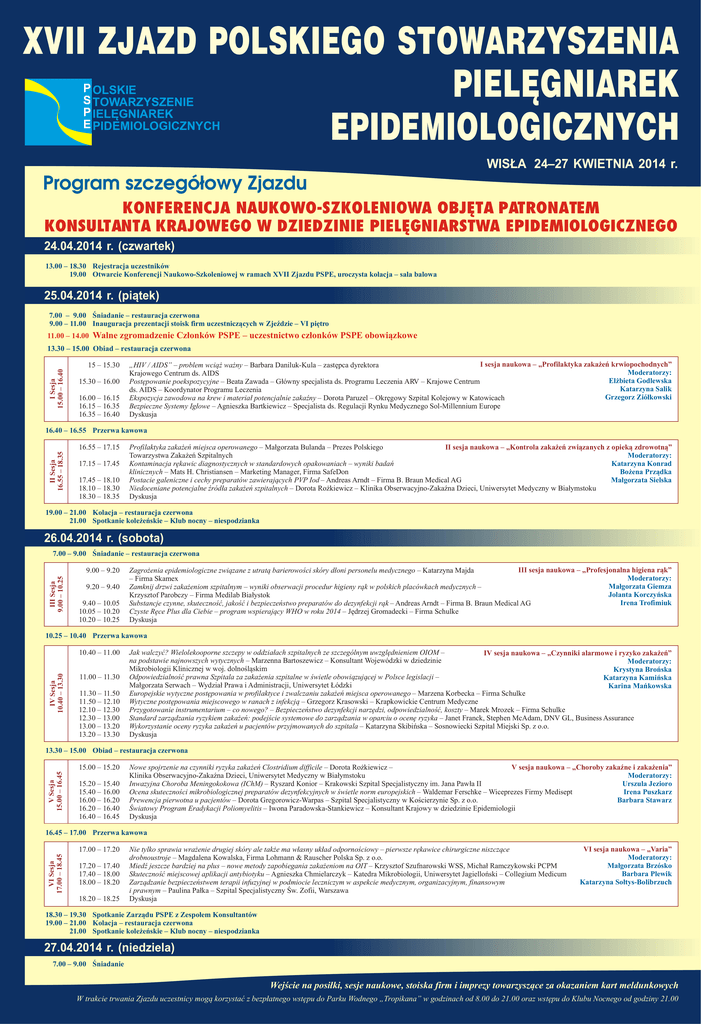 XVII ZJAZD POLSKIEGO STOWARZYSZENIA PIELÊGNIAREK EPIDEMIOLOGICZNYCH OLSKIE TOWARZYSZENIE IELÊGNIAREK PIDEMIOLOGICZNYCH WIS£A 24–27 KWIETNIA 2014 r. KONFERENCJA NAUKOWO-SZKOLENIOWA OBJÊTA PATRONATEM KONSULTANTA KRAJOWEGO W DZIEDZINIE PIELÊGNIARSTWA EPIDEMIOLOGICZNEGO 24.04.2014 r. (czwartek) 13.00 – 18.30 Rejestracja uczestników 19.00 Otwarcie Konferencji Naukowo-Szkoleniowej w ramach XVII Zjazdu PSPE, uroczysta kolacja – sala balowa 25.04.2014 r. (pi¹tek) 7.00 – 9.00 Œniadanie – restauracja czerwona 9.00 – 11.00 Inauguracja prezentacji stoisk firm uczestnicz¹cych w ZjeŸdzie – VI piêtro 11.00 – 14.00 Walne zgromadzenie Cz³onków PSPE – uczestnictwo cz³onków PSPE obowi¹zkowe 13.30 – 15.00 Obiad – restauracja czerwona I Sesja 15.00 – 16.40 15 – 15.30 15.30 – 16.00 16.00 – 16.15 16.15 – 16.35 16.35 – 16.40 I sesja naukowa – „Profilaktyka zaka¿eñ krwiopochodnych” „HIV / AIDS” – problem wci¹¿ wa¿ny – Barbara Daniluk-Kula – zastêpca dyrektora Moderatorzy: Krajowego Centrum ds. AIDS El¿bieta Godlewska Postêpowanie poekspozycyjne – Beata Zawada – G³ówny specjalista ds. Programu Leczenia ARV – Krajowe Centrum Katarzyna Salik ds. AIDS – Koordynator Programu Leczenia Grzegorz Zió³kowski Ekspozycja zawodowa na krew i materia³ potencjalnie zakaŸny – Dorota Paruzel – Okrêgowy Szpital Kolejowy w Katowicach Bezpieczne Systemy Ig³owe – Agnieszka Bartkiewicz – Specjalista ds. Regulacji Rynku Medycznego Sol-Millennium Europe Dyskusja 16.40 – 16.55 Przerwa kawowa II Sesja 16.55 – 18.35 16.55 – 17.15 17.15 – 17.45 17.45 – 18.10 18.10 – 18.30 18.30 – 18.35 Profilaktyka zaka¿eñ miejsca operowanego – Ma³gorzata Bulanda – Prezes Polskiego II sesja naukowa – „Kontrola zaka¿eñ zwi¹zanych z opiek¹ zdrowotn¹” Towarzystwa Zaka¿eñ Szpitalnych Moderatorzy: Kontaminacja rêkawic diagnostycznych w standardowych opakowaniach – wyniki badañ Katarzyna Konrad klinicznych – Mats H. Christiansen – Marketing Manager, Firma SafeDon Bo¿ena Prz¹dka Postacie galeniczne i cechy preparatów zawieraj¹cych PVP Iod – Andreas Arndt – Firma B. Braun Medical AG Ma³gorzata Sielska Niedoceniane potencjalne Ÿród³a zaka¿eñ szpitalnych – Dorota Ro¿kiewicz – Klinika Obserwacyjno-ZakaŸna Dzieci, Uniwersytet Medyczny w Bia³ymstoku Dyskusja 19.00 – 21.00 Kolacja – restauracja czerwona 21.00 Spotkanie kole¿eñskie – Klub nocny – niespodzianka 26.04.2014 r. (sobota) 7.00 – 9.00 Œniadanie – restauracja czerwona III Sesja 9.00 – 10.25 9.00 – 9.20 9.20 – 9.40 9.40 – 10.05 10.05 – 10.20 10.20 – 10.25 III sesja naukowa – „Profesjonalna higiena r¹k” Zagro¿enia epidemiologiczne zwi¹zane z utrat¹ barierowoœci skóry d³oni personelu medycznego – Katarzyna Majda Moderatorzy: – Firma Skamex Ma³gorzata Giemza Zamknij drzwi zaka¿eniom szpitalnym – wyniki obserwacji procedur higieny r¹k w polskich placówkach medycznych – Jolanta Korczyñska Krzysztof Parobczy – Firma Medilab Bia³ystok Irena Trofimiuk Substancje czynne, skutecznoœæ, jakoœæ i bezpieczeñstwo preparatów do dezynfekcji r¹k – Andreas Arndt – Firma B. Braun Medical AG Czyste Rêce Plus dla Ciebie – program wspieraj¹cy WHO w roku 2014 – Jêdrzej Gromadecki – Firma Schulke Dyskusja 10.25 – 10.40 Przerwa kawowa IV Sesja 10.40 – 13.30 10.40 – 11.00 11.00 – 11.30 11.30 – 11.50 11.50 – 12.10 12.10 – 12.30 12.30 – 13.00 13.00 – 13.20 13.20 – 13.30 Jak walczyæ? Wielolekooporne szczepy w oddzia³ach szpitalnych ze szczególnym uwzglêdnieniem OIOM – IV sesja naukowa – „Czynniki alarmowe i ryzyko zaka¿eñ” na podstawie najnowszych wytycznych – Marzenna Bartoszewicz – Konsultant Wojewódzki w dziedzinie Moderatorzy: Mikrobiologii Klinicznej w woj. dolnoœl¹skim Krystyna Broñska Odpowiedzialnoœæ prawna Szpitala za zaka¿enia szpitalne w œwietle obowi¹zuj¹cej w Polsce legislacji – Katarzyna Kamiñska Ma³gorzata Serwach – Wydzia³ Prawa i Administracji, Uniwersytet £ódzki Karina Mañkowska Europejskie wytyczne postêpowania w profilaktyce i zwalczaniu zaka¿eñ miejsca operowanego – Marzena Korbecka – Firma Schulke Wytyczne postêpowania miejscowego w ranach z infekcj¹ – Grzegorz Krasowski – Krapkowickie Centrum Medyczne Przygotowanie instrumentarium – co nowego? – Bezpieczeñstwo dezynfekcji narzêdzi, odpowiedzialnoœæ, koszty – Marek Mrozek – Firma Schulke Standard zarz¹dzania ryzykiem zaka¿eñ: podejœcie systemowe do zarz¹dzania w oparciu o ocenê ryzyka – Janet Franck, Stephen McAdam, DNV GL, Business Assurance Wykorzystanie oceny ryzyka zaka¿eñ u pacjentów przyjmowanych do szpitala – Katarzyna Skibiñska – Sosnowiecki Szpital Miejski Sp. z o.o. Dyskusja 13.30 – 15.00 Obiad – restauracja czerwona V Sesja 15.00 – 16.45 15.00 – 15.20 15.20 – 15.40 15.40 – 16.00 16.00 – 16.20 16.20 – 16.40 16.40 – 16.45 Nowe spojrzenie na czynniki ryzyka zaka¿eñ Clostridium difficile – Dorota Ro¿kiewicz – V sesja naukowa – „Choroby zakaŸne i zaka¿enia” Klinika Obserwacyjno-ZakaŸna Dzieci, Uniwersytet Medyczny w Bia³ymstoku Moderatorzy: Inwazyjna Choroba Meningokokowa (IChM) – Ryszard Konior – Krakowski Szpital Specjalistyczny im. Jana Paw³a II Urszula Jezioro Ocena skutecznoœci mikrobiologicznej preparatów dezynfekcyjnych w œwietle norm europejskich – Waldemar Ferschke – Wiceprezes Firmy Medisept Irena Puszkarz Prewencja pierwotna u pacjentów – Dorota Gregorowicz-Warpas – Szpital Specjalistyczny w Koœcierzynie Sp. z o.o. Barbara Stawarz Œwiatowy Program Eradykacji Poliomyelitis – Iwona Paradowska-Stankiewicz – Konsultant Krajowy w dziedzinie Epidemiologii Dyskusja 16.45 – 17.00 Przerwa kawowa VI Sesja 17.00 – 18.45 17.00 – 17.20 17.20 – 17.40 17.40 – 18.00 18.00 – 18.20 18.20 – 18.25 Nie tylko sprawia wra¿enie drugiej skóry ale tak¿e ma w³asny uk³ad odporn