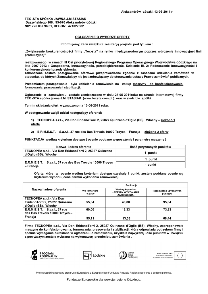 Aleksandrów Łódzki, 13-06-2011 r. TEX -STA SPÓŁKA JAWNA J.M.STASIAK Daszyńskiego 108, 95-070 Aleksandrów Łódzki NIP: 726 037 96 61, REGON: 471027882 OGŁOSZENIE O WYBORZE OFERTY Informujemy, że w związku z realizacją projektu pod tytułem : „Zwiększenie konkurencyjności firmy „Tex-sta” na rynku międzynarodowym poprzez wdrożenie innowacyjnej linii produkcyjnej” realizowanego w ramach III Osi priorytetowej Regionalnego Programu Operacyjnego Województwa Łódzkiego na lata 2007-2013 : Gospodarka, innowacyjność, przedsiębiorczość. Działanie III. 2: Podnoszenie innowacyjności i konkurencyjności przedsiębiorstw, zakończone zostało postępowanie ofertowe przeprowadzone zgodnie z zasadami udzielania zamówień w stosunku, do których Zamawiający nie jest zobowiązany do stosowania ustawy Prawo zamówień publicznych. Przedmiotem postępowania było udzielenie zamówienia na formowania, prasowania i stabilizacji. zakup maszyny do konfekcjonowania, Ogłoszenie o zamówieniu zastało zamieszczone w dniu 27-05-2011roku na stronie internetowej firmy TEX -STA spółka jawna J.M. STASIAK (www.texsta.com.pl ) oraz w siedzibie spółki. Termin składania ofert wyznaczono na 10-06-2011 roku. W postępowaniu wzięli udział następujący oferenci: 1) TECNOPEA s.r.l.-, Via Don EridanoTorri 2, 25027 Quinzano d'Oglio (BS), Włochy – złożono 1 ofertę 2) E.R.M.E.S.T. S.a.r.l., 37 rue des Bas Trevois 10000 Troyes – Francja – złożono 2 oferty PUNKTACJA według kryterium dostępu ( ocenie poddano wyposażenie i parametry maszyny ) Nazwa i adres oferenta TECNOPEA s.r.l.-, Via Don EridanoTorri 2, 25027 Quinzano d'Oglio (BS), Włochy Ilość przyznanych punktów 1 punkt 1 punkt E.R.M.E.S.T. – Francja S.a.r.l., 37 rue des Bas Trevois 10000 Troyes 1 punkt Oferty, które w ocenie według kryterium dostępu uzyskały 1 punkt, zostały poddane ocenie wg kryterium wyboru ( cena, termin wykonania zamówienia) Punktacja Nazwa i adres oferenta TECNOPEA s.r.l.-, Via Don EridanoTorri 2, 25027 Quinzano d'Oglio (BS), Włochy E.R.M.E.S.T. S.a.r.l., 37 rue des Bas Trevois 10000 Troyes – Francja Wg kryterium -CENA- Według kryterium - TERMIN WYKONANIA ZAMÓWIENIA- Razem ilość uzyskanych punktów 55,84 40,00 95,84 60,00 13,33 73,33 55,11 13,33 68,44 Firma TECNOPEA s.r.l., Via Don EridanoTorri 2, 25027 Quinzano d'Oglio (BS)- Włochy, zaproponowała maszynę do konfekcjonowania, formowania, prasowania i stabilizacji, która odpowiada potrzebom firmy i spełnia wymagania określone w ogłoszeniu o zamówieniu, uzyskała najwyższą ilość punktów w związku z powyższym została wybrana na wykonawcę przedmiotu zamówienia . Projekt współfinansowany przez Unię Europejską z Europejskiego Funduszu Rozwoju Regionalnego oraz z budżetu państwa. Fundusze Europejskie dla rozwoju regionu łódzkiego.