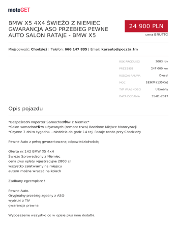 BMW X5 4X4 ŚWIEŻO Z NIEMIEC GWARANCJA ASO PRZEBIEG PEWNE AUTO SALON RATAJE - BMW X5 24 900 PLN cena BRUTTO Miejscowość: Chodzież | Telefon: 666 147 835 | Email: [email protected] 2003 rok 247 000 km Diesel 183KM (135KW) Używany 31-01-2017 Opis pojazdu *Bezpośredni Importer Samochod�łw z Niemiec* *Salon samochod�łw używanych (remont trwa) Rodzinne Miejsce Motoryzacji *Czynne 7 dni w tygodniu - niedziela do godz 14 tej. Rataje rondo przy Chodzieży Pewne Auto z pełną gwarantowaną odpowiedzialnością Oferta nr.142 BMW X5 4x4 Świeżo Sprowadzony z Niemiec cena plus opłaty rejestracyjne 2800 zł wszystko załatwiamy na miejscu autem można wracać na kołach Zadbany egzemplarz ! Pewne Auto. Oryginalny przebieg zgodny z ASO wydruki z TiV gwarancja prawna Wyposażenie wszystko co w opisie plus inne dodatki. Sk�łrzana tapicerka Sk�łrzana kierownica wielofunkcyjna Pełna elektryka Szyberdach dodatkowo hak holowniczy Wizualnie stan dobry Przyciemniane szyby , alufelgi , relingi , Piękny wygląd Dołączyliśmy autentyczne zdjęcia + aktualny opis stworzony do oferty Technicznie bez zastrzeżeń. Prowadzi się bez perfekcyjnie. Przebieg autostradowy Auto prowadzi się idealnie. Gwarancja Mechaniczna + Prawna W skład gwarancji wchodzi Program Firmowy Pewne Auto Serwisowanie , auto zastępcze + Pakiet Korzyści Zdobyta wiedza i doświadczenie pozwalają nam na wystawienie fachowej opinii o danym samochodzie ważne: rok modelowy 2003 produkcja koniec 2002 AUTO ROZLICZENIE - ZAMIANY - WYMIANY - Atrakcyjne warunki Możliwość pozostawienia swojego pojazdu w rozliczeniu RATY - KREDYT LEASING oferta kilku bank�łw jesteśmy AUTORYZOWANYM PARTNEREM Żaden szczeg�łłowy opis oraz zdjęcia nie zastąpią rzetelnej rozmowy Sprzedaż partnerska. Konsultacje , doradztwo Mateusz 666 147 835 Karol Stefaniak 533 133 800 Biuro obsługi - Finansowanie 533 165 165 Magda, Dominika Kontakt mailowy mile widziany Oferta w kraju średnio 150 samochod�łw + oddział w Niemczech Własny import - wsp�łłpraca Polsko - Niemiecka Samochody sprzedajemy z gwarancją wymiany, zamiany, odkupu. #Ponosimy pełną prawną odpowiedzialność za zamieszczone ogłoszenie# Kr�łtko o nas: Firma rodzinna. Pasjonaci kt�łrzy kochają swoją pracę. Pełni ciepła, uwielbiamy dzielić się z innymi swoją pozytywną energią. �€�Wierzymy w to co robimy i uwielbiamy kiedy efekty naszej pracy są widoczne. Najważniejszy dla nas jest uśmiech na twarzy klienta.�€� Ciekawostki z życia firmy ''nie samą pracą człowiek żyje'' Videoprezentacja: relacje na żywo, filmiki, teledysk itp nowinki ciekawostki Udzielamy się społecznie, bierzemy czynny udział w akcjach charytatywnych. Wspieramy Fundacje UKRYTE MARZENIA Wspieramy r�łżnego rodzaju szlachetne cele. Pomagamy sportowcom z powiatu Chodzieskiego. Wspieramy Zesp�łł piłki nożnej Polonia Chodzież Oldboje. Promujemy inne firmy. Organizujemy r�łżnego typy imprezy w regionie. Serdecznie Zapraszamy - bezwypadkowy - serwisowany - ASR - kierownica wielofunkcyjna - przyciemniana szyba - skorzana tapicerka - podgrzewane fotele - ESP - ABS - alufelgi - centr. zamek - el. lusterka - el. szyby - immobiliser - komputer - poduszki - radio z CD - skóra - wsp. kierownicy - tempomat