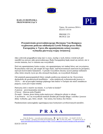 PL RADA EUROPEJSKA PRZEWOD ICZĄCY Ypres, 26 czerwca 2014 r. EUCO 135/14 PRESSE 371 PR PCE 124 Przemówienie przewodniczącego Hermana Van Rompuya wygłoszone podczas odsłonięcia Ławki Pokoju przez Radę Europejską w Ypres dla upamiętnienia setnej rocznicy wybuchu pierwszej wojny światowej Jako człowiek pragnąłbym tutaj stać w ciszy, myśląc o tych, którzy wśród tych pól zamilkli na zawsze; jako przewodniczący Rady Europejskiej będę starał się mówić, nie w swoim imieniu, lecz w imieniu nas wszystkich. Dziś nie upamiętniamy końca wojny, nie upamiętniamy też żadnej bitwy ani zwycięstwa. Rozmyślamy nad tym, jak mogło do tego dojść, nad bezrozumnym marszem ku przepaści, nad tym korowodem lunatyków. A przede wszystkim chcemy uczcić pamięć milionów ofiar, które straciły życie po obu stronach barykady, na wszystkich frontach. Od ostatnich paneuropejskich bitew minęło podówczas niemal sto lat. Oczywiście dochodziło do gwałtownych konfliktów – echo niektórych wybrzmiewało jeszcze w 1914 r. – ale na początku tamtego pięknego lata ludzie w Europie nie mieli zasadniczo pojęcia, czym jest wojna totalna. Patrzymy dziś z murów na miasto. A co było tu kiedyś? Z prawej – prowincjonalna mieścina Z lewej – bitewne pola Flandrii Za nami – brama, przez którą rzeka mężczyzn i chłopców płynie w okopy A na froncie – tu i na wszystkich teatrach działań jak Europa długa i szeroka i jeszcze dalej: wybuchy, gaz, fetor, strach – bez sensu, bez końca, bez litości. Pandemonium samozagłady ogarniającej nasz kontynent cywilizowanych narodów. PRASA Dirk De Backer - rzecznik przewodniczącego - ( +32 (0)2 281 9768 - +32 (0)497 59 99 19 Preben Aamann - zastępca rzecznika przewodniczącego - ( +32 (0)2 281 2060 - +32 (0)476 85 05 43 [email protected] http://www.european-council.europa.eu/the-president EUCO 135/14 1 PL W historii naszych państw pierwsza wojna światowa jest jak pęknięcie. To koniec dotychczasowego świata, koniec imperiów, koniec arystokracji – lecz także niewinnej wiary w postęp, koniec „świata wczorajszego” – jak mówił o nim Stefan Zweig. I nawet jeśli po 1918 roku narodził się nowy świat, pod wieloma względami sprawiedliwszy, to zbiorowe szaleństwo 1914 roku zakończyło się na dobre dopiero w roku 1945, a nawet w 1989. Wspominamy dziś razem niezliczonych poległych, okrutnie okaleczonych i innych rannych oraz osierocone rodziny. Minęły cztery pokolenia, sto lat. Ale nasza pamięć pozostaje nienaruszona. I właśnie tutaj, my, przedstawiciele dwudziestu ośmiu tworzących Unię krajów, chcemy razem to potwierdzić. Jesteśmy strażnikami nieustającej czujności. To my musimy czynami i słowami zatrzymać spiralę i nieustanny wyścig, utrzymać zaufanie, zachować pokój – ten pokój, o którego wieczności można marzyć – Kantowski „wieczny pokój”. Niech zatem ten skromny ogród i ta zwykła okrągła ławka sprzyjająca rozmyślaniom staną się na zawsze symbolem naszej europejskiej rodziny, naszego dążenia do wspólnego szczęśliwego życia w pokoju i otwartości na świat. Niech mi będzie wolno zakończyć słowami holenderskiego poety Leo Vromana: "Kom vanavond met verhalen Hoe de oorlog is verdwenen En herhaal ze honderd malen Alle malen zal ik wenen" Wieczorem przyjdź, historie rzecz O wojnie, której nadszedł kres I choćbyś snuł je setki razy Sto razy spłyną łzy po mej twarzy EUCO 135/14 2 PL
