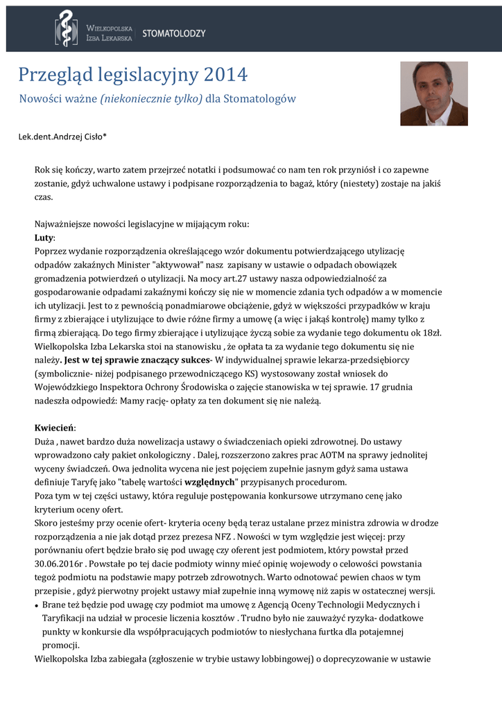 Przegląd legislacyjny 2014 Nowości ważne (niekoniecznie tylko) dla Stomatologów Lek.dent.Andrzej Cisło* Rok się kończy, warto zatem przejrzeć notatki i podsumować co nam ten rok przyniósł i co zapewne zostanie, gdyż uchwalone ustawy i podpisane rozporządzenia to bagaż, który (niestety) zostaje na jakiś czas. Najważniejsze nowości legislacyjne w mijającym roku: Luty: Poprzez wydanie rozporządzenia określającego wzór dokumentu potwierdzającego utylizację odpadów zakaźnych Minister "aktywował" nasz zapisany w ustawie o odpadach obowiązek gromadzenia potwierdzeń o utylizacji. Na mocy art.27 ustawy nasza odpowiedzialność za gospodarowanie odpadami zakaźnymi kończy się nie w momencie zdania tych odpadów a w momencie ich utylizacji. Jest to z pewnością ponadmiarowe obciążenie, gdyż w większości przypadków w kraju firmy z zbierające i utylizujące to dwie różne firmy a umowę (a więc i jakąś kontrolę) mamy tylko z firmą zbierającą. Do tego firmy zbierające i utylizujące życzą sobie za wydanie tego dokumentu ok 18zł. Wielkopolska Izba Lekarska stoi na stanowisku , że opłata ta za wydanie tego dokumentu się nie należy. Jest w tej sprawie znaczący sukces- W indywidualnej sprawie lekarza-przedsiębiorcy (symbolicznie- niżej podpisanego przewodniczącego KS) wystosowany został wniosek do Wojewódzkiego Inspektora Ochrony Środowiska o zajęcie stanowiska w tej sprawie. 17 grudnia nadeszła odpowiedź: Mamy rację- opłaty za ten dokument się nie należą. Kwiecień: Duża , nawet bardzo duża nowelizacja ustawy o świadczeniach opieki zdrowotnej. Do ustawy wprowadzono cały pakiet onkologiczny . Dalej, rozszerzono zakres prac AOTM na sprawy jednolitej wyceny świadczeń. Owa jednolita wycena nie jest pojęciem zupełnie jasnym gdyż sama ustawa definiuje Taryfę jako "tabelę wartości względnych" przypisanych procedurom. Poza tym w tej części ustawy, która reguluje postępowania konkursowe utrzymano cenę jako kryterium oceny ofert. Skoro jesteśmy przy ocenie ofert- kryteria oceny będą teraz ustalane przez ministra zdrowia w drodze rozporządzenia a nie jak dotąd przez prezesa NFZ . Nowości w tym względzie jest więcej: przy porównaniu ofert będzie brało się pod uwagę czy oferent jest podmiotem, który powstał przed 30.06.2016r . Powstałe po tej dacie podmioty winny mieć opinię wojewody o celowości powstania tegoż podmiotu na podstawie mapy potrzeb zdrowotnych. Warto odnotować pewien chaos w tym przepisie , gdyż pierwotny projekt ustawy miał zupełnie inną wymowę niż zapis w ostatecznej wersji. • Brane też będzie pod uwagę czy podmiot ma umowę z Agencją Oceny Technologii Medycznych i Taryfikacji na udział w procesie liczenia kosztów . Trudno było nie zauważyć ryzyka- dodatkowe punkty w konkursie dla współpracujących podmiotów to niesłychana furtka dla potajemnej promocji. Wielkopolska Izba zabiegała (zgłoszenie w trybie ustawy lobbingowej) o doprecyzowanie w ustawie kryteriów podjęcia tej współpracy oraz o zmianę statusu wytycznych do rachunku kosztów z obwieszczenia MZ na rozporządzenie . Te postulaty zostały uwzględnione[!] w ostatecznej wersji ustawy ( jak to bywa w takich razach- nie wiemy na ile to nasza zasługa ale warto zawsze stanąć po stronie lepszego rozwiązania). • Wprowadzono zasadę 5- letnich kontraktów dla lecznictwa ambulatoryjnego. • Wprowadzono też obostrzenie dla podmiotów , które w poprzedzających konkurs 5 latach miały rozwiązaną umowę z NFZ z przyczyn leżących po stronie świadczeniodawcy - oferta takiego podmiotu (w tym zakresie, którego dotyczyło to zerwanie umowy przez NFZ ) będzie z mocy prawa odrzucona. Takie wypowiedzenie umowy przez NFZ to swoisty "wilczy bilet" (rzecz wcale nie nowa w naszym systemie NFZ ) - zapewne podmioty takie będą to obchodzić poprzez zmianę formy prawnej. Ustawa wprowadziła też nowe regulacje jak chodzi o listy oczekujących . Nie umieszcza się na nich od 1.01.2015 osób kontynuujących leczenie w danej placówce . Dalej, zapisy na listę przyjmowane mają być w każdy dzień udzielania świadczeń. Raporty z list oczekujących zawierać mają imiona , nazwiska i pesele oczekujących pacjentów . Raz w tygodniu świadczeniodawca musi powiadomić NFZ w formie raportu o "pierwszym możliwym terminie przyjęcia" . Co do tego ostatniego - naprawdę proszę mnie zwolnić z obowiązku komentarza z uwagi na cokolwiek już przedświąteczny nastrój . To są jakieś "kosmiczne” pomysły mające wywrzeć chyba wrażenie troski o pacjenta ze strony władz publicznych. • Nie będzie możliwe ponowne zażalenie do prezesa NFZ na czynności dyrektora oddziału . • No i wreszcie udało sie Funduszowi dopiąć swego i za którymś podejściem wstawić do ustawy zapis wyłączający obowiązek powiadamiania przedsiębiorców o zamiarze przeprowadzenia kontroli. Od 1.01.2015 (to jest data wejścia w życie ustawy) kontrola NFZ może być nam oznajmiona w momencie jej rozpoczęcia . Lipiec Zakończyły się prace nad nowelizacją ustawy Prawo atomowe. Nowelizacja spowodowana była wyrokiem Trybunału Konstytucyjnego w sprawie ograniczania prawa do wykonywania testów specjalistycznych fizykom medycznym. Przy okazji odbyła się na forum Komisji Zdrowia i specjalnej podkomisji debata nad racjonalnością niektórych obowiązków dotyczących przeprowadzania testów aparatów rtg w stomatologii. Posłowie byli zdania, że należy to od razu ująć w ustawie, ale Biuro Legislacyjne Sejmu sprzeciwiło się wychodzeniu w nowelizacji poza jej ścisłe określony przez wyrok TK przedmiot. Sprawa bynajmniej nie została odłożona ad acta . Porozumienie Stomatologów, którego mam przyjemność być pełnomocnikiem wystosowało we wrześniu do Ministra Zdrowia pismo nakreślające propozycje koniecznych zmian, jeśli nie w samej ustawie, to w rozporządzeniu o bezpiecznym stosowaniu promieniowania jonizującego. Zwró