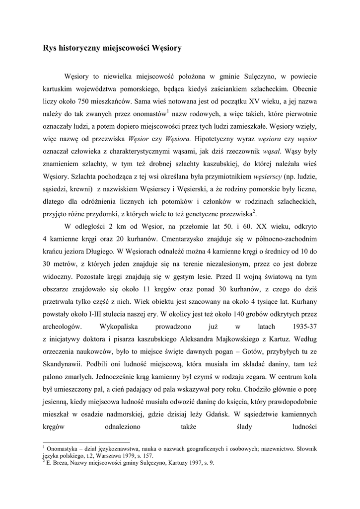 Rys historyczny miejscowości Węsiory Węsiory to niewielka miejscowość położona w gminie Sulęczyno, w powiecie kartuskim województwa pomorskiego, będąca kiedyś zaściankiem szlacheckim. Obecnie liczy około 750 mieszkańców. Sama wieś notowana jest od początku XV wieku, a jej nazwa należy do tak zwanych przez onomastów1 nazw rodowych, a więc takich, które pierwotnie oznaczały ludzi, a potem dopiero miejscowości przez tych ludzi zamieszkałe. Węsiory wzięły, więc nazwę od przezwiska Węsior czy Węsiora. Hipotetyczny wyraz węsiora czy węsior oznaczał człowieka z charakterystycznymi wąsami, jak dziś rzeczownik wąsal. Wąsy były znamieniem szlachty, w tym też drobnej szlachty kaszubskiej, do której należała wieś Węsiory. Szlachta pochodząca z tej wsi określana była przymiotnikiem węsierscy (np. ludzie, sąsiedzi, krewni) z nazwiskiem Węsierscy i Węsierski, a że rodziny pomorskie były liczne, dlatego dla odróżnienia licznych ich potomków i członków w rodzinach szlacheckich, przyjęto różne przydomki, z których wiele to też genetyczne przezwiska2. W odległości 2 km od Węsior, na przełomie lat 50. i 60. XX wieku, odkryto 4 kamienne kręgi oraz 20 kurhanów. Cmentarzysko znajduje się w północno-zachodnim krańcu jeziora Długiego. W Węsiorach odnaleźć można 4 kamienne kręgi o średnicy od 10 do 30 metrów, z których jeden znajduje się na terenie niezalesionym, przez co jest dobrze widoczny. Pozostałe kręgi znajdują się w gęstym lesie. Przed II wojną światową na tym obszarze znajdowało się około 11 kręgów oraz ponad 30 kurhanów, z czego do dziś przetrwała tylko część z nich. Wiek obiektu jest szacowany na około 4 tysiące lat. Kurhany powstały około I-III stulecia naszej ery. W okolicy jest też około 140 grobów odkrytych przez archeologów. Wykopaliska prowadzono już w latach 1935-37 z inicjatywy doktora i pisarza kaszubskiego Aleksandra Majkowskiego z Kartuz. Według orzeczenia naukowców, było to miejsce święte dawnych pogan – Gotów, przybyłych tu ze Skandynawii. Podbili oni ludność miejscową, która musiała im składać daniny, tam też palono zmarłych. Jednocześnie krąg kamienny był czymś w rodzaju zegara. W centrum koła był umieszczony pal, a cień padający od pala wskazywał pory roku. Chodziło głównie o porę jesienną, kiedy miejscowa ludność musiała odwozić daninę do księcia, który prawdopodobnie mieszkał w osadzie nadmorskiej, gdzie dzisiaj leży Gdańsk. W sąsiedztwie kamiennych kręgów 1 odnaleziono także ślady ludności Onomastyka – dział językoznawstwa, nauka o nazwach geograficznych i osobowych; nazewnictwo. Słownik języka polskiego, t.2, Warszawa 1979, s. 157. 2 E. Breza, Nazwy miejscowości gminy Sulęczyno, Kartuzy 1997, s. 9. z epoki brązu, wczesnego żelaza oraz średniowiecza3. Zaskakiwać może fakt, iż to niesamowite odkrycie archeologiczne w Węsiorach nadal nie podlega żadnej ochronie, pomimo, że historyczna wartość tego obiektu podobna jest do wartości Kręgów w Odrach4. Wskutek tego obiekty niszczeją, także z uwagi na niefrasobliwość turystów, zabierających z obszaru „kamienne pamiątki”. Cmentarzyskiem w Węsiorach od 2002 roku opiekuje się Stowarzyszenie Badaczy Kamiennych Kręgów w Gdyni. Fot. 1. Kamienne Kręgi w Węsiorach Źródło: http://hotel-podorlem.com/files/wesiory_-_kamienne_kregi_05.jpg 3 Kronika Szkoły Podstawowej w Węsiorach z roku szkolnego 1999/2000. Wieś pogranicza borowiacko-kaszubskiego w Polsce położona w powiecie chojnickim, w gminie Czersk. 4 w województwie pomorskim, Fot. 2. Podwójny kurhan z brukiem Źródło:http://polskajestfajna.wp.pl/gid,9061914,gpage,2,img,9061921,title,Kamienne-Kregiw-Wesiorach,galeria.html?ticaid=110c35 Opracowała: Marzena Wójcik