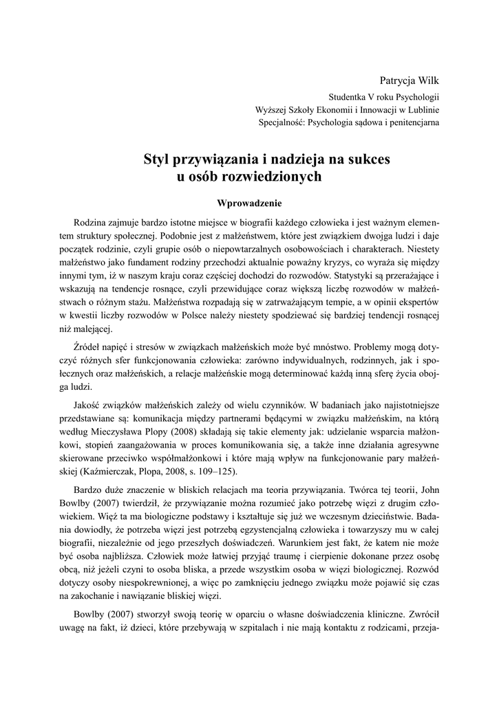 Patrycja Wilk Studentka V roku Psychologii Wyższej Szkoły Ekonomii i Innowacji w Lublinie Specjalność: Psychologia sądowa i penitencjarna Styl przywiązania i nadzieja na sukces u osób rozwiedzionych Wprowadzenie Rodzina zajmuje bardzo istotne miejsce w biografii każdego człowieka i jest ważnym elementem struktury społecznej. Podobnie jest z małżeństwem, które jest związkiem dwojga ludzi i daje początek rodzinie, czyli grupie osób o niepowtarzalnych osobowościach i charakterach. Niestety małżeństwo jako fundament rodziny przechodzi aktualnie poważny kryzys, co wyraża się między innymi tym, iż w naszym kraju coraz częściej dochodzi do rozwodów. Statystyki są przerażające i wskazują na tendencje rosnące, czyli przewidujące coraz większą liczbę rozwodów w małżeństwach o różnym stażu. Małżeństwa rozpadają się w zatrważającym tempie, a w opinii ekspertów w kwestii liczby rozwodów w Polsce należy niestety spodziewać się bardziej tendencji rosnącej niż malejącej. Źródeł napięć i stresów w związkach małżeńskich może być mnóstwo. Problemy mogą dotyczyć różnych sfer funkcjonowania człowieka: zarówno indywidualnych, rodzinnych, jak i społecznych oraz małżeńskich, a relacje małżeńskie mogą determinować każdą inną sferę życia obojga ludzi. Jakość związków małżeńskich zależy od wielu czynników. W badaniach jako najistotniejsze przedstawiane są: komunikacja między partnerami będącymi w związku małżeńskim, na którą według Mieczysława Plopy (2008) składają się takie elementy jak: udzielanie wsparcia małżonkowi, stopień zaangażowania w proces komunikowania się, a także inne działania agresywne skierowane przeciwko współmałżonkowi i które mają wpływ na funkcjonowanie pary małżeńskiej (Kaźmierczak, Plopa, 2008, s. 109–125). Bardzo duże znaczenie w bliskich relacjach ma teoria przywiązania. Twórca tej teorii, John Bowlby (2007) twierdził, że przywiązanie można rozumieć jako potrzebę więzi z drugim człowiekiem. Więź ta ma biologiczne podstawy i kształtuje się już we wczesnym dzieciństwie. Badania dowiodły, że potrzeba więzi jest potrzebą egzystencjalną człowieka i towarzyszy mu w całej biografii, niezależnie od jego przeszłych doświadczeń. Warunkiem jest fakt, że katem nie może być osoba najbliższa. Człowiek może łatwiej przyjąć traumę i cierpienie dokonane przez osobę obcą, niż jeżeli czyni to osoba bliska, a przede wszystkim osoba w więzi biologicznej. Rozwód dotyczy osoby niespokrewnionej, a więc po zamknięciu jednego związku może pojawić się czas na zakochanie i nawiązanie bliskiej więzi. Bowlby (2007) stworzył swoją teorię w oparciu o własne doświadczenia kliniczne. Zwrócił uwagę na fakt, iż dzieci, które przebywają w szpitalach i nie mają kontaktu z rodzicami, przeja- Patrycja Wilk Styl przywiązania i nadzieja na sukces u osób rozwiedzionych wiają zachowania mające charakter lękowy, wrogi i unikający. Twierdził, że takie zachowania pojawiają się, gdy dziecko nie ma zaspokojonej potrzeby bliskości z drugą osobą. Nadzieja od dłuższego czasu traktowana jest jako bardzo ważny bodziec pozytywnego funkcjonowania człowieka w różnych obszarach życia. Pionierem badań psychologicznych nad nadzieją jest C. R. Snyder (2002), który uważał, że nadzieja jest stanem motywacyjnym, oczywiście pozytywnym, który opiera się na interaktywnym działaniu skierowanym bezpośrednio na cele, oraz na strategiach, które prowadzą do tych celów. Nadzieja to naturalny stan egzystencji człowieka (Jankowska, 2010, s. 48). Jest dyspozycją psychiczną, która pozwala nadać sens życiu oraz działaniu. Stanowi czynnik aktywizujący czynności człowieka, ponieważ dzięki nadziei człowiek może skutecznie podejmować różne cele, ale również czuć się w życiu bezpiecznie oraz liczyć na spełnienie swych dążeń, realizować plany, a także posiadać przeświadczenie, że wszelki trud życia, zarówno jego sukcesy jak i porażki, a nawet śmierć, ma głęboki sens i znaczenie (Jankowska, 2010, s. 48). Nadzieja obejmuje zatem wiele obszarów dotyczących funkcjonowania i sfery przeżyć psychicznych człowieka (Jankowska, 2010, s. 48). Synder (2002) uważał, że rozwój nadziei łączy się z procesami rozwoju emocjonalnego, poznawczego i społecznego jednostki. Zaczynając od dzieciństwa, kiedy dziecko nabywa „kompetencji nadziei”, to znaczy, że zaczyna uczyć się planować swoje działania, jak również osiągać zamierzone cele i doświadczać satysfakcji z ich osiągania. W każdym kolejnym okresie rozwojowym jednostka umie odróżniać bodźce napływające z jej otoczenia, dołącza je do obecnej struktury wiedzy, a potem wykorzystuje w konkretnej sytuacji. Osiągnięcie własnych celów, realizacja ich odbierana jest jako sukces, który uszczęśliwia i powoduje pozytywne emocje (Snyder, 2002). Problematyka badań Przedmiotem badań była charakterystyka stylów przywiązania oraz nadziei na sukces u osób rozwiedzionych. Problem badawczy koncentrował się na analizie związków oraz różnic międzygrupowych w zakresie stylów przywiązania i nadziei na sukces w grupie osób rozwiedzionych oraz nierozwiedzionych. Podstawy teoretyczne W założeniach teoretycznych tak sformułowanego problemu przyjęto dwa nurty korelacji szczęścia małżeńskiego: nurt emocjonalny, zakładający, że to sfera emocjonalna jest naczelnym konstruktem jakości małżeństwa nurt mentalny, zgodnie z którym pewne schematy poznawcze, postawy, ukształtowane w toku wychowania sposoby myślenia determinują życie człowieka, w tym jakość małżeństwa Założenia teoretyczne badań zaczerpnięto z następujących koncepcji psychologicznych: teoria więzi interpersonalnych (a więc związki między ludźmi), która koncentruje się na wzajemnych stosunkach pomiędzy ludźmi i zakłada, że istnieje międ