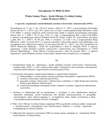 Zarządzenie Nr 0050.34.2016 Wójta Gminy Psary - Szefa Obrony Cywilnej Gminy z dnia 30 marca 2016 r. w sprawie: organizacji i zasad działania systemu wykrywania i alarmowania (SWA) Na podstawie art. 17 ust. 7 i art. 138 ust.3 ustawy z dnia 21 11. 1967 r. o powszechnym obowiązku obrony RP (Dz. U. z 2015 r. poz. 827 z późn. zm.), § 6 pkt 3 rozporządzenia Rady Ministrów z dnia 13.01.2004r. w sprawie ogólnych zasad wykonywania zadań w ramach powszechnego obowiązku obrony (Dz. U. z 2004 r. Nr 16 poz. 152) i § 3 pkt. 6 rozporządzenia RM z dnia 25.06.2002r. w sprawie szczegółowego zakresu działania Szefa OC Kraju, szefów OC województw, powiatów i gmin (Dz. U. z 2002 r. Nr 96 poz. 850), w związku z § 4 pkt 1 lit. d rozporządzenia Rady Ministrów z dnia 7 stycznia 2013 r. w sprawie systemów wykrywania skażeń i powiadamiania o ich wystąpieniu oraz właściwości organów w tych sprawach (Dz. U. z 2013 r. poz. 96), zarządzenia Nr 589/15 Wojewody Śląskiego – Szefa OC województwa z dnia 25 listopada 2015r. w sprawie organizacji i zasad działania systemu wykrywania i alarmowania oraz Zarządzenia nr 7/2016 Starosty Będzińskiego – Szefa Obrony Cywilnej powiatu z dnia 20 stycznia 2016 r. w sprawie organizacji i zasad działania systemu wykrywania i alarmowania zarządza się, co następuje: §1 1. Zarządzeniem ustala się organizację i zasady działania systemu wykrywania i alarmowania, zwanego dalej „SWA”, w celu wykonywania zadań związanych z powszechnym ostrzeganiem i alarmowaniem ludności o zagrożeniach na terenie gminy Psary. 2. Powszechne ostrzeganie i alarmowanie ludności o zagrożeniach obejmuje: 1) funkcjonujący w czasie pokoju system wczesnego ostrzegania o zagrożeniach (SWO), 2) systemy wykrywania i alarmowania (SWA), 3) pozostałe systemy wykrywania i alarmowania wchodzące w skład Krajowego Systemu Wykrywania Skażeń i Alarmowania, 4) system powszechnego ostrzegania wojsk i ludności cywilnej o zagrożeniu uderzeniami z powietrza. 3. Systemy te funkcjonują lub są uruchamiane i rozwijane w celu zapobieżenia skutkom katastrofy naturalnej, awarii technicznej lub działań terrorystycznych, w przypadku wprowadzenia stanu nadzwyczajnego, w szczególności stanu klęski żywiołowej, a także w przypadku przeprowadzania ćwiczeń i treningów. 4. Wójt - Szef Obrony Cywilnej Gminy organizuje SWA na potrzeby realizacji zadań związanych z informowaniem, ostrzeganiem oraz alarmowaniem ludności w sytuacji zagrożenia występującego na obszarze gminy. 5. Całkowite lub częściowe rozwinięcie SWA na terenie gminy następuje na zarządzenie Wójta - Szefa Obrony Cywilnej Gminy. §2 1. Jednostkami organizacyjnymi SWA są formacje obrony cywilnej powoływane przez Wójta na podstawie art. 138 ust. 3 ustawy z dnia 21 listopada 1967r. o powszechnym obowiązku obrony Rzeczypospolitej Polskiej. 2. Jednostki te dzieli się na: 1) jednostki organizacyjne wykrywania i alarmowania 2) jednostki organizacyjne zbierania i przetwarzania informacji oraz alarmowania 3.Utrzymuje się w dalszym działaniu n/w formacje obrony cywilnej wchodzące w skład systemu wykrywania i alarmowania (SWA) na terenie gminy Psary powołane Zarządzeniem Nr 0152/40/2007 Wójta - Szefa Obrony Cywilnej Gminy z dnia 06 listopada 2007r. w sprawie organizacji systemu wykrywania i alarmowania (SWA) oraz powołania drużyny wykrywania i alarmowania (DWA): 1) drużyna wykrywania i alarmowania tworzona na bazie urzędu gminy oraz jednostek organizacyjnych gminy - numer ewidencyjny 010205 2) posterunki alarmowania w sołectwach: – Preczów - numer ewidencyjny 010718 – Strzyżowice – numer ewidencyjny 010719 4. Do podstawowych zdań jednostek, o których mowa w ust. 3 należy: 1) wykrywanie niebezpiecznych emisji do środowiska substancji promieniotwórczych i niebezpiecznych substancji chemicznych, środków zapalających, skażeń i zakażeń oraz uderzeń bronią masowego rażenia; 2) rozpoznawanie skażeń promieniotwórczych, chemicznych, zakażeń biologicznych, określanie dawek napromieniowania, wykrywanie innych nadzwyczajnych zagrożeń oraz oznaczania stref niebezpiecznych; 3) określanie warunków meteorologicznych w przyziemnych warstwach atmosfery; 4) pobieranie próbek i określanie stopnia skażenia produktów spożywczych, płodów rolnych, roślinności, pasz, wody pitnej i wód powierzchniowych oraz gleby i powietrza; 5) przekazywanie danych z rozpoznana do jednostek zbierania i przetwarzania informacji oraz alarmowania; 6) przekazywanie komunikatów, ostrzeżeń i sygnałów alarmowych dla ludności, instytucji i podmiotów gospodarczych. 5. Strukturę organizacyjną, zadania i wyposażenie drużyny wykrywania i alarmowania (dwa) oraz posterunków alarmowania (pal) określa załącznik nr 1 do zarządzenia. 6. Ramowe zasady sporządzania planów działania SWA określa załącznik nr 2 do zarządzenia 7. Członkom formacji obrony cywilnej SWA należy zapewnić oznakowanie międzynarodowym znakiem rozpoznawczym obrony cywilnej zgodnie ze wzorem określonym w I Protokole dodatkowym do Konwencji genewskiej z 12 sierpnia 1949 r., dotyczącym ochrony ofiar międzynarodowych konfliktów zbrojnych, sporządzonym w Genewie dnia 8 czerwca 1977 r (Dz.U. z 1992 r. Nr 41 poz. 175). Sposób umieszczenia międzynarodowego znaku obrony cywilnej na ubiorze lub umundurowaniu członka formacji obrony cywilnej określa załącznik Nr 3 do zarządzenia. 8. Szefowie obrony cywilnej na poszczególnych szczeblach sprawują nadzór nad opracowaniem i aktualizacją niezbędnej dokumentacji dla formacji SWA, ich wyposażeniem w sprzęt specjalistyczny oraz szkolenie. 9. Osobą odpowiedzialną za zorganizowanie i zapewnienie funkcjonowania SWA jest pracownik na samodzielnym stanowisku ds. zarządzania kryzysowego, obrony cywilnej i spraw obronnych. 10. Kierowników jednostek organizacyjnych oraz kierowników komórek organizacyjnych gminy zobowiązuję do udzielenia pomocy w zakresie typow