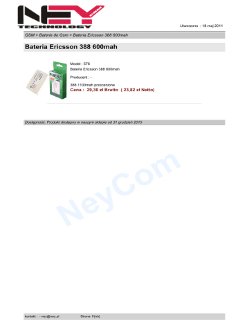 Utworzono : 18 maj 2011 GSM > Baterie do Gsm > Bateria Ericsson 388 600mah Bateria Ericsson 388 600mah Model : 576 Bateria Ericsson 388 600mah Producent : 388 1100mah przecenione Cena : 29,30 zł Brutto ( 23,82 zł Netto) Dostępność: Produkt dostępny w naszym sklepie od 31 grudzień 2010 C y m o e N kontakt : - [email protected] Strona 1/{nb}