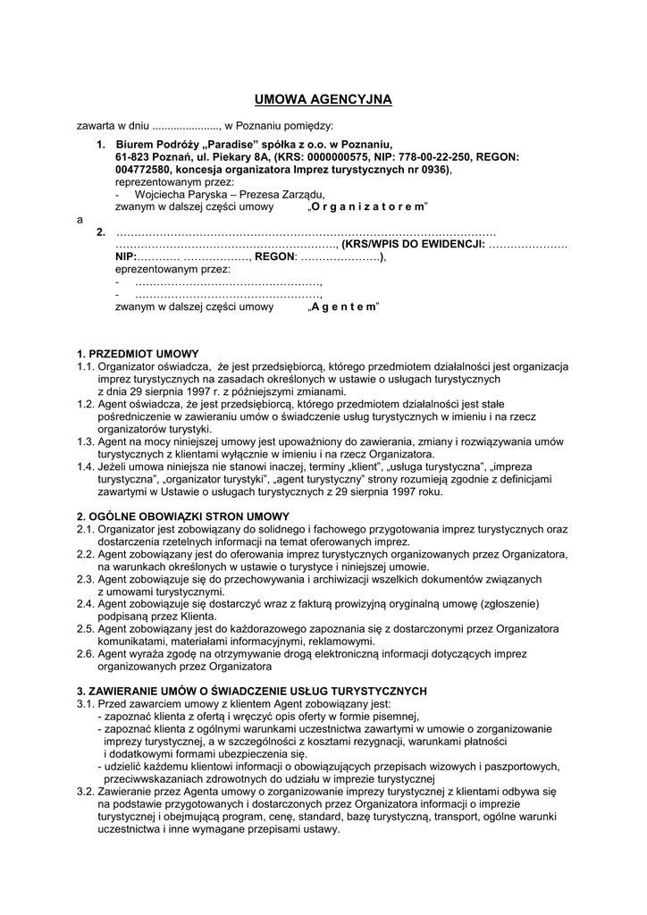 UMOWA AGENCYJNA zawarta w dniu ......................, w Poznaniu pomiędzy: 1. Biurem Podróży „Paradise” spółka z o.o. w Poznaniu, 61-823 Poznań, ul. Piekary 8A, (KRS: 0000000575, NIP: 778-00-22-250, REGON: 004772580, koncesja organizatora Imprez turystycznych nr 0936), reprezentowanym przez: - Wojciecha Paryska – Prezesa Zarządu, zwanym w dalszej części umowy „O r g a n i z a t o r e m” a 2. …………………………………………………………………………………………… ……………………………………………………., (KRS/WPIS DO EWIDENCJI: …………………. NIP:………… ………………, REGON: ………………….), eprezentowanym przez: - ……………………………………………, - ……………………………………………, zwanym w dalszej części umowy „A g e n t e m” 1. PRZEDMIOT UMOWY 1.1. Organizator oświadcza, że jest przedsiębiorcą, którego przedmiotem działalności jest organizacja imprez turystycznych na zasadach określonych w ustawie o usługach turystycznych z dnia 29 sierpnia 1997 r. z późniejszymi zmianami. 1.2. Agent oświadcza, że jest przedsiębiorcą, którego przedmiotem działalności jest stałe pośredniczenie w zawieraniu umów o świadczenie usług turystycznych w imieniu i na rzecz organizatorów turystyki. 1.3. Agent na mocy niniejszej umowy jest upoważniony do zawierania, zmiany i rozwiązywania umów turystycznych z klientami wyłącznie w imieniu i na rzecz Organizatora. 1.4. Jeżeli umowa niniejsza nie stanowi inaczej, terminy „klient”, „usługa turystyczna”, „impreza turystyczna”, „organizator turystyki”, „agent turystyczny” strony rozumieją zgodnie z definicjami zawartymi w Ustawie o usługach turystycznych z 29 sierpnia 1997 roku. 2. OGÓLNE OBOWIĄZKI STRON UMOWY 2.1. Organizator jest zobowiązany do solidnego i fachowego przygotowania imprez turystycznych oraz dostarczenia rzetelnych informacji na temat oferowanych imprez. 2.2. Agent zobowiązany jest do oferowania imprez turystycznych organizowanych przez Organizatora, na warunkach określonych w ustawie o turystyce i niniejszej umowie. 2.3. Agent zobowiązuje się do przechowywania i archiwizacji wszelkich dokumentów związanych z umowami turystycznymi. 2.4. Agent zobowiązuje się dostarczyć wraz z fakturą prowizyjną oryginalną umowę (zgłoszenie) podpisaną przez Klienta. 2.5. Agent zobowiązany jest do każdorazowego zapoznania się z dostarczonymi przez Organizatora komunikatami, materiałami informacyjnymi, reklamowymi. 2.6. Agent wyraża zgodę na otrzymywanie drogą elektroniczną informacji dotyczących imprez organizowanych przez Organizatora 3. ZAWIERANIE UMÓW O ŚWIADCZENIE USŁUG TURYSTYCZNYCH 3.1. Przed zawarciem umowy z klientem Agent zobowiązany jest: - zapoznać klienta z ofertą i wręczyć opis oferty w formie pisemnej, - zapoznać klienta z ogólnymi warunkami uczestnictwa zawartymi w umowie o zorganizowanie imprezy turystycznej, a w szczególności z kosztami rezygnacji, warunkami płatności i dodatkowymi formami ubezpieczenia się. - udzielić każdemu klientowi informacji o obowiązujących przepisach wizowych i paszportowych, przeciwwskazaniach zdrowotnych do udziału w imprezie turystycznej 3.2. Zawieranie przez Agenta umowy o zorganizowanie imprezy turystycznej z klientami odbywa się na podstawie przygotowanych i dostarczonych przez Organizatora informacji o imprezie turystycznej i obejmującą program, cenę, standard, bazę turystyczną, transport, ogólne warunki uczestnictwa i inne wymagane przepisami ustawy. 3.3. Agent może podpisać z klientem umowę wyłącznie po dokonaniu przez klienta wpłaty zaliczki w wysokości co najmniej 40% pełnej ceny imprezy turystycznej, o ile umowa zawierana jest wcześniej niż 40 dni przed terminem rozpoczęcia imprezy lub po dokonaniu pełnej wpłaty ceny imprezy turystycznej, jeżeli umowa zawierana jest po tym terminie. 3.4. Agent ma prawo dokonać rezerwacji wstępnej dla klienta bez żadnych zobowiązań na okres 24 godzin, o ile termin wyjazdu jest później niż 21 dni. W przypadku krótszych terminów do wyjazdu Organizator ma prawo anulować rezerwację wstępną, informując o tym fakcie Agenta 3.5. Agent zobowiązany jest na bieżąco w formie pisemnej - drogą elektroniczną - informować Organizatora o wszelkich zapytaniach klienta do rezerwacji, płatnościach klienta oraz nieprzestrzeganiu przez klienta terminów zapłaty. 3.6. Agent zobowiązany jest stosować wobec klientów ceny ustalone przez Organizatora. 4. ZMIANA WARUNKÓW IMPREZY TURYSTYCZNEJ 4.1. W przypadku zmiany warunków imprezy turystycznej dokonanej przez Organizatora, Agent zobowiązany jest poinformować klienta i uzgodnić w ciągu 48 godzin to w formie pisemnej na umowie oraz pisemnie powiadomić Organizatora o przyjęciu przez klienta nowych warunków imprezy turystycznej. 4.2. W przypadku zmiany warunków imprezy turystycznej przez klienta Agent zobowiązany jest wprowadzić stosowne zmiany do istniejącej umowy oraz pobrać stosowne dopłaty lub dokonać zwrotu. 5. ODWOŁANIE IMPREZY TURYSTYCZNEJ 5.1. W przypadku odwołania imprezy turystycznej przez Organizatora, na podstawie pisemnej informacji przesłanej drogą elektroniczną, Agent zobowiązany jest: - niezwłocznie poinformować klienta o odwołaniu imprezy turystycznej oraz przedstawić propozycje zastępczej imprezy turystycznej (podpisać z klientem nowa umowę na imprezę zastępczą) lub dokonać zwrotu pełnej wpłaty na rzecz klienta - pisemnie – drogą elektroniczną - powiadamiać Organizatora o podjętych przez klienta decyzjach. 6. REZYGNACJA Z UDZIAŁU W IMPREZIE TURYSTYCZNEJ 6.1. W przypadku rezygnacji klienta z udziału w imprezie turystycznej Agent ma obowiązek: - poinformować Organizatora Turystyki w dniu rezygnacji – drogą elektroniczną -,o jej złożeniu przez klienta podając powód rezygnacji, - po otrzymaniu od Organizatora 