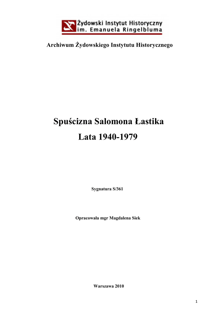 Archiwum Żydowskiego Instytutu Historycznego Spuścizna Salomona Łastika Lata 1940-1979 Sygnatura S/361 Opracowała mgr Magdalena Siek Warszawa 2010 1 Wstęp Salomon Łastik urodził się w 14 marca 1907 r. w Aleksandrii pow. Równe woj. wołyńskie. Jego rodzicami byli Owsiej i Minka z d. Wilner. Po wybuchu II wojny światowej znalazł się w Białymstoku. Należał do Związku Literatów i Dziennikarzy Żydowskich w Polsce. Jego postępowanie spotkało się z powszechnym potępieniem innych członków Związku, przez których został oskarżony o nieetyczne zachowanie. Na spotkaniu z radzieckimi pisarzami jidysz otwarcie zaatakował niektórych kolegów, zarzucając im sympatie syjonistyczne lub bundowskie. Zaskoczeni byli nawet goście z ZSRR. Po ataku Niemiec na Związek Radziecki uciekł do Kazachstanu. Przebywał w AłmaAcie. Szczegóły na temat tego, czym dokładnie się tam zajmował, nie są jednak bliżej znane. Po wojnie powrócił do Polski. Sprawa publicznych donosów Łastika była dobrze znana w środowisku pisarzy żydowskich. Za swoje „nieetyczne zachowanie” w Białymstoku został, przez sąd koleżeński LiDŻ w Łodzi, wykluczony z jego szeregów na 6 miesięcy (lipiec- grudzień 1946).1 W latach 50-tych zajął się głównie pisarstwem reportażowym, skupiając się na tematyce społecznej i wychowawczej, co zaowocowało tomem reportaży W połowie drogi oraz książkami: Trudne dzieci, Trudni rodzice, Studzieniec a także licznymi artykułami prasowymi. Zajmował się również krytyką literacką, historia i kulturą żydowską. Wraz z Arnoldem Słuckim stworzył Antologię poezji żydowskiej, która została przygotowana do druku jeszcze przed 1968 r. Wydał również podręcznik do nauki języka jidysz.. Był członkiem Związku Literatów Polskich, współpracował także z Państwowym Teatrem Żydowskim w Warszawie. Zmarł w Warszawie w1977 r. Publikacje książkowe Salomona Łastika: Di jidysze literatur biz di klasiker (Literatura żydowska do okresu klasyków), Warszawa 1950 Mitn ponem cum morgn (Obliczem ku przyszłości), Warszawa 1952 W połowie drogi, Warszawa 1956 Dziecko, z którym się spotykamy, Warszawa 1960 Dom na Wiśnowej: reportaże z milicyjnej izby dziecka, Warszawa 1960 Czy Sodoma i Gomora? na tematy obyczajowe, Łódź 1961 1 AŻIH, Związek Literatów i Dziennikarzy Żydowskich w Polsce, sygn. 368/1. 2 Z dziejów oświecenia żydowskiego: ludzie i fakty, Warszawa 1961 Majn lajenbuch: farn 4 kl., Warszawa 1961 Dzieci, które znałem, Warszawa 1963 Studzieniec, Warszawa 1965 Trudne dzieci, Warszawa 1965 O współczesności bez osłonek, Łódź 1967 Trudni rodzice, Warszawa 1967 Antologia poezji żydowskiej, Warszawa 1983 Charakterystyka zbioru: W zbiorze znajdują się głównie maszynopisy publikacji Łastika: Antologii poezji żydowskiej oraz reportaży: Trudna szkoła i U podnóży Ała-Tau. Dużą część stanowią również wycinki prasowe artykułów Łastika oraz dotyczące jego osoby. Ponadto w zespole znajdują się dokumenty osobiste Łastika w postaci umów podpisanych z wydawnictwami książkowymi, ZUS i NBP, korespondencja w sprawach służbowych i prywatnych. Pozostałe dokumenty to: zarys wspomnień, materiały o szkolnictwie w Finlandii i Szwecji, fotografia Łastika i inne fotografie (głównie aktora Ludwika Rutkowskiego). Bibliografia: Joanna Nalewajko-Kulikov, Obywatel Jidyszlandu. Rzecz o żydowskich komunistach w Polsce, Warszawa 2009, s. 125. Źródła: Związek Literatów i Dziennikarzy Żydowskich w Polsce, AŻIH, sygn. 368/1 3 Wykaz skrótów: b. d.- bez daty rkps- rękopis mps- maszynopis mps pow.- maszynopis powielany j. fin.- język fiński j. niem.- język niemiecki j. kaz.- język kazachski j. pol.- język polski j. ros.- język rosyjski j. szwedz.- język szwedzki l.- luźne s.- stron 4 Inwentarz: 1. Dokumenty osobiste- umowy z ZUS, NBP, zaświadczenia Związku Sowieckich Pisarzy Kazachstanu, legitymacja Związku Zawodowego Drukarzy, zaproszenie na ślub Emanuela Łastika, portret Salomona Łastika. 1940-1977, rkps, mps, mps pow., j. pol., j. ros., l., s. 2. Korespondencja wychodząca i przychodząca służbowa. 1943-1979, rkps, mps, mps pow., j. jidysz, j. pol., l., s. 3. Korespondencja przychodząca prywatna. 1945-1977, rkps, jidysz, j. pol., j. ros., l., s. 4. 5. Umowy Salomona Łastika z Wiedzą Powszechną, Czytelnikiem, Wydawnictwem Literackim, Państwowym Instytutem Wydawniczym, Instytutem Wydawniczym „Nasza Księgarnia”, Państwowymi Zakładami Wydawnictw Szkolnych, Wydawnictwem Ministerstwa Obrony Narodowej. 1954-1977, rkps, mps, druk, j. pol., l., s. Rachunki, faktury, podanie, projekty dotyczące nagrobka Salomona Łastika. 1978-1979, rkps, mps, druk, j. pol., l., s. 6. Fotografia Salomona Łastika2. b. d., rkps, j. pol., j. ros., l., s. 7. Wspomnienia. 1969, rkps, j. pol., poszyt, s. 8. Maszynopisy i rękopisy tekstów. b. d., rkps, mps, j. pol., l., s. 2 Załączona koperta. 5 9. Luźne notatki. b. d., rkps, j. jidysz, j. pol., poszyt, l., s. 10. Materiały o szkolnictwie w Finlandii i Szwecji. b. d., 1960, 1966, rkps, mps, druk, j. fin., j. niem., j. pol., j. szwedz., poszyt, l., s. 11. Artykuły prasowe Salomona Łastika- „Nowa Kultura”, „Żołnierz Wolności”, „Fakty i Myśli”, „Świetlica”, „Przegląd Kulturalny”, „Argumenty”, „Nowa Szkoła”, „Głos Tygodnia”, „Sztandar Ludu”, „Iskry”, „Sztandar Młodych”, „Gazeta Krakowska”, „Trybuna Robotnicza”, „Polityka”, „Głos Robotniczy”. 1953-1956, 1958, 1963, 1967-1968, 1972, druk, j. pol., l., s. 12. Artykuły prasowe Salomona Łastika- „Kazachstanskaja Prawda”, „Stalin Tuy”, „Folks Sztyme”, „Di Fraje Jungt”, „Jidisze Szriftn”, „Socjale Medicin”. 1942- 1944, 1947, 1971, druk, fotokopia, j. jidysz, j. ros., j. kaz.?, l., s. 13. Wycinki prasowe dotyczące Salomona Łastika- „Folks Sztyme”, „Jidisze Szriftn”, „Tagebuch”, „Yapaa Sana”, „Työk