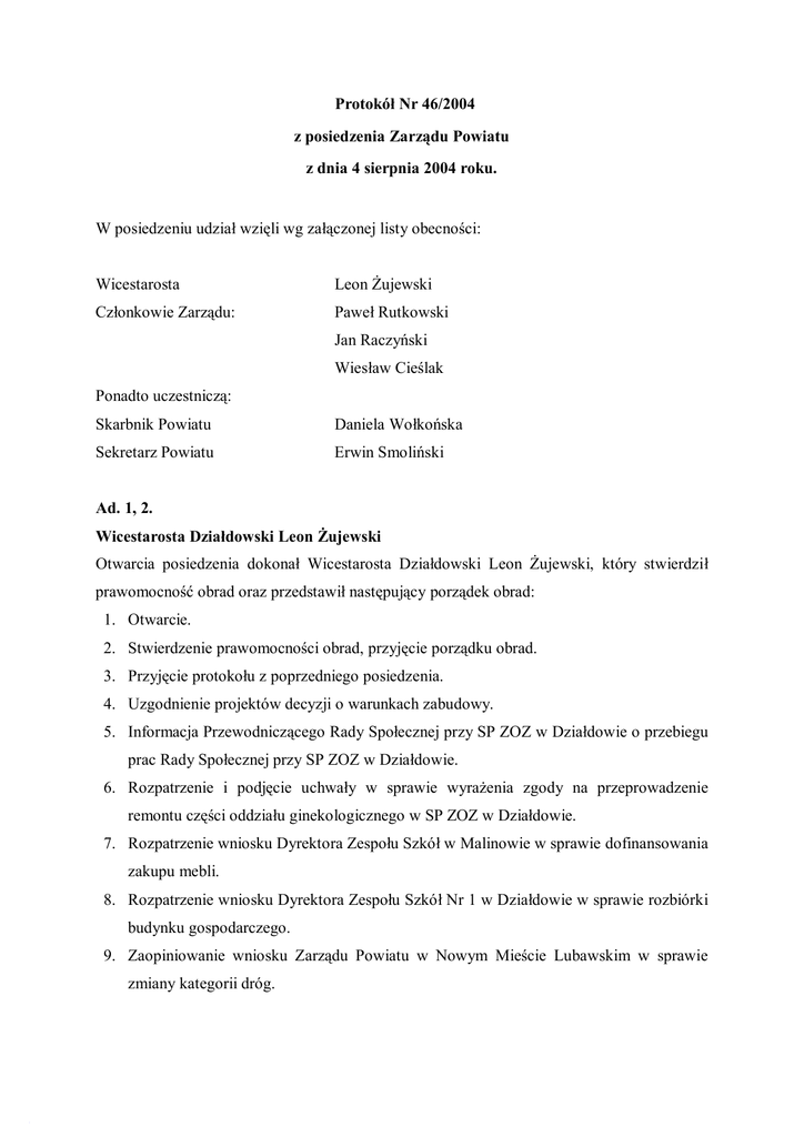 Protokół Nr 46/2004 z posiedzenia Zarządu Powiatu z dnia 4