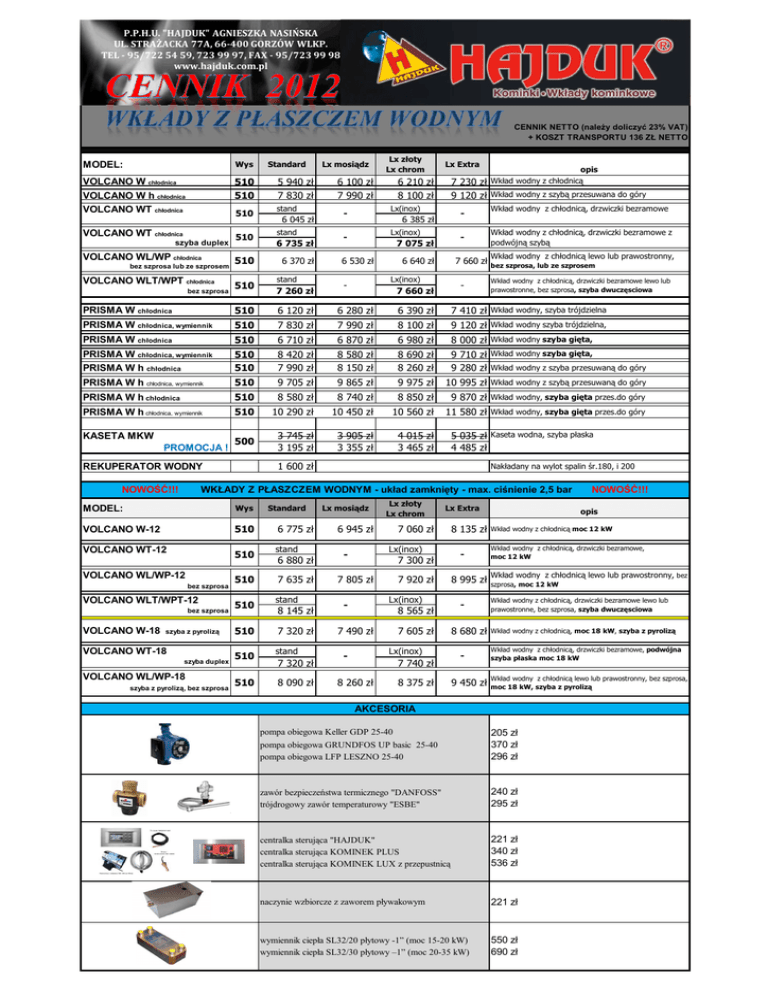 P.P.H.U. "HAJDUK" AGNIESZKA NASIŃSKA UL. STRAŻACKA 77A, 66-400 GORZÓW WLKP. TEL - 95/722 54 59, 723 99 97, FAX - 95/723 99 98 www.hajduk.com.pl CENNIK NETTO (naleŜy doliczyć 23% VAT) + KOSZT TRANSPORTU 136 ZŁ NETTO MODEL: Wys VOLCANO W chłodnica VOLCANO W h chłodnica VOLCANO WT chłodnica 510 510 510 VOLCANO WT chłodnica szyba duplex VOLCANO WL/WP chłodnica bez szprosa lub ze szprosem VOLCANO WLT/WPT chłodnica bez szprosa 510 510 510 Standard 5 940 zł 7 830 zł stand 6 045 zł stand 6 735 zł 6 370 zł stand 7 260 zł Lx mosiądz 6 100 zł 7 990 zł Lx złoty Lx chrom Lx Extra Lx(inox) - - 6 385 zł Lx(inox) - - 7 075 zł 6 530 zł 6 640 zł 7 660 zł Lx(inox) - opis 7 230 zł Wkład wodny z chłodnicą 9 120 zł Wkład wodny z szybą przesuwana do góry 6 210 zł 8 100 zł - 7 660 zł Wkład wodny z chłodnicą, drzwiczki bezramowe Wkład wodny z chłodnicą, drzwiczki bezramowe z podwójną szybą Wkład wodny z chłodnicą lewo lub prawostronny, bez szprosa, lub ze szprosem Wkład wodny z chłodnicą, drzwiczki bezramowe lewo lub prawostronne, bez szprosa, szyba dwuczęsciowa PRISMA W chłodnica 510 6 120 zł 6 280 zł 6 390 zł 7 410 zł Wkład wodny, szyba trójdzielna PRISMA W chłodnica, wymiennik 510 7 830 zł 7 990 zł 8 100 zł 9 120 zł Wkład wodny szyba trójdzielna, PRISMA W chłodnica 510 6 710 zł 6 870 zł 6 980 zł 8 000 zł Wkład wodny szyba gięta, PRISMA W chłodnica, wymiennik PRISMA W h chłodnica 510 510 8 420 zł 7 990 zł 8 580 zł 8 150 zł 8 690 zł 8 260 zł 9 710 zł Wkład wodny szyba gięta, 9 280 zł Wkład wodny z szyba przesuwaną do góry PRISMA W h chłodnica, wymiennik 510 9 705 zł 9 865 zł 9 975 zł 10 995 zł Wkład wodny z szybą przesuwaną do góry PRISMA W h chłodnica 510 8 580 zł 8 740 zł 8 850 zł 9 870 zł Wkład wodny, szyba gięta przes.do góry PRISMA W h chłodnica, wymiennik 510 10 290 zł 10 450 zł 10 560 zł 11 580 zł Wkład wodny, szyba gięta przes.do góry 500 3 745 zł 3 195 zł 3 905 zł 3 355 zł 4 015 zł 3 465 zł KASETA MKW PROMOCJA ! 1 600 zł REKUPERATOR WODNY NOWOŚĆ!!! Nakładany na wylot spalin śr.180, i 200 WKŁADY Z PŁASZCZEM WODNYM - układ zamknięty - max. ciśnienie 2,5 bar MODEL: Wys VOLCANO W-12 510 VOLCANO WT-12 510 VOLCANO WL/WP-12 bez szprosa VOLCANO WLT/WPT-12 bez szprosa VOLCANO W-18 5 035 zł Kaseta wodna, szyba płaska 4 485 zł szyba z pyrolizą VOLCANO WT-18 szyba duplex VOLCANO WL/WP-18 szyba z pyrolizą, bez szprosa 510 510 510 510 510 Standard 6 775 zł stand 6 880 zł 7 635 zł stand 8 145 zł 7 320 zł stand 7 320 zł 8 090 zł Lx mosiądz 6 945 zł Lx złoty Lx chrom Lx Extra 7 060 zł Lx(inox) - 7 300 zł 7 805 zł 7 920 zł Lx(inox) - 8 565 zł 7 490 zł 7 605 zł Lx(inox) - 7 740 zł 8 260 zł 8 375 zł 8 135 zł - 8 995 zł - 8 680 zł - 9 450 zł NOWOŚĆ!!! opis Wkład wodny z chłodnicą moc 12 kW Wkład wodny z chłodnicą, drzwiczki bezramowe, moc 12 kW Wkład wodny z chłodnicą lewo lub prawostronny, bez szprosa, moc 12 kW Wkład wodny z chłodnicą, drzwiczki bezramowe lewo lub prawostronne, bez szprosa, szyba dwuczęsciowa Wkład wodny z chłodnicą, moc 18 kW, szyba z pyrolizą Wkład wodny z chłodnicą, drzwiczki bezramowe, podwójna szyba płaska moc 18 kW Wkład wodny z chłodnicą lewo lub prawostronny, bez szprosa, moc 18 kW, szyba z pyrolizą AKCESORIA pompa obiegowa Keller GDP 25-40 pompa obiegowa GRUNDFOS UP basic 25-40 pompa obiegowa LFP LESZNO 25-40 205 zł 370 zł 296 zł zawór bezpieczeństwa termicznego "DANFOSS" trójdrogowy zawór temperaturowy "ESBE" 240 zł 295 zł centralka sterująca "HAJDUK" centralka sterująca KOMINEK PLUS centralka sterująca KOMINEK LUX z przepustnicą 221 zł 340 zł 536 zł naczynie wzbiorcze z zaworem pływakowym 221 zł wymiennik ciepła SL32/20 płytowy -1” (moc 15-20 kW) wymiennik ciepła SL32/30 płytowy –1” (moc 20-35 kW) 550 zł 690 zł
