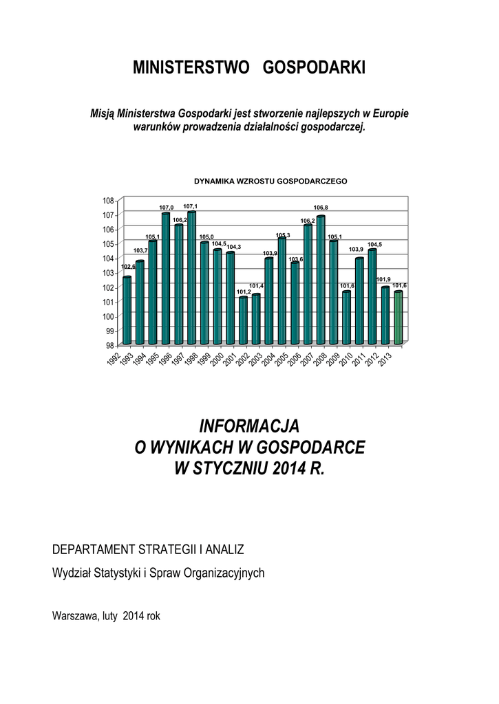MINISTERSTWO GOSPODARKI Misją Ministerstwa Gospodarki jest stworzenie najlepszych w Europie warunków prowadzenia działalności gospodarczej. DYNAMIKA WZROSTU GOSPODARCZEGO 108 107,0 107 107,1 106,8 106,2 106 106,2 105,0 104,5 105,1 105 103,7 104 105,3 105,1 104,3 103,9 103,9 104,5 103,6 102,6 103 101,9 101,4 101,2 102 101,6 101 100 99 INFORMACJA O WYNIKACH W GOSPODARCE W STYCZNIU 2014 R. DEPARTAMENT STRATEGII I ANALIZ Wydział Statystyki i Spraw Organizacyjnych Warszawa, luty 2014 rok 13 12 20 11 20 10 20 09 20 08 20 07 20 06 20 05 20 04 20 03 20 02 20 01 20 00 20 99 20 98 19 97 19 96 19 95 19 94 19 93 19 19 19 92 98 101,6 2 W styczniu 2014 r. tendencje obserwowane w gospodarce były zbliżone do notowanych w ostatnich miesiącach ub. roku. Odnotowano wzrost dynamiki produkcji sprzedanej przemysłu i sprzedaży detalicznej. Tempo spadku produkcji budowlano-montażowej było mniejsze niż przed rokiem. Przeciętne zatrudnienie w sektorze przedsiębiorstw ukształtowało się na poziomie zbliżonym do notowanego w styczniu roku poprzedniego. Utrzymał się jednocześnie wysoki poziom bezrobocia. W porównaniu z analogicznym okresem roku poprzedniego w styczniu 2014 r. w sektorze przedsiębiorstw odnotowano: ◙ wzrost produkcji sprzedanej przemysłu – o 4,1% (wobec wzrostu o 6,7% przed miesiącem oraz - 0,4% przed rokiem); ◙ wzrost wydajności pracy w przemyśle, mierzonej produkcją sprzedaną na jednego zatrudnionego – o 3,8% przy większym o 0,3% przeciętnym zatrudnieniu i wzroście przeciętnego miesięcznego wynagrodzenia brutto – o 3,5%; ◙ wzrost sprzedaży w przedsiębiorstwach produkujących głównie dobra: konsumpcyjne trwałe – o 9,1% (wobec spadku o 0,3% przed rokiem), inwestycyjne – o 7,8% (wobec spadku o 4,5%), zaopatrzeniowe – o 6,4% (wobec spadku o 3,0%), konsumpcyjne nietrwałe – o 2,4% (wobec 6,7%), przy jednoczesnym spadku sprzedaży w przedsiębiorstwach produkujących głównie dobra związane z energią – o 0,2% (wobec wzrostu o 4,0%), ◙ spadek produkcji budowlano-montażowej – o 3,9% (wobec wzrostu o 5,8% przed miesiącem i spadku o 16,1% przed rokiem); ◙ wzrost sprzedaży detalicznej – o 5,0% (wobec wzrostu o 5,9% przed miesiącem oraz - 2,4% przed rokiem); ◙ przeciętne zatrudnienie utrzymało się na poziomie sprzed roku – 5.506 tys. osób (wobec wzrostu o 0,3% w grudniu ub. roku oraz spadku o 0,8% w styczniu ub. roku); ◙ liczbę bezrobotnych zarejestrowanych w końcu stycznia 2014 r. na poziomie 2.261 tys., tj. wyższą w porównaniu z poprzednim miesiącem o ok. 103 tys. osób, natomiast niższą o ok. 35 tys. – w porównaniu ze styczniem 2013 r.; ◙ stopę bezrobocia rejestrowanego na koniec stycznia 2014 r. na poziomie 14,0%, wobec 13,4% w grudniu 2013 r. oraz 14,2% w styczniu 2013 r.; ◙ wzrost cen towarów i usług konsumpcyjnych – o 0,7% (wobec 1,7% przed rokiem); ◙ spadek cen: produkcji sprzedanej przemysłu – o 0,9% (wobec 1,2% przed rokiem); produkcji budowlano-montażowej – o 1,7% (wobec 1,4%). W styczniu 2014 r. deficyt budżetu państwa wyniósł 2,6 mld zł, co stanowiło 5,6% kwoty założonej w ustawie budżetowej na rok 2014. Dane za styczeń-grudzień 2013 r. ◙ w obrotach handlu zagranicznego (wg danych GUS) odnotowano: wzrost wpływów z eksportu o 6,5% – do poziomu 152,8 mld EUR oraz wydatków na import o 0,7% – do poziomu 155,1 mld EUR, zmniejszenie deficytu w obrotach handlu zagranicznego – do poziomu 2,3 mld EUR, wobec 10,6 mld EUR w roku 2012. 3 WYBRANE WSKAŹNIKI SYTUACJI SPOŁECZNO-GOSPODARCZEJ KRAJU Lp. Wyszczególnienie PKB dynamika (ceny stałe) wartość (ceny bieżące) Produkcja sprzedana przemysłu1/ (ceny stałe) Produkcja budowlano-montażowa1/ (ceny stałe) 1. 2. 3. Jednostka miary Wykonanie 2013 rok według GUS I-III 2013 I-III 2012 I-VI 2013 I-VI 2012 IX 2013 IX 2012 I 2014 I 2013 101,6* 1.631,8* 100,5 377,9 100,7 773,6 101,1* 1.177,9* x x % 102,2 98,0 99,6 101,4 104,1 % 88,0 84,9 78,5 84,4 96,1 % mld zł Obroty handlu zagranicznego (wg GUS) Eksport 4. Import Saldo 5. Przeciętne zatrudnienie w gospodarce narodowej, w tym: - w sektorze przedsiębiorstw, w tym: - PRZEMYSŁ 6. Przeciętne miesięczne wynagrodzenie brutto w gospodarce narodowej, w tym: - w sektorze przedsiębiorstw, w tym: - PRZEMYSŁ 7. Liczba zarejestrowanych bezrobotnych2/ 8. Stopa bezrobocia2/ 9. 10. 11. 12. 13. 14. 15. 16. Wskaźnik cen produkcji sprzedanej przemysłu do poprzedniego miesiąca Wskaźnik cen produkcji budowlanomontażowej do poprzedniego miesiąca Wskaźnik cen towarów i usług konsumpcyjnych do poprzedniego miesiąca Wskaźnik rentowności obrotu brutto 3/ ogółem - PRZEMYSŁ Wskaźnik rentowności obrotu netto 3/ ogółem - PRZEMYSŁ Średni kurs dolara amerykańskiego (NBP) Średni kurs euro (NBP) Wynik budżetu państwa (udział w planowanej kwocie rocznej) mln EUR % mln EUR % 152.779 106,5 155.092 100,7 37.061 107,5 38.297 101,2 75.288 107,6 76.284 99,8 114.059 107,3 115.150 100,8 x x x x mln EUR -2.313 -1.236 -996 -1.091 x tys. osób % x 100,6* 8.210 99,3 8.199 99,1 8.185 99,0 x x tys. osób % tys. osób % 5.494 99,0 2.446 99,0 5.500 99,2 2.451 98,9 5.491 99,0 2.448 98,8 5.490 99,0 2.446 98,9 5.506 100.0 2.461 100,3 x x 3.740 102,6 3.675 102,9 3.667 103,3 x x zł % zł % tys. osób % 3.837 102,9 3.959 103,2 2.158 101,0 3.741 102,1 3.827 102,2 2.315 108,1 3.764 102,5 3.854 102,5 2.109 107,4 3.781 102,8 3.880 103,0 2.083 105,3 3.805 103,4 3.869 103,5 2.261 98,5 % 13,4 14,3 13,2 13,0 14,0 % 98,7 x 99,3 x 98,6 x 98,7 x 99,1 100,1 % 98,2 x 98,4 x 98,2 x 98,2 x 98,3 99,8 % 100,9 x 101,3 x 100,9 x 101,0 x 100,7 100,1 % x x 4,0 5,9 4,7 6,6 4,7 6,5 x x % x x 3,2 4,9 4,0 5,7 4,0 5,6 x x PLN/100 USD 316,08 314,76 318,21 319,05 306,50 PLN/100 EUR 419,75 415,56 417,83 420,17 417,76 -24,4 68,8 -25,9 72,7 -29,6 83,2 -2,6 5,6 zł % mld zł % x x */ szacunek wstępny GUS 1/ 2/ 3/ dotyczy podmiotów o liczbie pracujących powyżej 9 osób wg stanu w końcu okresu dotyczy podmiotów o liczbie pra