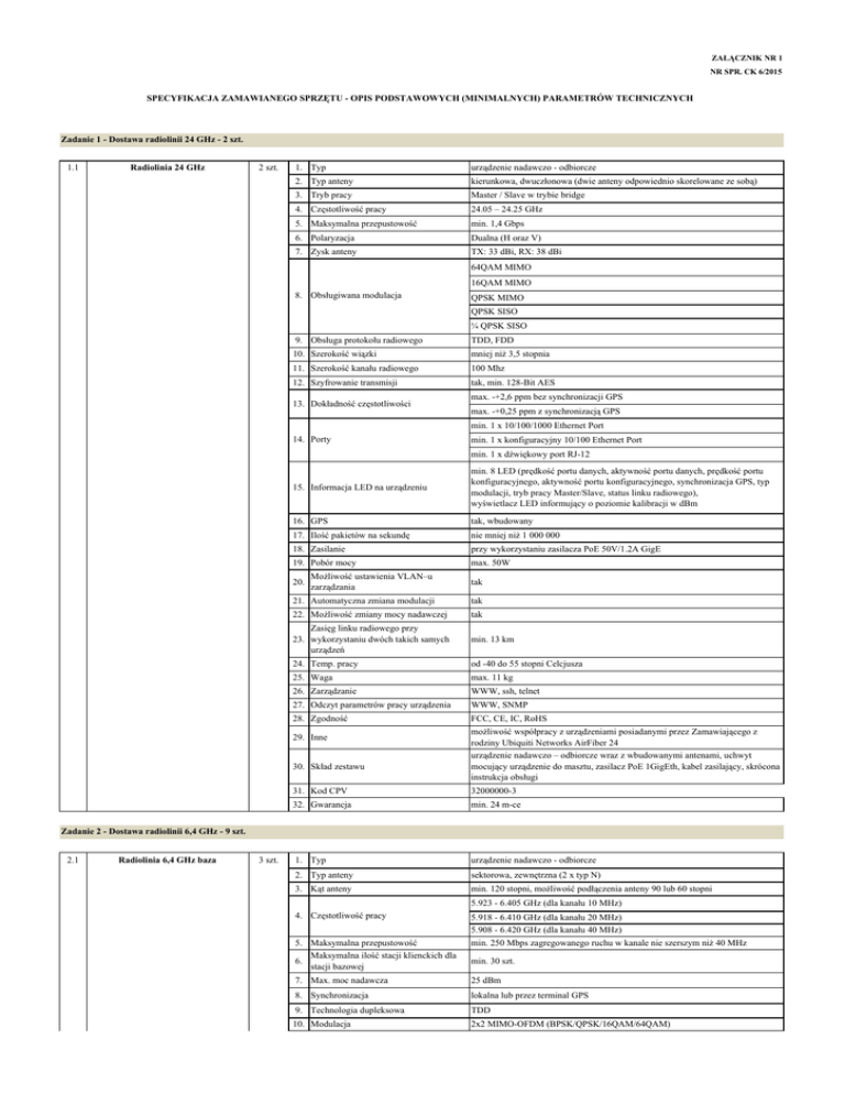 ZAŁĄCZNIK NR 1 NR SPR. CK 6/2015 SPECYFIKACJA ZAMAWIANEGO SPRZĘTU - OPIS PODSTAWOWYCH (MINIMALNYCH) PARAMETRÓW TECHNICZNYCH Zadanie 1 - Dostawa radiolinii 24 GHz - 2 szt. 1.1 Radiolinia 24 GHz 2 szt. 1. Typ urządzenie nadawczo - odbiorcze 2. Typ anteny kierunkowa, dwuczłonowa (dwie anteny odpowiednio skorelowane ze sobą) 3. Tryb pracy Master / Slave w trybie bridge 4. Częstotliwość pracy 24.05 – 24.25 GHz 5. Maksymalna przepustowość min. 1,4 Gbps 6. Polaryzacja Dualna (H oraz V) 7. Zysk anteny TX: 33 dBi, RX: 38 dBi 64QAM MIMO 16QAM MIMO 8. Obsługiwana modulacja QPSK MIMO QPSK SISO ¼ QPSK SISO 9. Obsługa protokołu radiowego TDD, FDD 10. Szerokość wiązki mniej niż 3,5 stopnia 11. Szerokość kanału radiowego 100 Mhz 12. Szyfrowanie transmisji 13. Dokładność częstotliwości tak, min. 128-Bit AES max. -+2,6 ppm bez synchronizacji GPS max. -+0,25 ppm z synchronizacją GPS min. 1 x 10/100/1000 Ethernet Port 14. Porty min. 1 x konfiguracyjny 10/100 Ethernet Port min. 1 x dźwiękowy port RJ-12 15. Informacja LED na urządzeniu min. 8 LED (prędkość portu danych, aktywność portu danych, prędkość portu konfiguracyjnego, aktywność portu konfiguracyjnego, synchronizacja GPS, typ modulacji, tryb pracy Master/Slave, status linku radiowego), wyświetlacz LED informujący o poziomie kalibracji w dBm 16. GPS tak, wbudowany 17. Ilość pakietów na sekundę nie mniej niż 1 000 000 18. Zasilanie przy wykorzystaniu zasilacza PoE 50V/1.2A GigE 19. Pobór mocy max. 50W 20. Możliwość ustawienia VLAN–u zarządzania tak 21. Automatyczna zmiana modulacji tak 22. Możliwość zmiany mocy nadawczej tak Zasięg linku radiowego przy 23. wykorzystaniu dwóch takich samych urządzeń min. 13 km 24. Temp. pracy od -40 do 55 stopni Celcjusza 25. Waga max. 11 kg 26. Zarządzanie WWW, ssh, telnet 27. Odczyt parametrów pracy urządzenia WWW, SNMP 28. Zgodność FCC, CE, IC, RoHS 29. Inne 30. Skład zestawu możliwość współpracy z urządzeniami posiadanymi przez Zamawiającego z rodziny Ubiquiti Networks AirFiber 24 urządzenie nadawczo – odbiorcze wraz z wbudowanymi antenami, uchwyt mocujący urządzenie do masztu, zasilacz PoE 1GigEth, kabel zasilający, skrócona instrukcja obsługi 31. Kod CPV 32000000-3 32. Gwarancja min. 24 m-ce 1. Typ urządzenie nadawczo - odbiorcze 2. Typ anteny sektorowa, zewnętrzna (2 x typ N) Zadanie 2 - Dostawa radiolinii 6,4 GHz - 9 szt. 2.1 Radiolinia 6,4 GHz baza 3 szt. 3. Kąt anteny min. 120 stopni, możliwość podłączenia anteny 90 lub 60 stopni 5.923 - 6.405 GHz (dla kanału 10 MHz) 4. Częstotliwość pracy 5. Maksymalna przepustowość Maksymalna ilość stacji klienckich dla stacji bazowej 6. 5.918 - 6.410 GHz (dla kanału 20 MHz) 5.908 - 6.420 GHz (dla kanału 40 MHz) min. 250 Mbps zagregowanego ruchu w kanale nie szerszym niż 40 MHz min. 30 szt. 7. Max. moc nadawcza 25 dBm 8. Synchronizacja lokalna lub przez terminal GPS 9. Technologia dupleksowa TDD 10. Modulacja 2x2 MIMO-OFDM (BPSK/QPSK/16QAM/64QAM) 11. Automatyczny dobór modulacji tak 12. Szerokość kanału radiowego 10/20/40 MHz (możliwość konfiguracji) 13. Szyfrowanie transmisji min. AES 128, FIPS 197 14. Alokacja Uplink / Downlink konfigurowalna symetria lub asymetria (proporcjonalność, możliwość ustawienia od 1 do 99) 15. Opóźnienie 2.2 Radiolinia 6,4 GHz klient 6 szt. max. 4 msec dla 2 stacji klienckich max. 20 msec dla 30 stacji klienckich 16. Zasilanie PoE z interfejsem do sieci 1000Base-T 17. Pobór mocy max. 25W 18. Obsługa VLAN-ów 802.1Q, QinQ, min. 4000 VLANs 19. Tablica adresów MAC min. 5K 20. QoS wsparcie dla prioryteryzacji 4 kolejek ruchu zgodnie z 802.1P 21. Wymagane CIR, MIR tak, możliwość budowania gwarancji pasma 22. Max. zasięg linku radiowego min. 38 km 23. Temp. pracy min. od -35 do 60 stopni Celcjusza 24. Szczelność min. IP67 25. Waga ODU max 2,5kg 26. Wymiary ODU max. 285 x 200 x 100 mm 27. Zarządzanie wsparcie dla IPv4/IPv6, SNMP v1 i v3, HTTP 28. Zgodność ETSI EN 302 326, CE, FCC, IC 29. Inne możliwość podłączenia terminala klienckiego o wymiarach nie większych niż 245 x 205 x 85 mm i wadze nie większej niż 1,6 kg 30. Skład zestawu ODU wraz z uchwytem mocującym do masztu, antena sektorowa (min. 120 stopni) wraz z uchwytem mocującym do masztu, kabel połączeniowy pomiędzy anteną a ODU o długości min. 1,5 m, zasilacz, kabel zasilający, skrócona instrukcja obsługi, zapasowy zasilacz zgodny z oryginałem 31. Kod CPV 32000000-3 32. Gwarancja min. 36 m-cy 1. Typ urządzenie nadawczo - odbiorcze 2. Typ anteny kierunkowa, wbudowana 3. Zysk anteny 23 dBi 4. Częstotliwość pracy 5.918 - 6.410 GHz (dla kanału 20 MHz) 5.923 - 6.405 GHz (dla kanału 10 MHz) 5.908 - 6.420 GHz (dla kanału 40 MHz) 5. Maksymalna przepustowość min. 50 Mbps zagregowanego ruchu, możliwość rozszerzenia do min. 100 Mbps 6. Max. moc nadawcza 25 dBm 7. Technologia dupleksowa TDD 8. Modulacja 2x2 MIMO-OFDM (BPSK/QPSK/16QAM/64QAM) 9. Automatyczny dobór modulacji tak 10. Szerokość kanału radiowego 10/20/40 MHz (możliwość konfiguracji) 11. Szyfrowanie transmisji min. AES 128, FIPS 197 12. Zasilanie PoE z interfejsem do sieci 100Base-T 13. Pobór mocy max. 20W 14. Obsługa VLAN-ów 802.1Q, QinQ, min. 4000 VLANs 15. QoS wsparcie dla prioretyryzacji 4 kolejek ruchu zgodnie z 802.1P 16. Max. zasięg linku radiowego min. 38 km 17. Temp. pracy min. od -35 do 60 stopni Celcjusza 18. Szczelność min. IP67 19. Waga ODU max 3,7kg 20. Wymiary ODU max. 380 x 380 x 120 mm 21. Zarządzanie wsparcie dla IPv4/IPv6, SNMP v1 i v3, HTTP 22. Zgodność ETSI EN 302 326, CE, FCC, IC 23. Skład zestawu urządzenie nadawczo - odbiorcze wraz z uchwytem mocującym do masztu, zasilacz, kabel zasilający, skrócona instrukcja obsługi, zapasowy zasilacz zgodny z oryginałem 24. Inne zgodność współpracy ze stacją bazową wyspecyfikowaną w punkcie 2.1 25. Kod CPV 32000000-3 26. Gwarancja min. 36 m-cy Zadanie 3 - Dostawa radiolinii 5 GHz - 12 szt. 3.1 Radioli