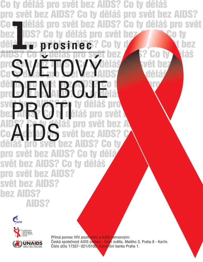 Co ty dÏl·ö pro svÏt bez AIDS? Co ty dÏl·ö pro svÏt bez AIDS? Co ty dÏl·ö pro svÏt bez AIDS? Co ty dÏl·ö pro svÏt bez AIDS? Co ty dÏl·ö pro svÏt bez AIDS? Co ty dÏl·ö pro svÏt bez AIDS? Co ty dÏl·ö pro svÏt p robez s inAIDS? e c Co ty dÏl·ö pro svÏt bez AIDS? Co ty dÏl·ö pro svÏt bez AIDS? Co ty dÏl·ö pro svÏt bez AIDS? Co ty dÏl·ö pro svÏt bez Co ty dÏl·ö pro svÏt bez AIDS? Co ty dÏl·ö dÏl·ö pro svÏt bez AIDS? Co ty dÏl·ö pro pro svÏt bez AIDS? Co ty dÏl·ö pro svÏt bez AIDS? Co ty dÏl·ö pro svÏt bez AIDS? Co ty dÏl·ö pro svÏt bez AIDS? Co ty dÏl·ö pro svÏt bez AIDS? Co ty dÏl·ö pro svÏt bez AIDS? Co ty dÏl·ö pro svÏt bez AIDS? Co ty dÏl·ö pro svÏt bez AIDS? Co ty dÏl·ö pro svÏt bez AIDS? Co ty dÏl·ö pro svÏt bez AIDS? svÏt bez AIDS? bez AIDS? AIDS? 1SVĚTOVÝ . DEN BOJE PROTI AIDS Přímá pomoc HIV pozitivním a AIDS nemocným: Česká společnost AIDS pomoc − Dům světla, Malého 3, Praha 8 − Karlín. Číslo účtu 17337− 021/0100, Komerční banka Praha 1.