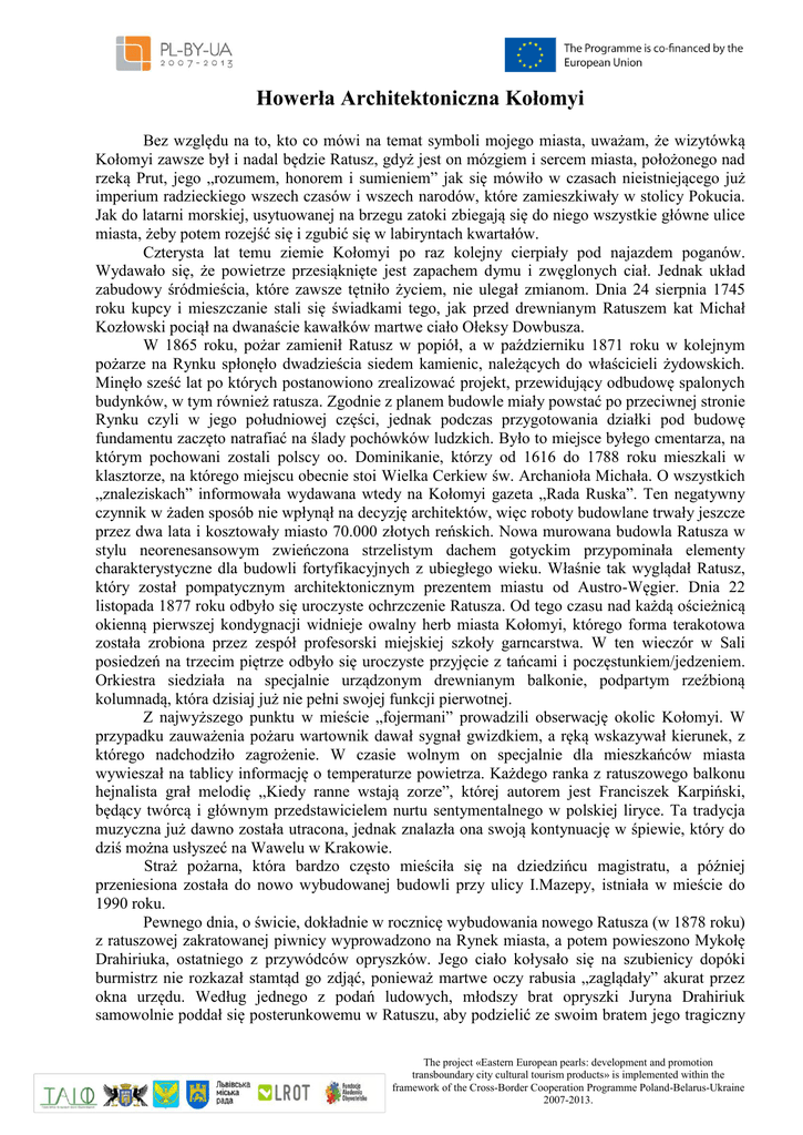 Howerła Architektoniczna Kołomyi Bez względu na to, kto co mówi na temat symboli mojego miasta, uważam, że wizytówką Kołomyi zawsze był i nadal będzie Ratusz, gdyż jest on mózgiem i sercem miasta, położonego nad rzeką Prut, jego „rozumem, honorem i sumieniem” jak się mówiło w czasach nieistniejącego już imperium radzieckiego wszech czasów i wszech narodów, które zamieszkiwały w stolicy Pokucia. Jak do latarni morskiej, usytuowanej na brzegu zatoki zbiegają się do niego wszystkie główne ulice miasta, żeby potem rozejść się i zgubić się w labiryntach kwartałów. Czterysta lat temu ziemie Kołomyi po raz kolejny cierpiały pod najazdem poganów. Wydawało się, że powietrze przesiąknięte jest zapachem dymu i zwęglonych ciał. Jednak układ zabudowy śródmieścia, które zawsze tętniło życiem, nie ulegał zmianom. Dnia 24 sierpnia 1745 roku kupcy i mieszczanie stali się świadkami tego, jak przed drewnianym Ratuszem kat Michał Kozłowski pociął na dwanaście kawałków martwe ciało Ołeksy Dowbusza. W 1865 roku, pożar zamienił Ratusz w popiół, a w październiku 1871 roku w kolejnym pożarze na Rynku spłonęło dwadzieścia siedem kamienic, należących do właścicieli żydowskich. Minęło sześć lat po których postanowiono zrealizować projekt, przewidujący odbudowę spalonych budynków, w tym również ratusza. Zgodnie z planem budowle miały powstać po przeciwnej stronie Rynku czyli w jego południowej części, jednak podczas przygotowania działki pod budowę fundamentu zaczęto natrafiać na ślady pochówków ludzkich. Było to miejsce byłego cmentarza, na którym pochowani zostali polscy oo. Dominikanie, którzy od 1616 do 1788 roku mieszkali w klasztorze, na którego miejscu obecnie stoi Wielka Cerkiew św. Archanioła Michała. O wszystkich „znaleziskach” informowała wydawana wtedy na Kołomyi gazeta „Rada Ruska”. Ten negatywny czynnik w żaden sposób nie wpłynął na decyzję architektów, więc roboty budowlane trwały jeszcze przez dwa lata i kosztowały miasto 70.000 złotych reńskich. Nowa murowana budowla Ratusza w stylu neorenesansowym zwieńczona strzelistym dachem gotyckim przypominała elementy charakterystyczne dla budowli fortyfikacyjnych z ubiegłego wieku. Właśnie tak wyglądał Ratusz, który został pompatycznym architektonicznym prezentem miastu od Austro-Węgier. Dnia 22 listopada 1877 roku odbyło się uroczyste ochrzczenie Ratusza. Od tego czasu nad każdą ościeżnicą okienną pierwszej kondygnacji widnieje owalny herb miasta Kołomyi, którego forma terakotowa została zrobiona przez zespół profesorski miejskiej szkoły garncarstwa. W ten wieczór w Sali posiedzeń na trzecim piętrze odbyło się uroczyste przyjęcie z tańcami i poczęstunkiem/jedzeniem. Orkiestra siedziała na specjalnie urządzonym drewnianym balkonie, podpartym rzeźbioną kolumnadą, która dzisiaj już nie pełni swojej funkcji pierwotnej. Z najwyższego punktu w mieście „fojermani” prowadzili obserwację okolic Kołomyi. W przypadku zauważenia pożaru wartownik dawał sygnał gwizdkiem, a ręką wskazywał kierunek, z którego nadchodziło zagrożenie. W czasie wolnym on specjalnie dla mieszkańców miasta wywieszał na tablicy informację o temperaturze powietrza. Każdego ranka z ratuszowego balkonu hejnalista grał melodię „Kiedy ranne wstają zorze”, której autorem jest Franciszek Karpiński, będący twórcą i głównym przedstawicielem nurtu sentymentalnego w polskiej liryce. Ta tradycja muzyczna już dawno została utracona, jednak znalazła ona swoją kontynuację w śpiewie, który do dziś można usłyszeć na Wawelu w Krakowie. Straż pożarna, która bardzo często mieściła się na dziedzińcu magistratu, a później przeniesiona została do nowo wybudowanej budowli przy ulicy I.Mazepy, istniała w mieście do 1990 roku. Pewnego dnia, o świcie, dokładnie w rocznicę wybudowania nowego Ratusza (w 1878 roku) z ratuszowej zakratowanej piwnicy wyprowadzono na Rynek miasta, a potem powieszono Mykołę Drahiriuka, ostatniego z przywódców opryszków. Jego ciało kołysało się na szubienicy dopóki burmistrz nie rozkazał stamtąd go zdjąć, ponieważ martwe oczy rabusia „zaglądały” akurat przez okna urzędu. Według jednego z podań ludowych, młodszy brat opryszki Juryna Drahiriuk samowolnie poddał się posterunkowemu w Ratuszu, aby podzielić ze swoim bratem jego tragiczny The project «Eastern European pearls: development and promotion transboundary city cultural tourism products» is implemented within the framework of the Cross-Border Cooperation Programme Poland-Belarus-Ukraine 2007-2013. los. Bez względu na to, że bracia nie widzieli ze sobą, Juryna wspierał Mykołę swoją grą na friłce, której dźwięki przedostawały się nawet przez grube mury. Gmach Ratusza jest swoistym zabytkiem i pomnikiem, ponieważ z lewej strony, na wysokości jego drugiej kondygnacji znajduje się tablica pamiątkowa upamiętniająca Arcyksięcia Karola I Habsburga (17. 08. 1887-1. 05. 1922) – ostatniego cesarza Austro-Węgier, króla Węgier, Galicji i Lodomerii, który w marcu 1912 roku w stopniu majora został skierowany do naszego miasta w celu pełnienia służby w 7. pułku kawalerii. Historyczny fakt tryumfalnego powitania eskorty przyszłego następcy tronu pod ścianami magistratu Kołomyi został upamiętniony na zdjęciu wykonanym przez nieznanego autora. Nieco później lokalne i europejskie wydawnictwa wydały pocztówkę z portretami Karola i Zyty de Bourbon-Parma von Habsburg (1892-1989). W kwietniu tego samego roku w tym samym miejscu witano już arcyksiężną Zytę, która przyjechała do swojego męża. Wtedy jeszcze nikt nie wiedział, że niedługo zostanie on cesarzem, że niedługo jego słynna rodzina zostanie rzucona do wiru wydarzeń, a pamiątkowa tablica zniknie z wieży bez śladu... Z ideologicznych względów przywódcy radzieccy ukryli przed wśc