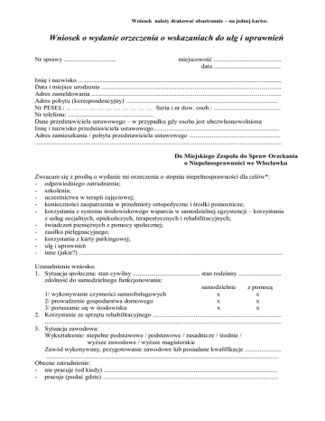 Wniosek należy drukować obustronnie – na jednej kartce. Wniosek o wydanie orzeczenia o wskazaniach do ulg i uprawnień Nr sprawy ................................ miejscowość ......................................... data ......................................... Imię i nazwisko ............................................................................................................................ Data i miejsce urodzenia .............................................................................................................. Adres zameldowania .................................................................................................................... Adres pobytu (korespondencyjny) ............................................................................................. Nr PESEL: ... … … … … … … … … … … Seria i nr dow. osob.: ......................................... Nr telefonu: .................................................... Dane przedstawiciela ustawowego – w przypadku gdy osoba jest ubezwłasnowolniona Imię i nazwisko przedstawiciela ustawowego............................................................................. Adres zamieszkania / pobytu przedstawiciela ustawowego ........................................................ ....................................................................................................................................................... Do Miejskiego Zespołu do Spraw Orzekania o Niepełnosprawności we Włocławku Zwracam się z prośbą o wydanie mi orzeczenia o stopniu niepełnosprawności dla celów*: - odpowiedniego zatrudnienia; - szkolenia; - uczestnictwa w terapii zajęciowej; - konieczności zaopatrzenia w przedmioty ortopedyczne i środki pomocnicze; - korzystania z systemu środowiskowego wsparcia w samodzielnej egzystencji – korzystania z usług socjalnych, opiekuńczych, terapeutycznych i rehabilitacyjnych; - świadczeń pieniężnych z pomocy społecznej; - zasiłku pielęgnacyjnego; - korzystania z karty parkingowej; - ulg i uprawnień - inne (jakie?) ............................................................................................................................ Uzasadnienie wniosku: 1. Sytuacja społeczna: stan cywilny ......................................... stan rodzinny .......................... zdolność do samodzielnego funkcjonowania: samodzielnie z pomocą 1/ wykonywanie czynności samoobsługowych x x 2/ prowadzenie gospodarstwa domowego x x 3/ poruszanie się w środowisku x x 2. Korzystanie ze sprzętu rehabilitacyjnego ............................................................................... ................................................................................................................................................. 3. Sytuacja zawodowa: Wykształcenie: niepełne podstawowe / podstawowe / zasadnicze / średnie / wyższe zawodowe / wyższe magisterskie Zawód wykonywany, przygotowanie zawodowe lub posiadane kwalifikacje ...................... .............................................................................................................................................. Obecne zatrudnienie: - nie pracuje (od kiedy) .......................................................................................................... - pracuje (podać gdzie) ........................................................................................................... Oświadczam, że: 1. Zostałem/am poinformowany/a, że orzeczenie o wskazaniach do ulg i uprawnień zostanie wydane na podstawie posiadanego orzeczenia o inwalidztwie lub niezdolności do pracy, w związku z powyższym stopień niepełnosprawności zostanie określony zgodnie z art. 5 lub 62 ustawy z dnia 27 sierpnia 1997r. o rehabilitacji zawodowej i społecznej oraz zatrudnianiu osób niepełnosprawnych (Dz. U. 123, poz. 776 z późn. zm.) 2. Zostałem poinformowany, że od orzeczenia o wskazaniach do ulg i uprawnień nie przysługuje odwołanie od decyzji lekarza – członka zespołu. 3. Posiadam ważne orzeczenie wydane w dniu …………………………. przez (nazwa organu) …………………………………………………………………………………………ze skutkiem (podać grupę) ………………………………….wydane na okres do …………………………….. 4. Składałem (nie składałem)* uprzednio wniosek o ustalenie stopnia niepełnosprawności: kiedy……………………… z jakim skutkiem (podać stopień niepełnosprawności) ……………………………. Okres do ………………………………….. / na stałe, orzeczenie nr ………………………….. wydane przez Powiatowy / Miejski / Wojewódzki* Zespół ds. Orzekania o Niepełnosprawności w ………………………………………………………………. 5. W razie stwierdzonej przez zespół orzekający konieczności wykonania badań dodatkowych, konsultacji specjalistycznych lub obserwacji szpitalnych uzupełniających złożone zaświadczenie o stanie zdrowia wydane przez lekarza nie będącego lekarzem ubezpieczenia zdrowotnego, jestem świadomy wymogu ponoszenia ich kosztów we własnym zakresie. OŚWIADCZAM, ŻE DANE ZAWARTE WE WNIOSKU SĄ ZGODNE ZE STANEM FAKTYCZNYM I JESTEM ŚWIADOMY /A ODPOWIEDZIALNOŚCI ZA ZEZNANIE NIEPRAWDY LUB ZATAJENIE PRAWDY. W załączeniu do wniosku przedkładam: 1. zaświadczenie o stanie zdrowia wydane przez lekarza leczącego, w ciągu miesiąca poprzedzającego złożenie wniosku; 2. posiadaną dokumentację medyczną; 3. inne dokumenty, podać jakie ............................................................................................................................................ ............................................................................................................................................ ...........................................................